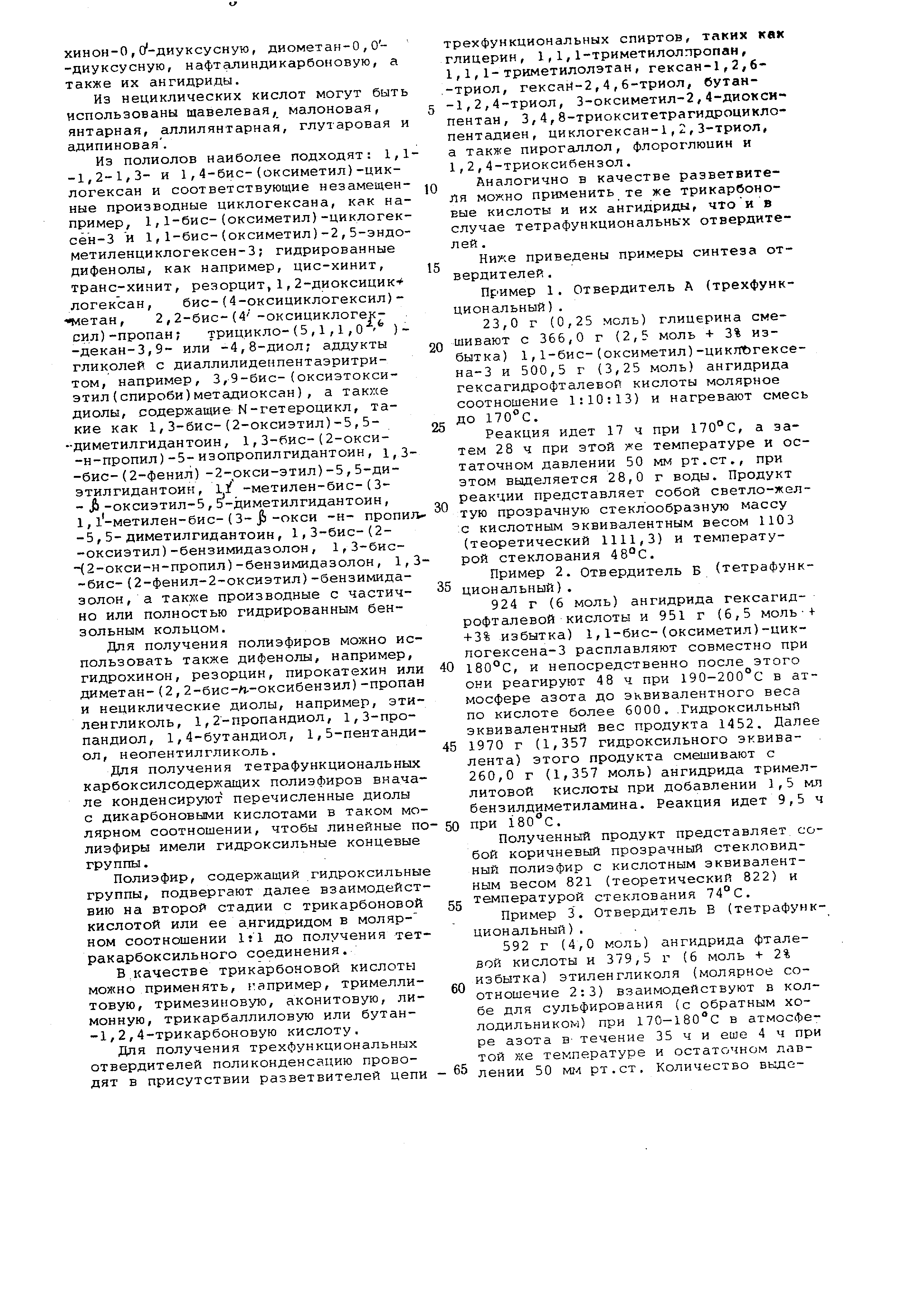 Полиэфиры, применяемые в качестве отверждающих компонентов, с молекулярным весом 600-6000 и 2-30-ю струтурными элементами получают известными методами путем поликонденсации полиолов с поликарбоновыми кислотами, причем компоненты должны быть выбраны так, чтобы либо полиолы, либо кислоты , либо оба компонента содержали один или несколько циклов и чтобы алифатические цепи, имеющиеся в структурном элементе, не были слишком длинными . Так, дикарбоновая кислота более чем с 3-мя метиленовыми группами в молекуле подходит лишь в том случае, если диол.имеет в своем составе циклы, например, адипиновая кислота и бис- (4-оксициклогексил)-метан или 1,1-бис- (оксиметил)-циклогексен-3.