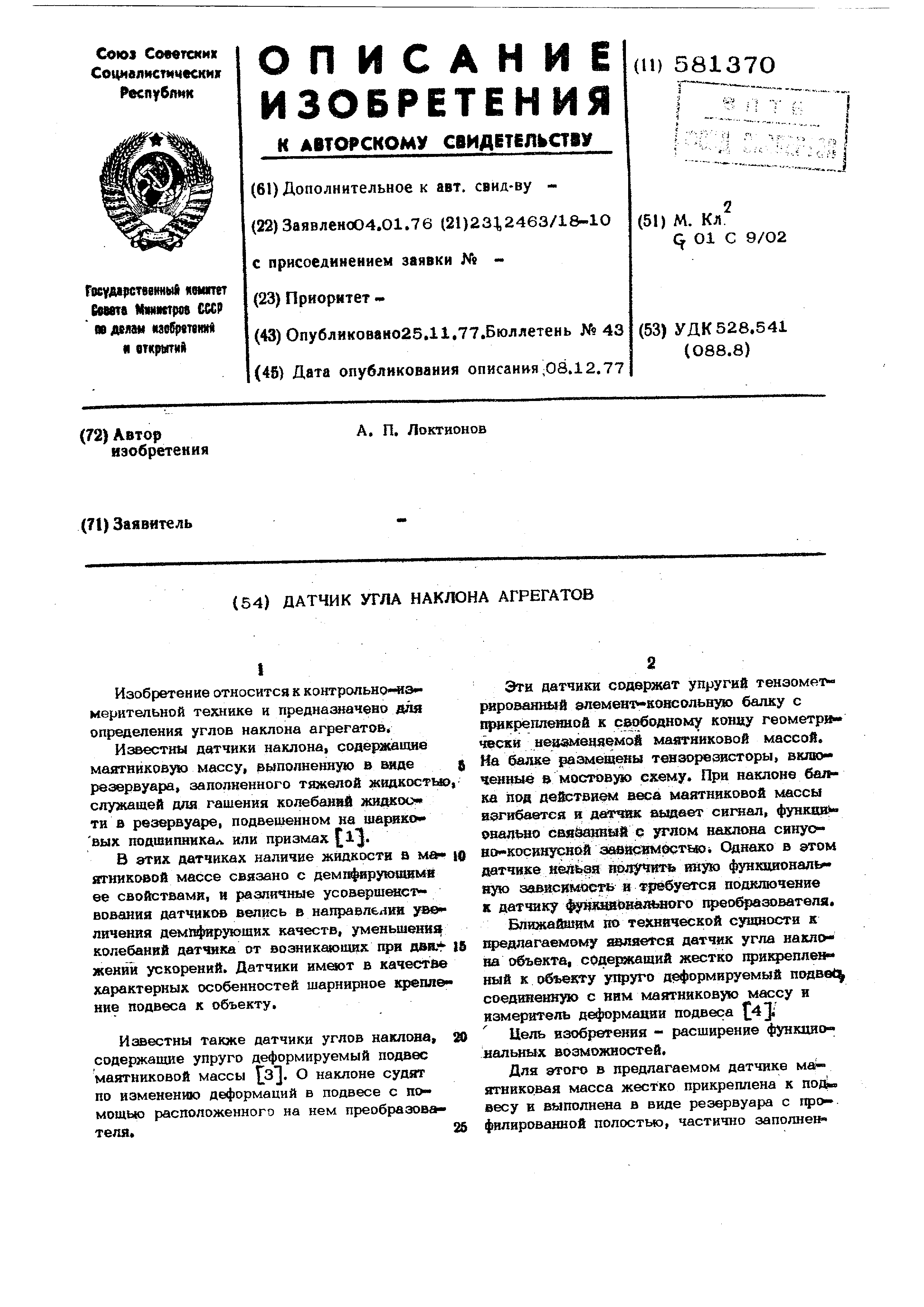 мерительной технике и предназначено дм определения углов наклона агрегатов, И:жестны датчики наклона, содержаише маятников массу, в{ полненнук в вяде резервуара, заполненного тяжелой жидкостъ« служащей ддя гашения колебаний жидксх «