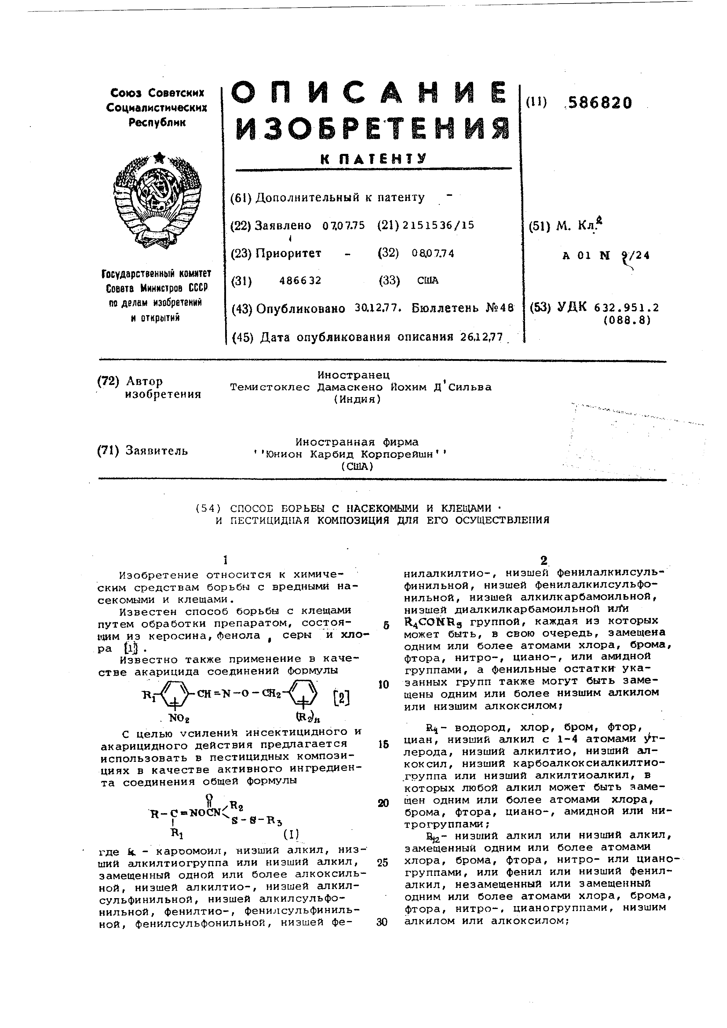 (54) СПОСОЕ БОРЬБЫ С НАСЕКОМЫМИ И КЛЕЩАМИ И ПЕСТИЦИДПАЯ КОМПОЗИЦИЯ ДЛЯ ЕГО ОСУЩЕСТВЛЕНИЯ Rj- алкил, алкенил, циклоалкил,