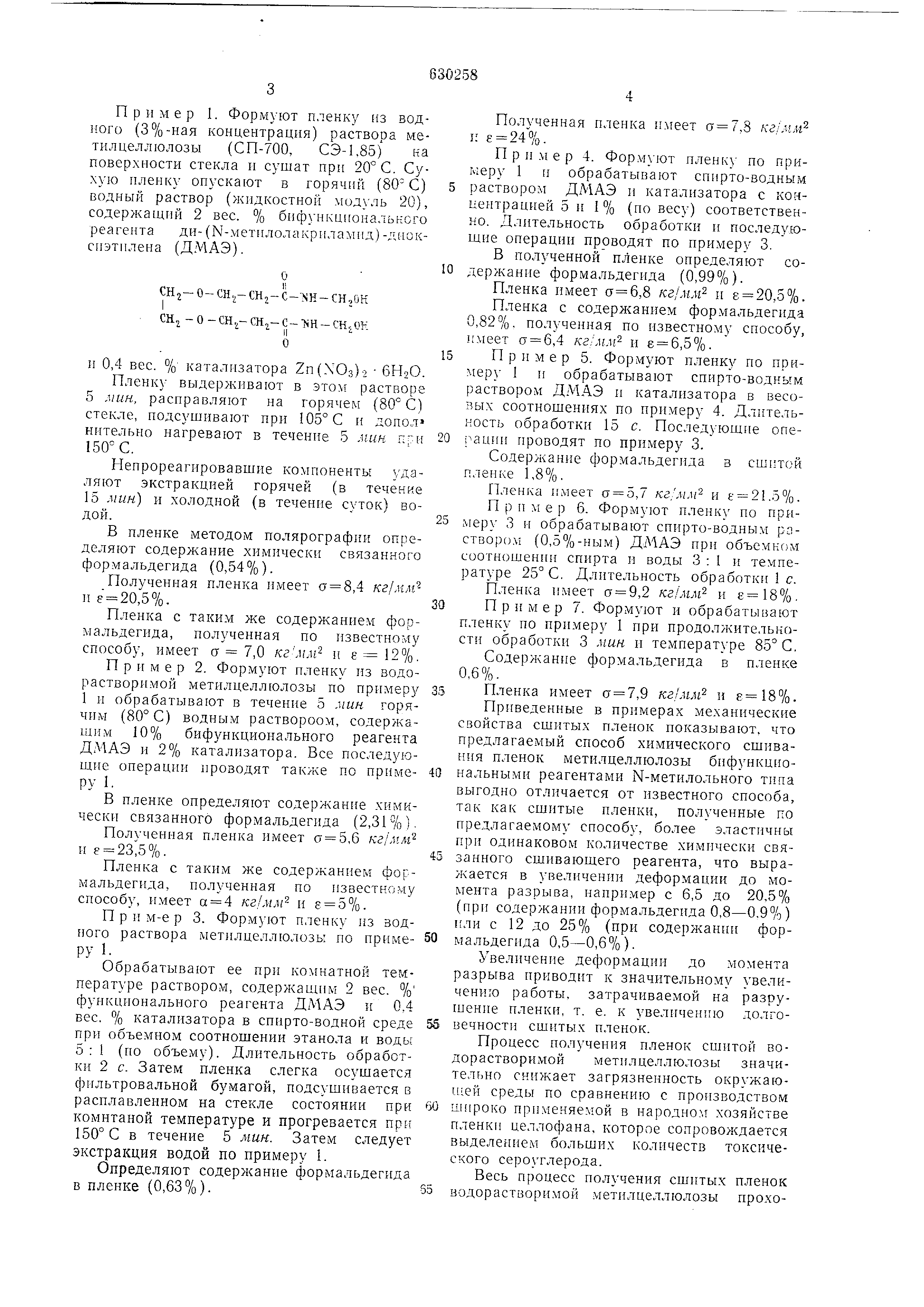 Пример 1. Формуют пленку из водного (3%-ная концентрация) раствора метилцеллюлозы