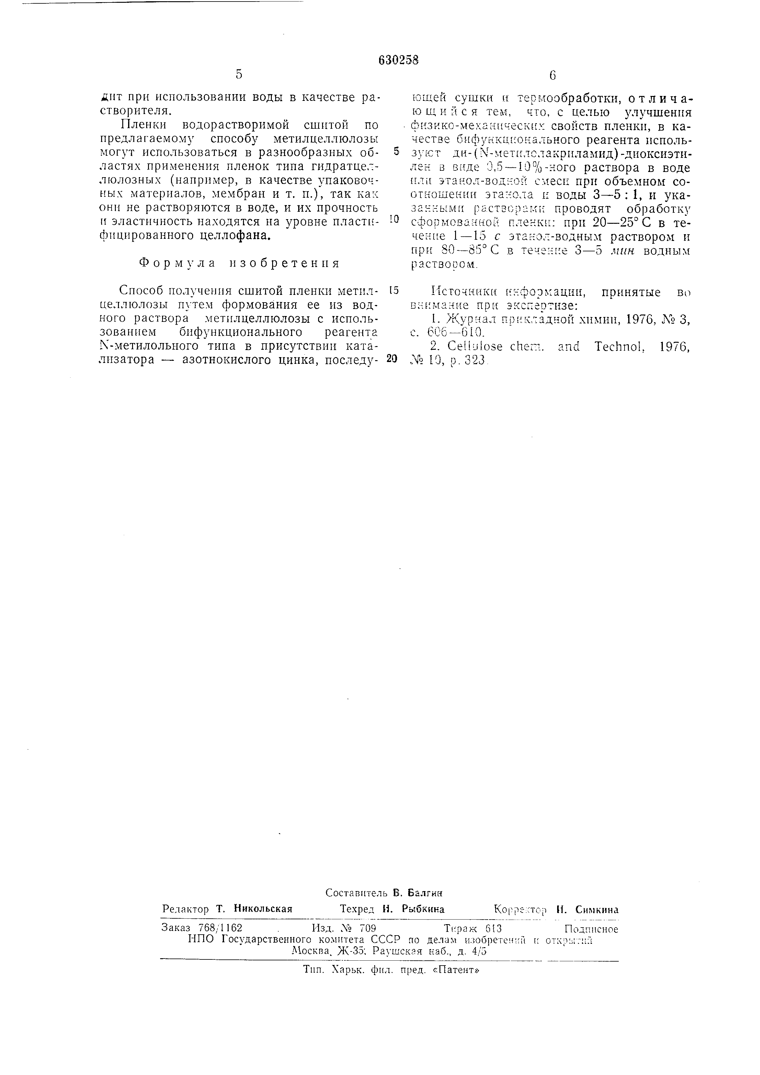 целлофана. Ф о р м } л а изобретения Способ получения сшитой пленки метилцеллюлозы путем формования ее из водного
