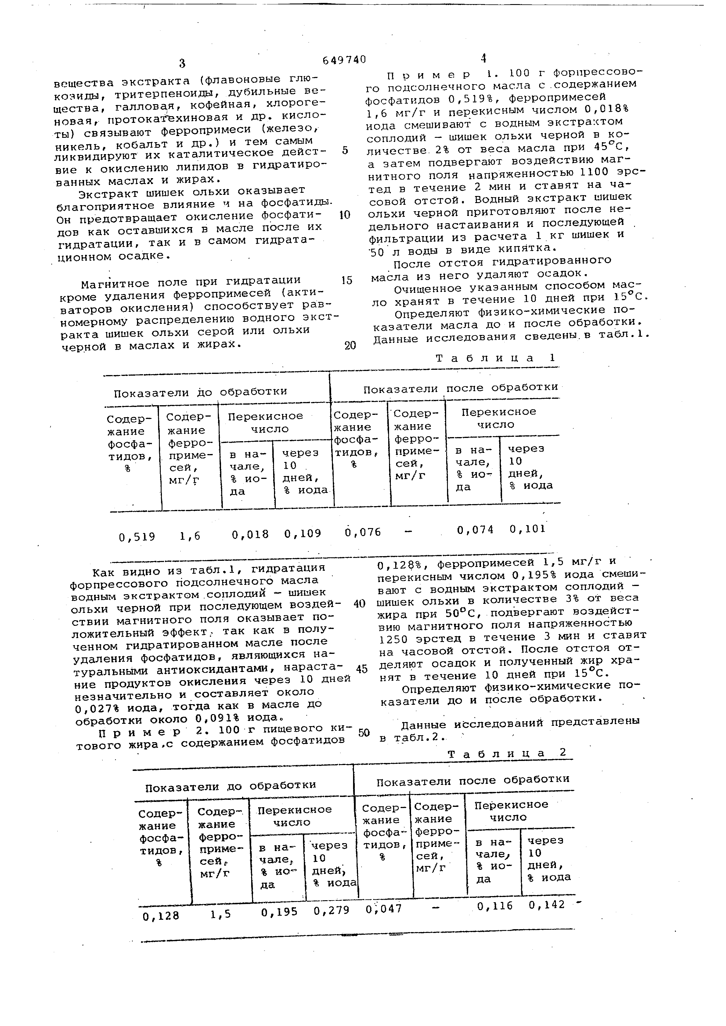 0,027% иода, тогда как в масле до обработки около 0,091% иода Пример 2. 100 г пищевого китового жира.с содержанием фосфатидов 1,50,195 0,279 0,047 0,128 0,074 0,101 0,128%, ферропримесей 1,5 мг/г и