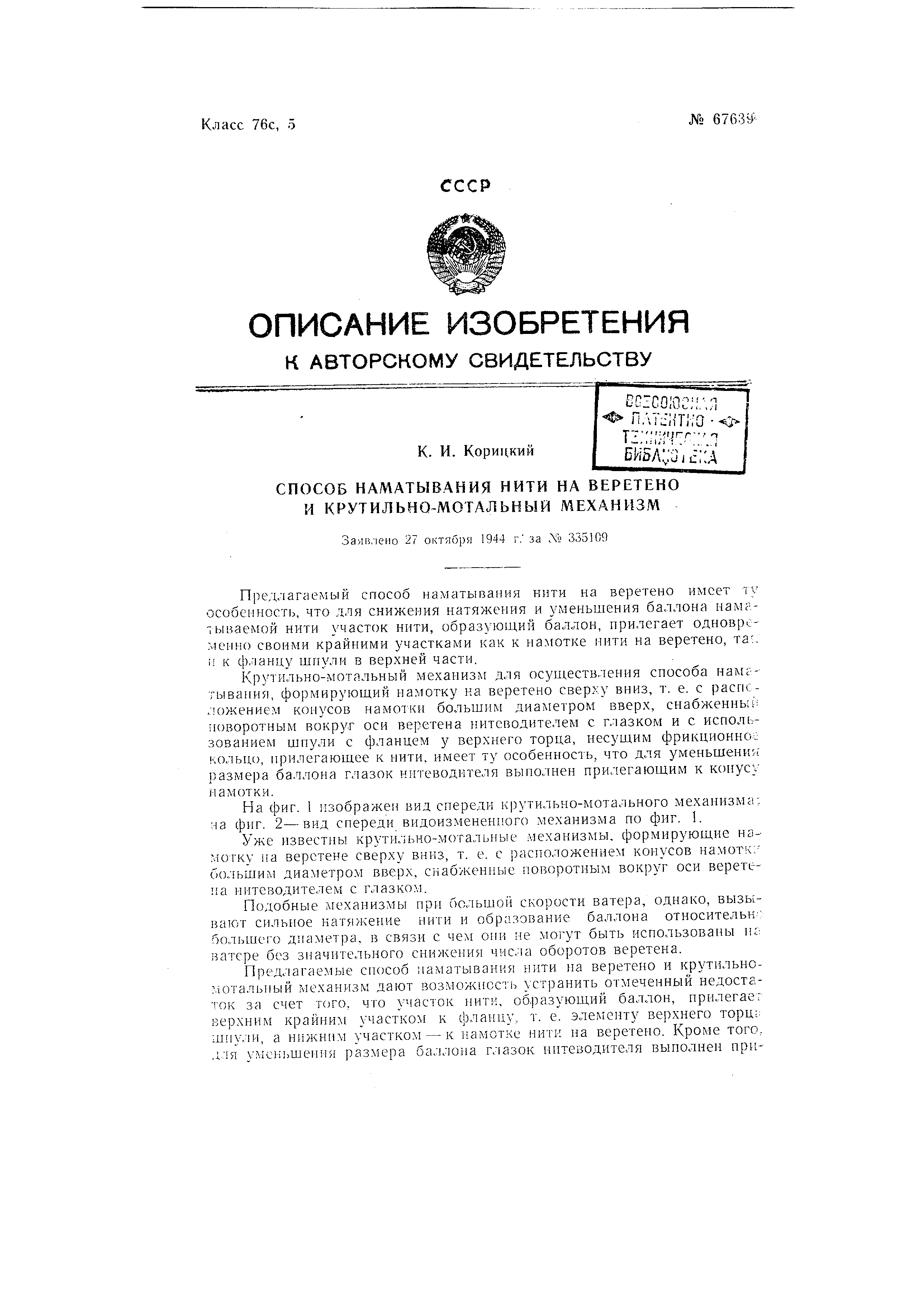 летающим к концу намотки. для основных прядильных и крутильных ватеров (фиг. 1) имеет основное веретено У с деревянной