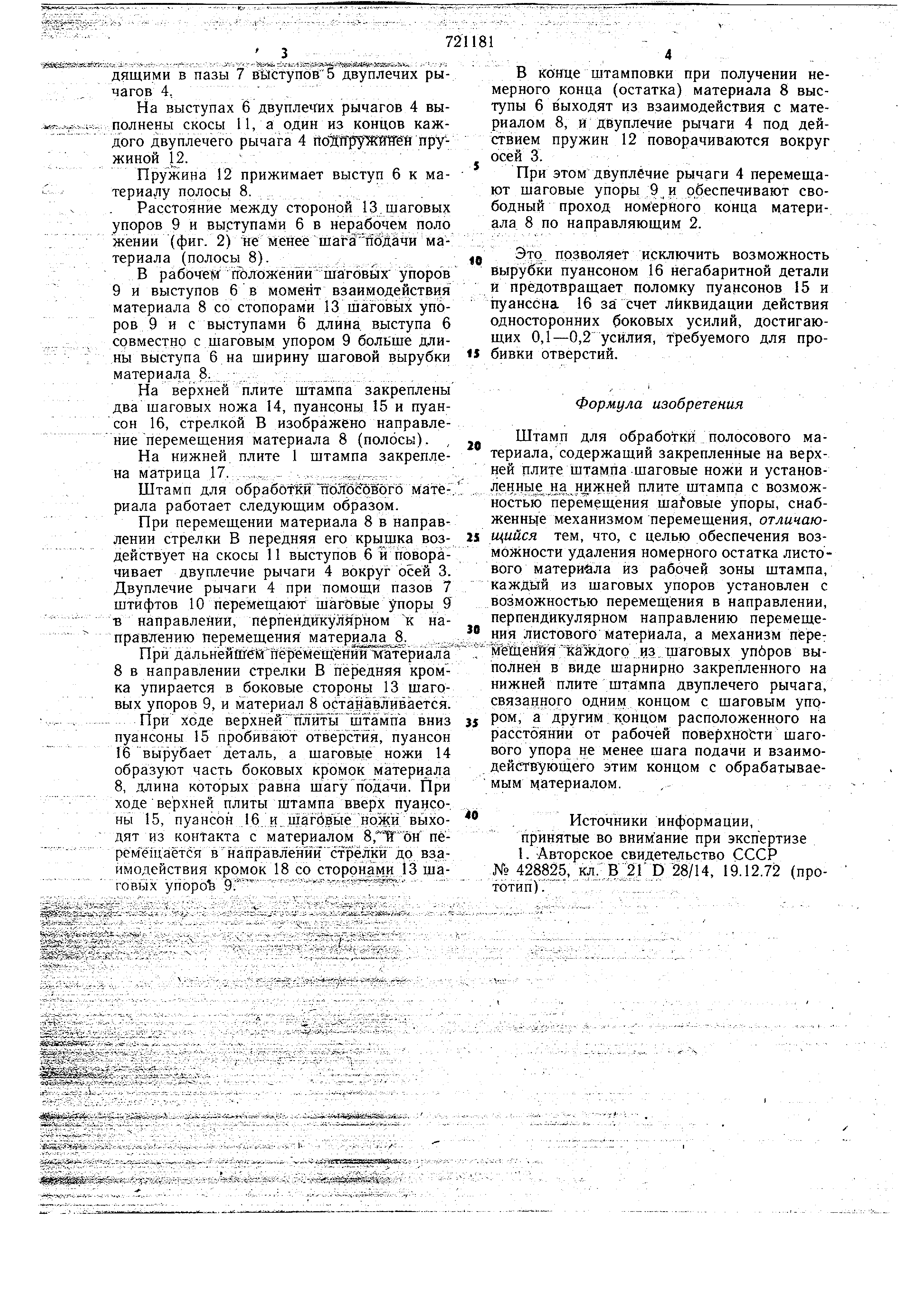 материала из рабочей зоны штампа без шаговых врубок. Это достигается тем, что в предлагаемой конструкции каждый из шаговых, упоров