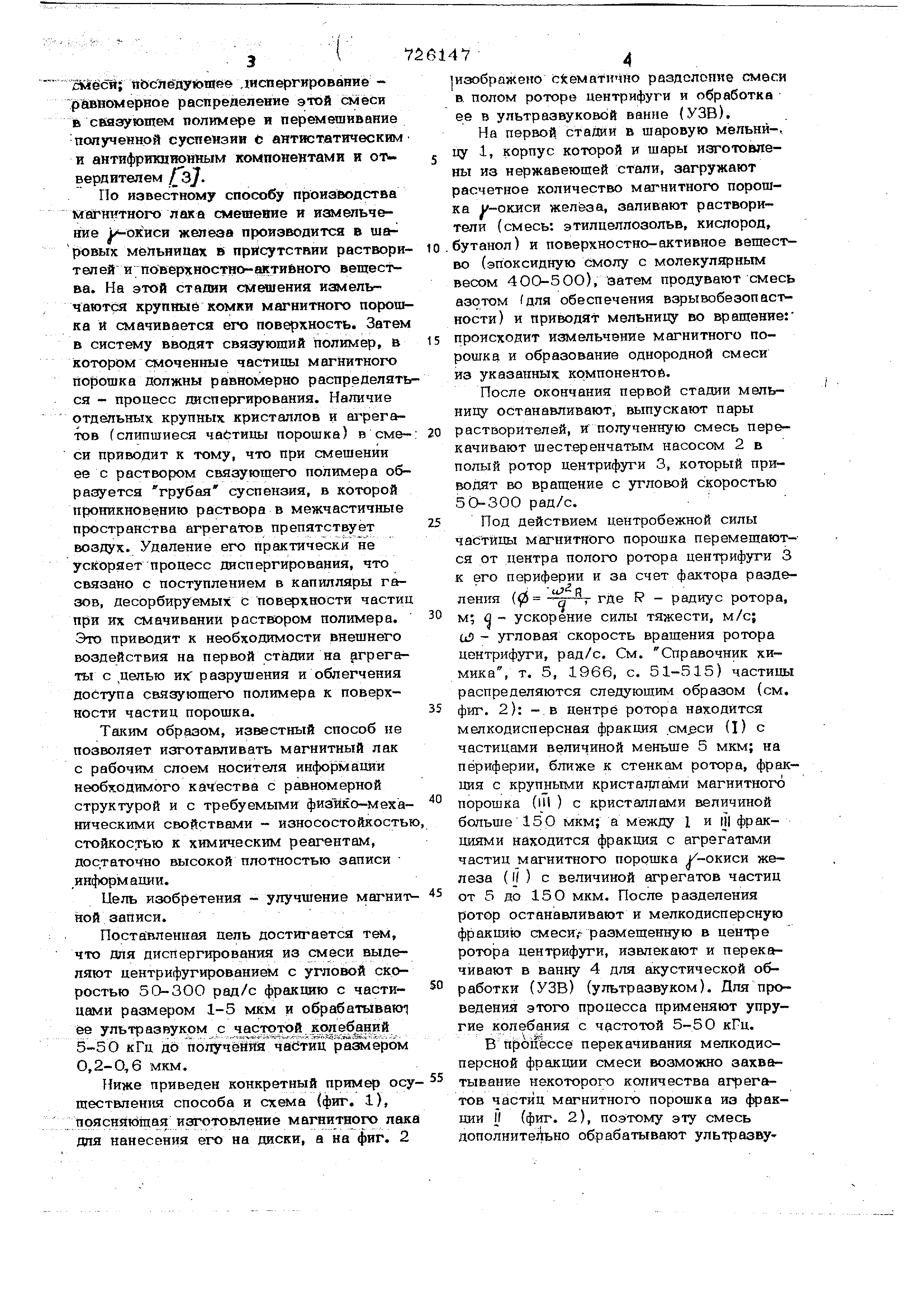прясняюпхая изготовление магнитного лак для нанесения его на диски, а на фиг. 2 1изображено Схематично разделение смеси в. полом роторе центрифуги и обработка