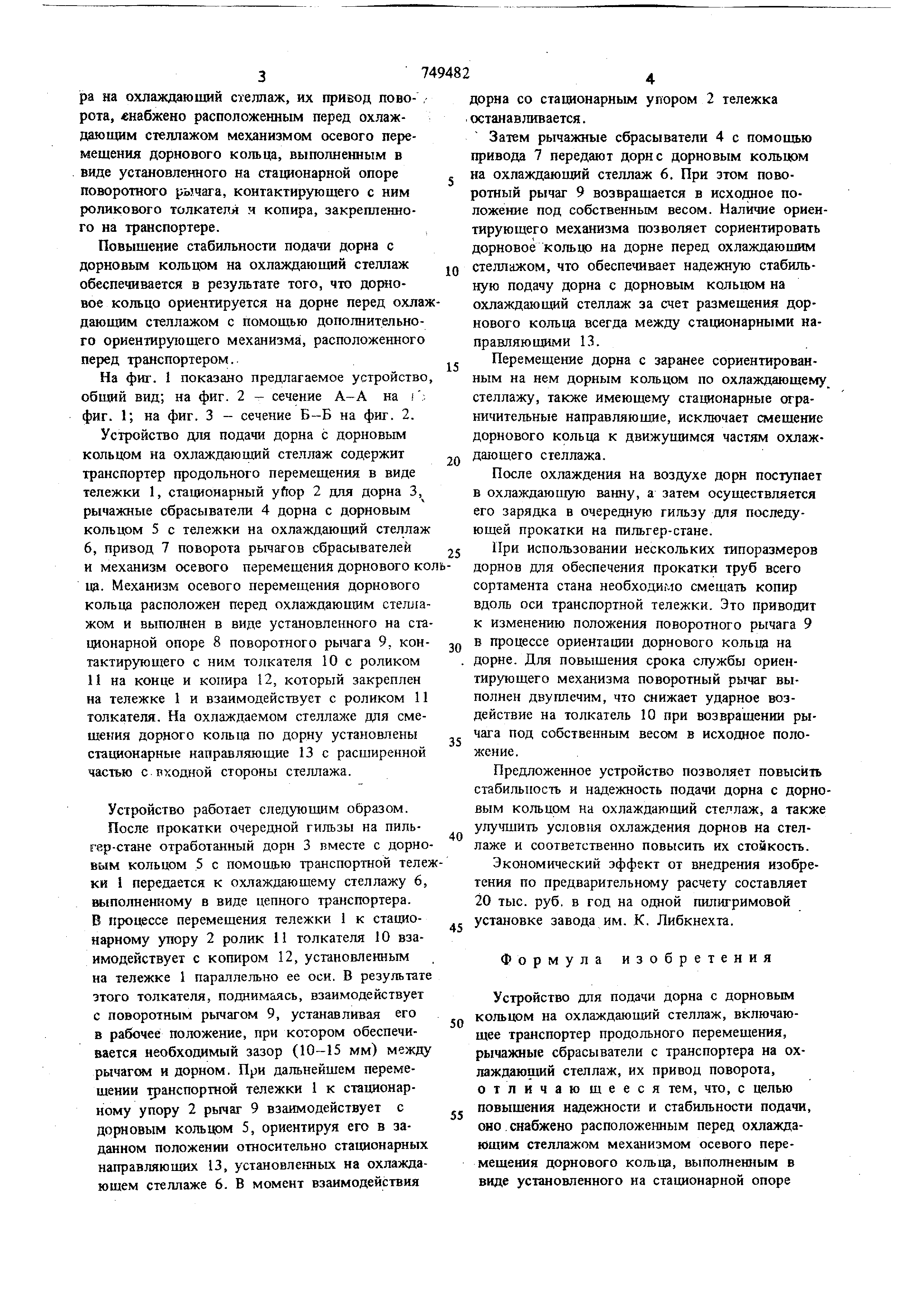 со стороны входа частью, обеспечивающей смещение кольца на дорне 2. Недостатком известного устройства является нестабильность подачи дорна с дорновым кольНА ОХЛАЖДАЮЩИЙ СТЕЛЛАЖ дом на охлаждающий стеллаж, представляющий