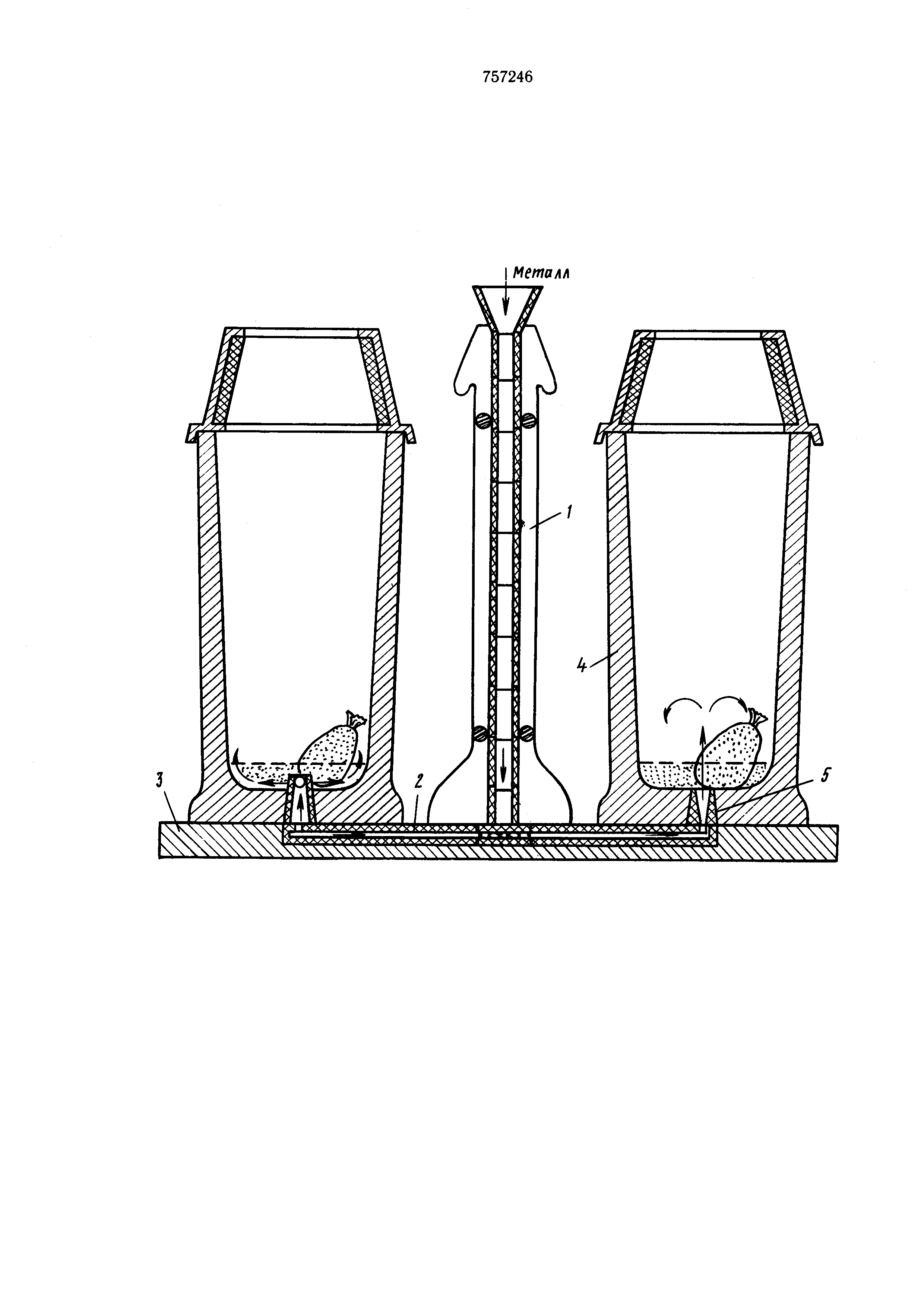 Изобретение относится к области черной металлургии, точнее к разливке стали сифонным способом в глуходонные изложницы, особенно под слоем шлака или других материалов. Известно устройство устройство для сифонной разливки стали, имеющее центровую, поддон, распределительную звездочку, литниковую систему, диффузорный стаканчик для изложницы, изложницу. Устройство работает по принципу сообщающихся сосудов: металл из ковша через сталеразливочный ковшевой стакан заливается в центровую специально набранного поддона, через распределительную звездочку металл разводится по литниковой системе и через диффузорный стаканчик попадает в полость изложницы вертикально-направленной струей. При разливке стали под шлакообразующими или теплоизолирующими смесями перед разливкой на дно каждой изложницы засыпается или забрасывается в мешках смесь определенного состава [1]. Однако использование этого устройства для разливки стали с применением шлакообразующих или теплоизолирующих смесей имеет ряд существенных недостатков. При применении в существующем устройстве диффузорного, несколько расширяющегося вверх стаканчика в изложнице струя металла истекает в полость изложницы вертикально вверх или с некоторым отклонением от вертикали в сторону, противоположную центровой. Причем высота подъема струи в начале разливки может достигать десяти диаметров стаканчика, из которого она истекает. Струя жидкой стали, раскрываясь в верхней точке, как веером покрывает шлаковую смесь, отгоняет ее к стенкам изложницы, где несформировавшийся шлак замораживается в корковой зоне слитка. Это резко ухудшает качество поверхности донной части слитка и проката, ведет к дополнительной обрези и снижению выхода годного металла, увеличению доли зачистки проката После разливки происходит усадка металла в литниках и стаканчике, и поэтому возможно образование дефектов макроструктуры в донной части слитка. Кроме того, при забрасывании мешков или засыпке смеси возможно перекрытие выходного отверстия стаканчика. Цель изобретения - обеспечение высокого качества поверхности донной части слитка за счет предотвращения фонтанирования струи в изложнице. Это достигается тем, что стаканчик изложницы выполнен с обратной конусностью выступающим в полость изложницы, с закрытой верхней частью и отверстиями на боковой поверхности, при этом суммарная площадь сечения отверстий равна 1,2-4 площадям поперечного сечения канала литниковой системы, а высота выступающей части стаканчика равна 1,4-2,0 диаметрам боковых отверстий, количество отверстий на боковой поверхности стаканчика 2-6 и выполнены под углом 5-15°. На чертеже показано устройство для сифонной разливки стали. Оно содержит центровую 1, сообщающуюся с сифонными проводками 2, установленными в поддоне 3, на котором имеются изложницы 4. В днище изложницы 4 установлен стаканчик 5. Разливка стали ведется не вертикально-истекающей струей в изложнице, а несколькими горизонтально-направленными струями, причем струи истекают практически на уровне дна изложницы. При этом истекающие струи подтекают под смесь, а не покрывают ее сверху. Полностью устраняется фонтанирование метала и уже с 3-5 с от начала разливки ведется затопленной струей, поэтому отсутствует затягивание частиц несформировавшегося шлака к стенкам изложниц