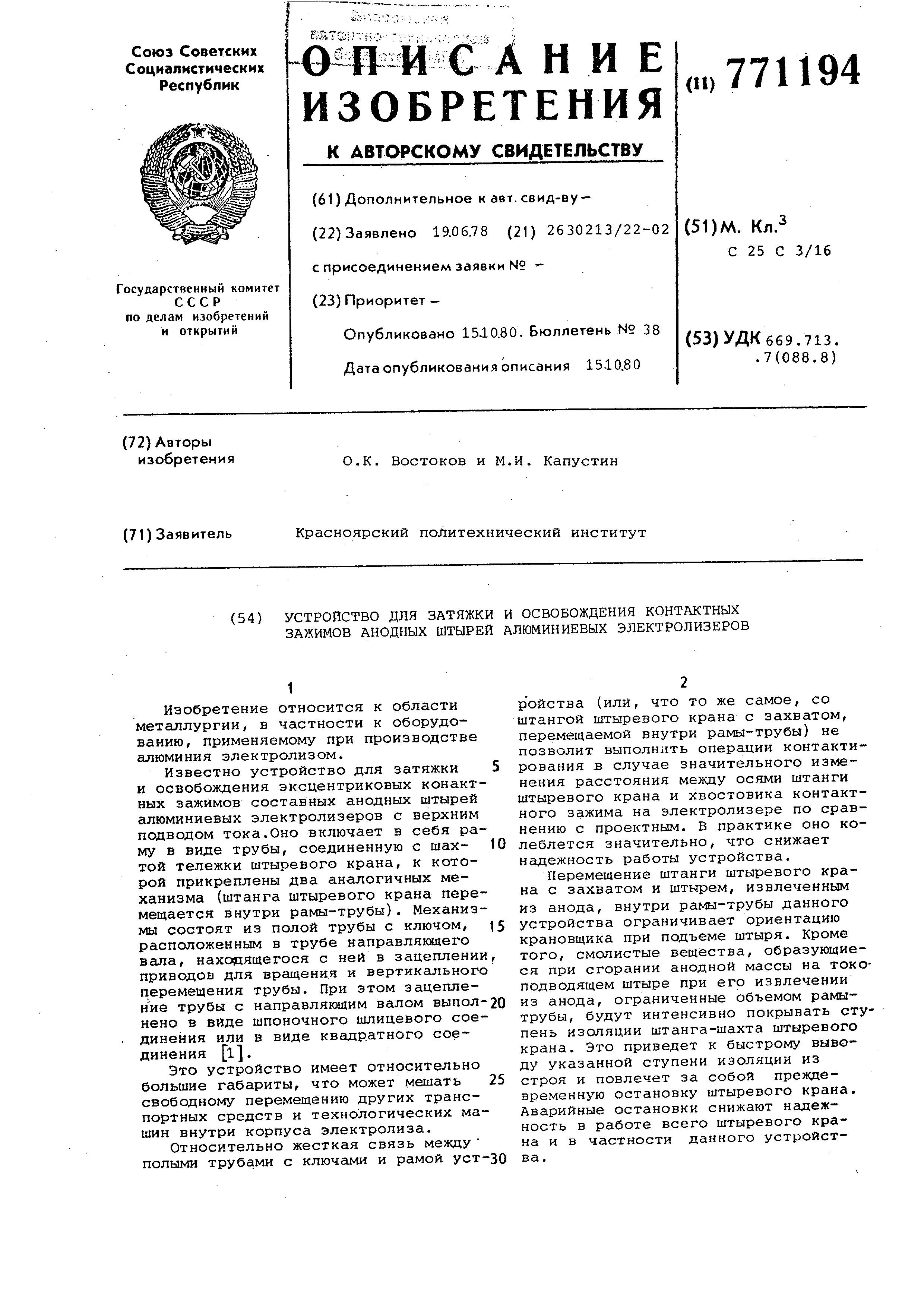средств и технологических машин внутри корпуса электролиза. Относительно жесткая связь между полыми трубами с ключами и рамой уст-30 ройства (или, что то же самое, со штангой штыревого крана с захватом,