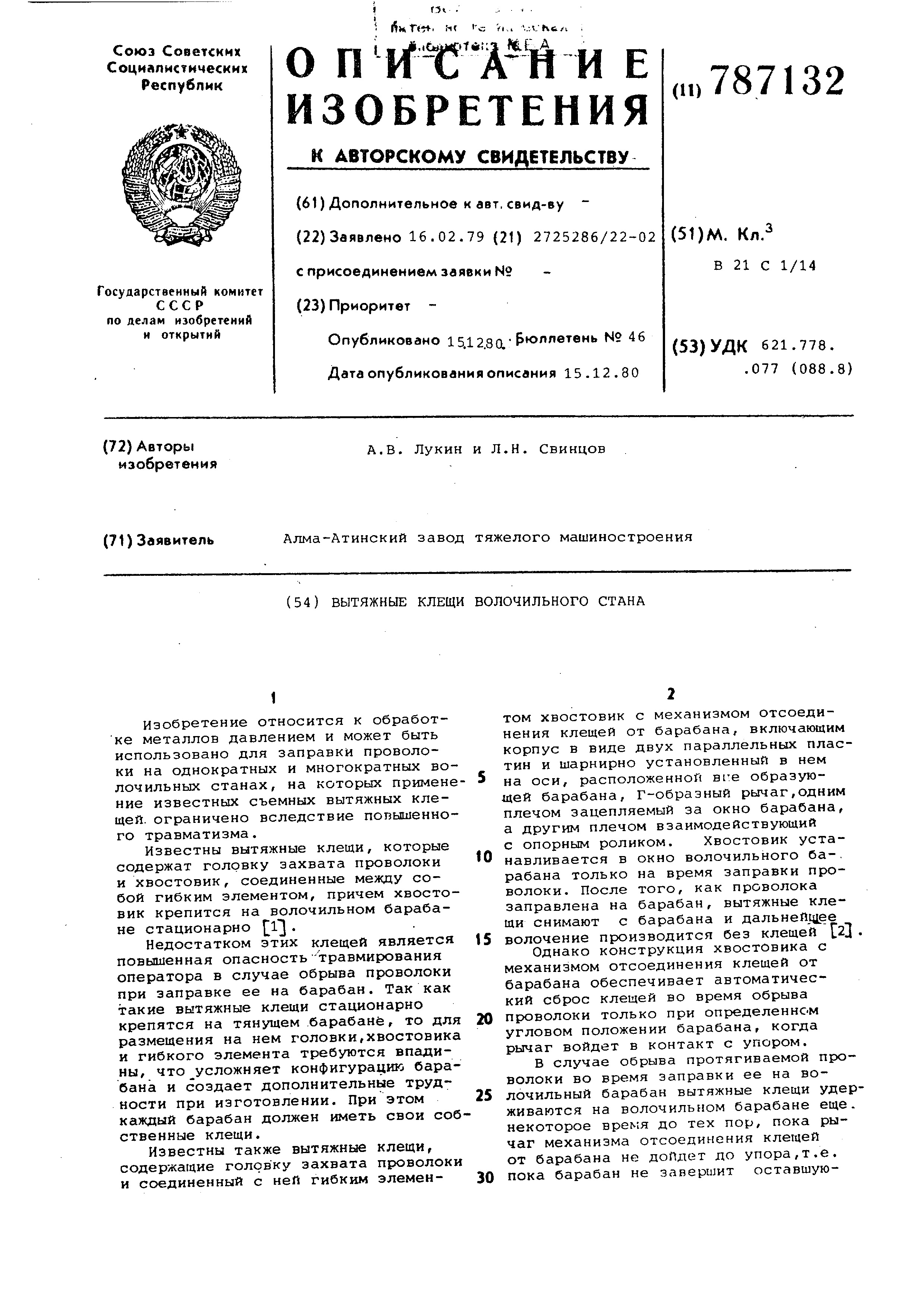 барабанных волочильных станов при заправке проволоки на барабан, так как вытяжные клещи автоматически