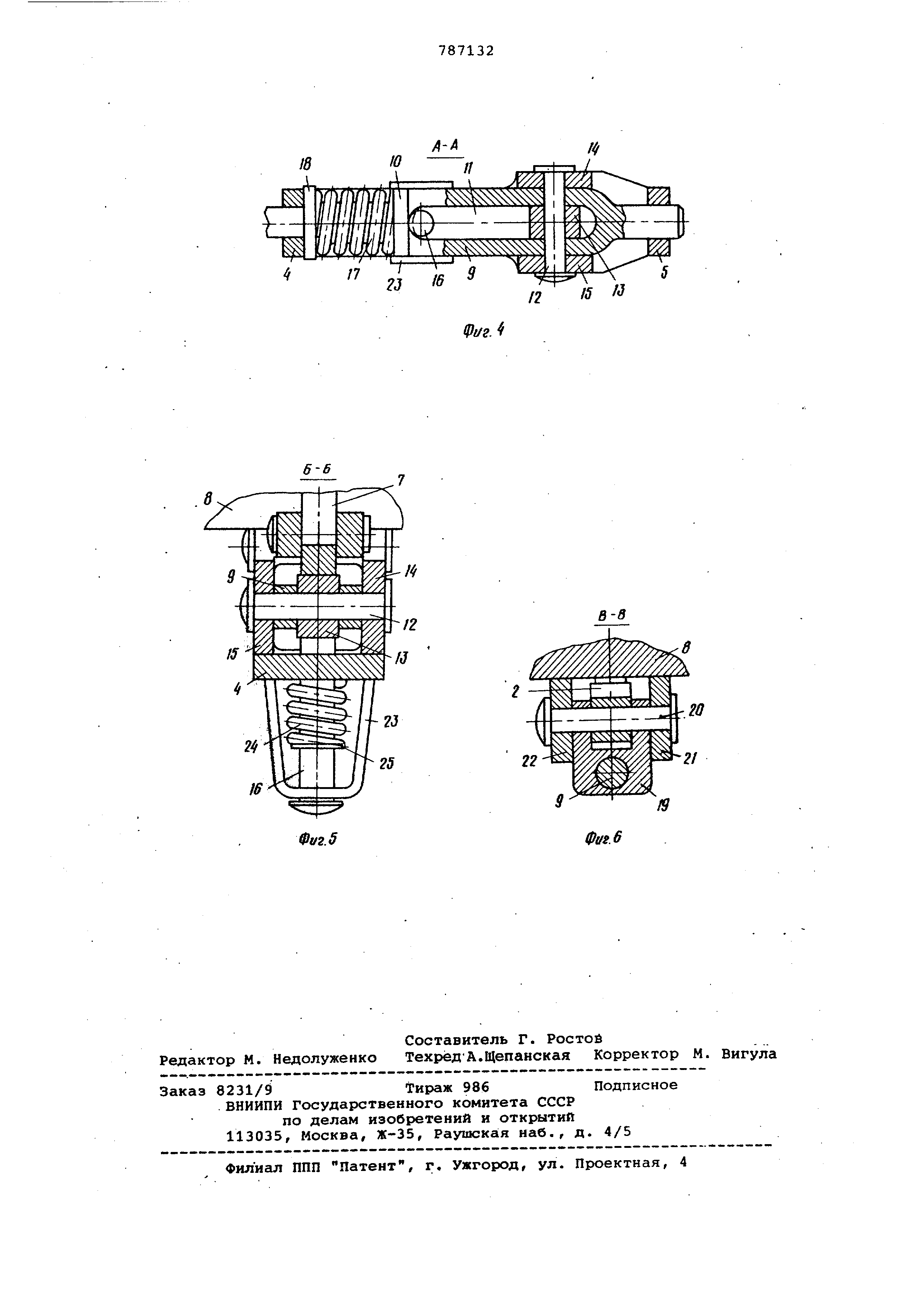 Фиксатор 16 шарнирно установлен в корпусе 4 и скобе 23 (фиг. 3, 4 и