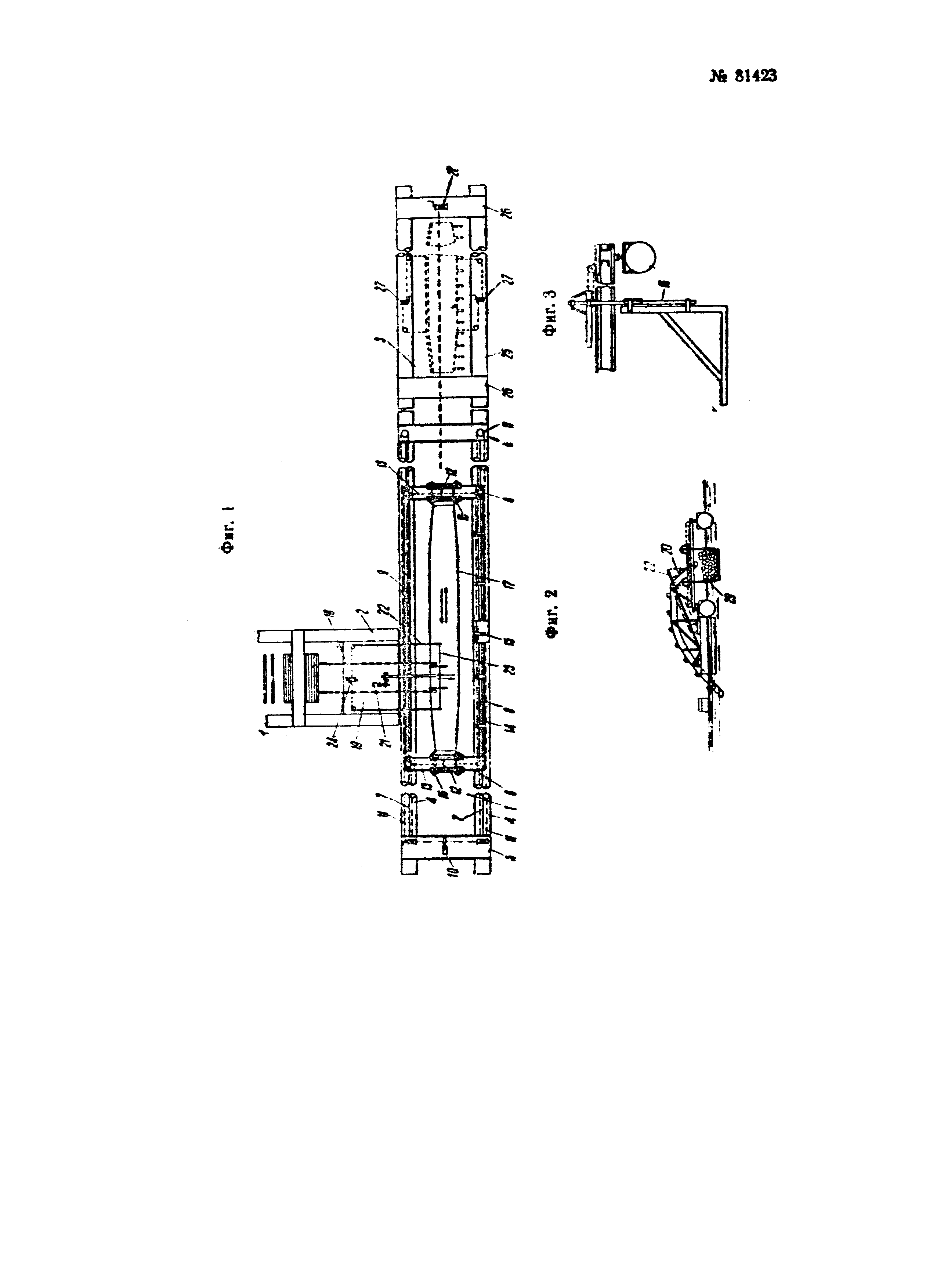 Предметом изобретения является сплоточная машина для сплотки бревен в плоты типа «Морская сигара». Особенностью предлагаемой машины является то, что в ней подача бревен из воды производится непрерывно при помощи спаренного подъемно-опускного элеватора, а люлька, в которую укладываются бревна, имеет перемещение в продольном и поперечном направлениях. Кроме того машина имеет специальный упаковочный коридор. В известных машинах подобного типа люльки имеют только продольное перемещение. На фиг. 1 показан вид сверху машины для сплотки плотов типа «Морская сигара»; на фиг. 2 - вид сбоку на элеватор; на фиг. 3 - схема крепления люльки к стойке. Машина для сплотки плотов состоит из сплоточного коридора 1, поперечного элеватора 2 и упаковочного коридора 3. Сплоточный коридор 1 образован двумя параллельными ветвями пловучих оснований 4, состоящих из металлических бонов и соединенных в концах передним 5 и задним 6 мостами. По пловучим основаниям проложены одиночные рельсовые пути 7, на которых установлены подвижные мосты 8 на бегунках. Подвижные мосты связаны между собой швеллерными балками 9, средняя часть которых поддерживается бегунками. Пролет между подвижными мостами 8 задается по максимальной длине пучка или сигары. Передвижные мосты перемещаются вдоль сплоточного коридора при помощи электромотора 10 и тросового привода 11. На подвижных мостах 8 на рельсовых путях установлены тележки 12. Тележки 12 перемещаются вдоль подвижных мостов 8 при помощи цепных передач 13, вала 14 и электромотора 15, установленных на балках, связывающих подвижные мосты. В бортах тележки 12 установлены вертикальные стойки 16, при помощи которых осуществляется закрепление к тележкам люльки 17, в которую производится погрузка. Движением подвижных мостов 8 и тележек 12 люлька 17 свободно перемещается как вдоль, так и поперек сплоточного коридора. Поперечный элеватор 2 состоит из двух параллельных ветвей, подъемных цепей 18 с крюками, установленных на металлическом понтоне 19, и спускного элеватора 20. Подъемный и спускной элеваторы приводятся в действие электромотором 21. Спускной элеватор 20 подвешен к раме, состоящей из консольных балок 22 и поперечной балки 23. Положение спускного элеватора по высоте регулируется натяжением или стравливанием тросов ручной лебедкой 24. При транспортировании машины поперечный элеватор 2 может быть отсоединен от сплоточного коридора 1. Упаковочный коридор состоит из двух ветвей пловучих оснований 25, связанных по концам мостами 26. На пловучих основаниях установлены ручные лебедки 27, при помощи которых осуществляется освобождение люльки от пучка. На заднем мосту установлена ручная лебедка 28, при помощи которой производится подача люлек в сплоточный коридор и вывод пучков из него. Процесс сплотки пучков протекает следующим порядком. Свободная люлька подается в сплоточный коридор, устанавливается между подвижными мостами и закрепляется стойками тележек 12, после чего устанавливается под спускной элеватор. Особенностью кострукции люльки является наличие холостых концов для закрепления ее стойками 16 и разъемных по высоте стоек 29 с шарнирным соединением их. Спускной элеватор устанавливается в крайнее нижнее положение. Бревна на подъемный элеватор подаются беспрерывной поперечной щетью. По мере укладки бревен люлька перемещается в про