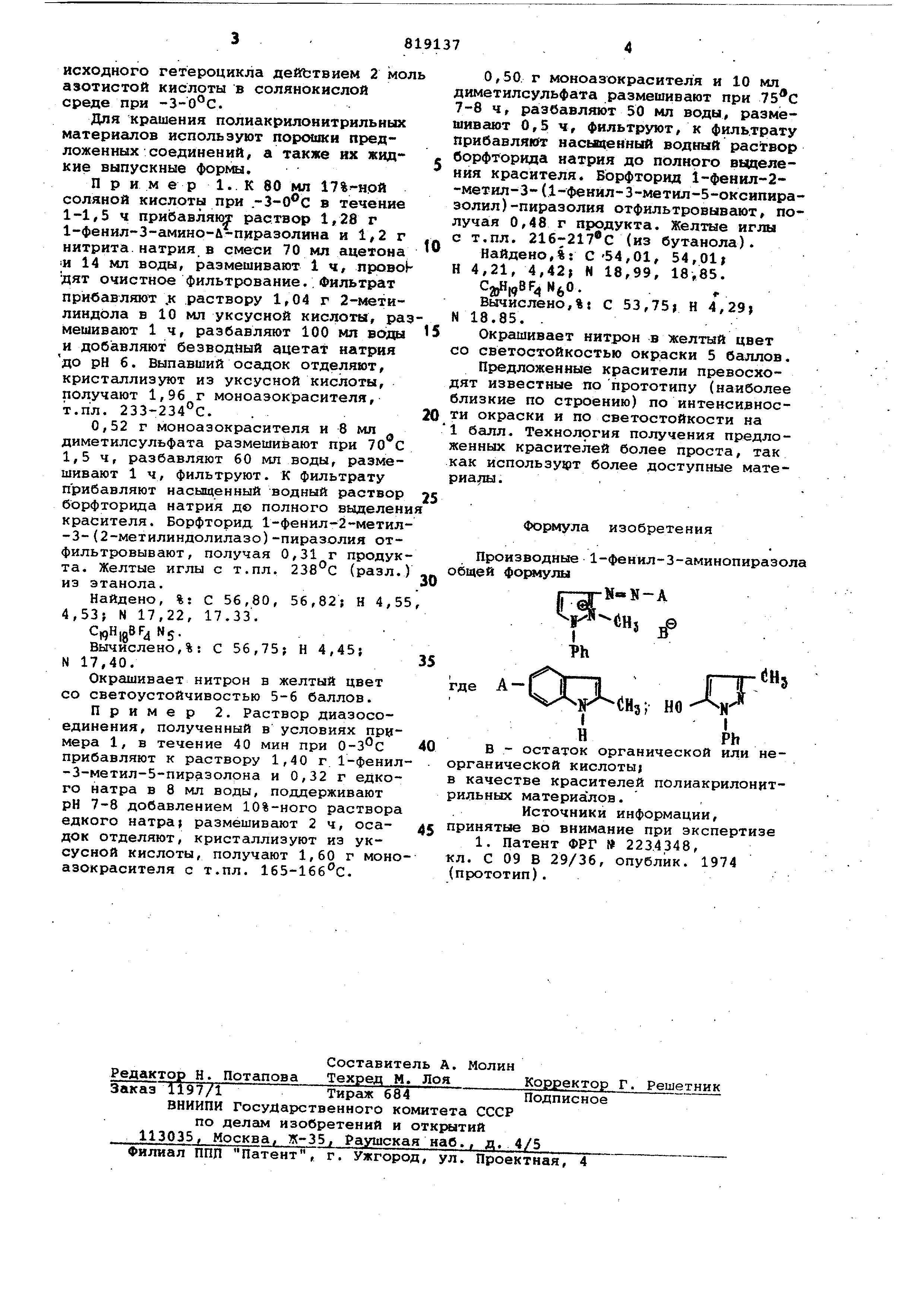(54) ПРОИЗВОДНЫЕ 1-ФЕНИЛ-З-АМИНОПИРАЗОЛА В КАЧЕСТВЕ КРАСИТЕЛЕЙ ПОЛИАКРИЛОНИТРИЛЬНЫХ МАТЕРИАЛОВ исходного гетероцикла дейЬтвием 2 мол азотистой кислоты в солянокислой среде при -3-0°С.
