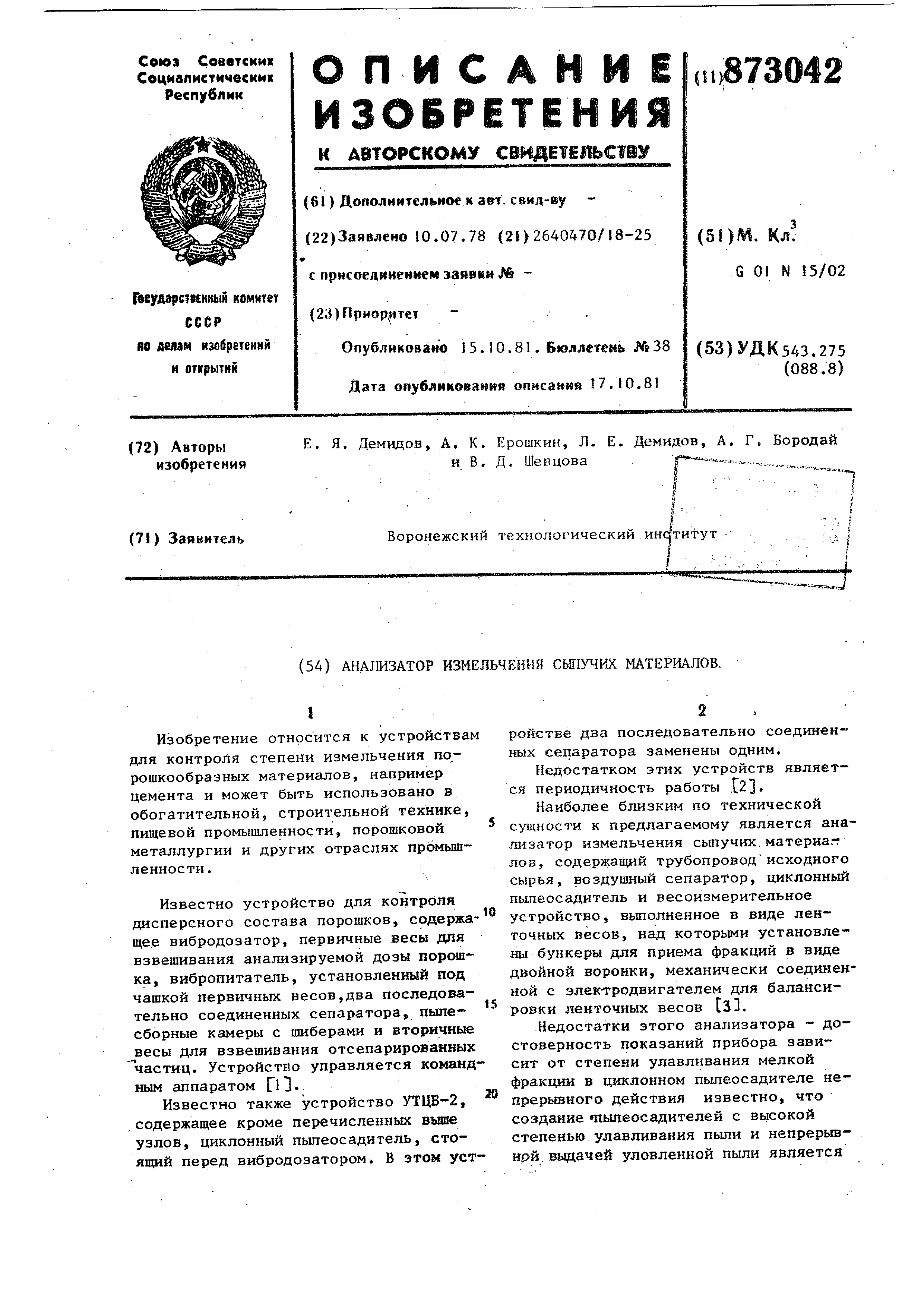 .надежен, показания его достоверны (среднеквадратическая ошибка не превышает iIZ, он не является источником шума и практически не загрязняет окружающую среду пылью. Формула изобретения Анализатор измельчения сыпучих материалов