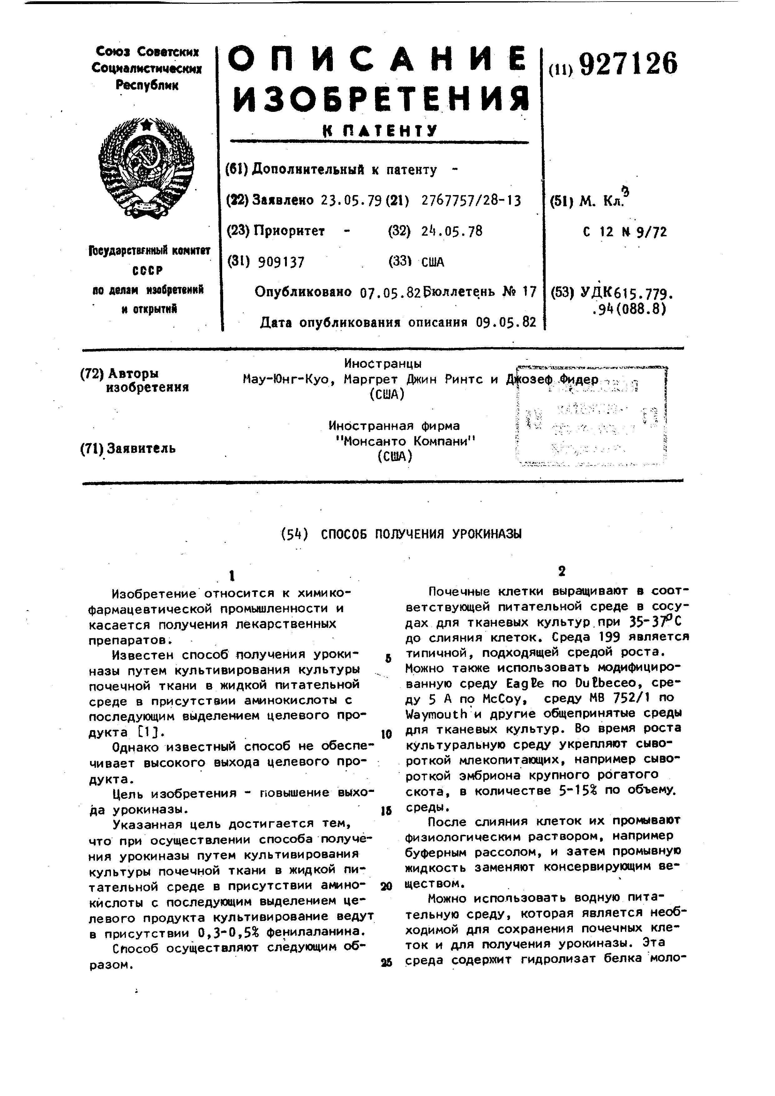 Активность урокиназы затем относят пропорционально к радиоактивности , выделенной в раствор. Единицу активности урокиназы определяют как количество энзима, который гидролизует один мгк фибрина за час. П р им е Р2. Нормальные первичные клетки почки человеческого эмбриона культивируют до слияния в колбах Т-75, как описано в примере 1, также промывают в стерильном соляном растворе и удаляют 90 мл консервирующего