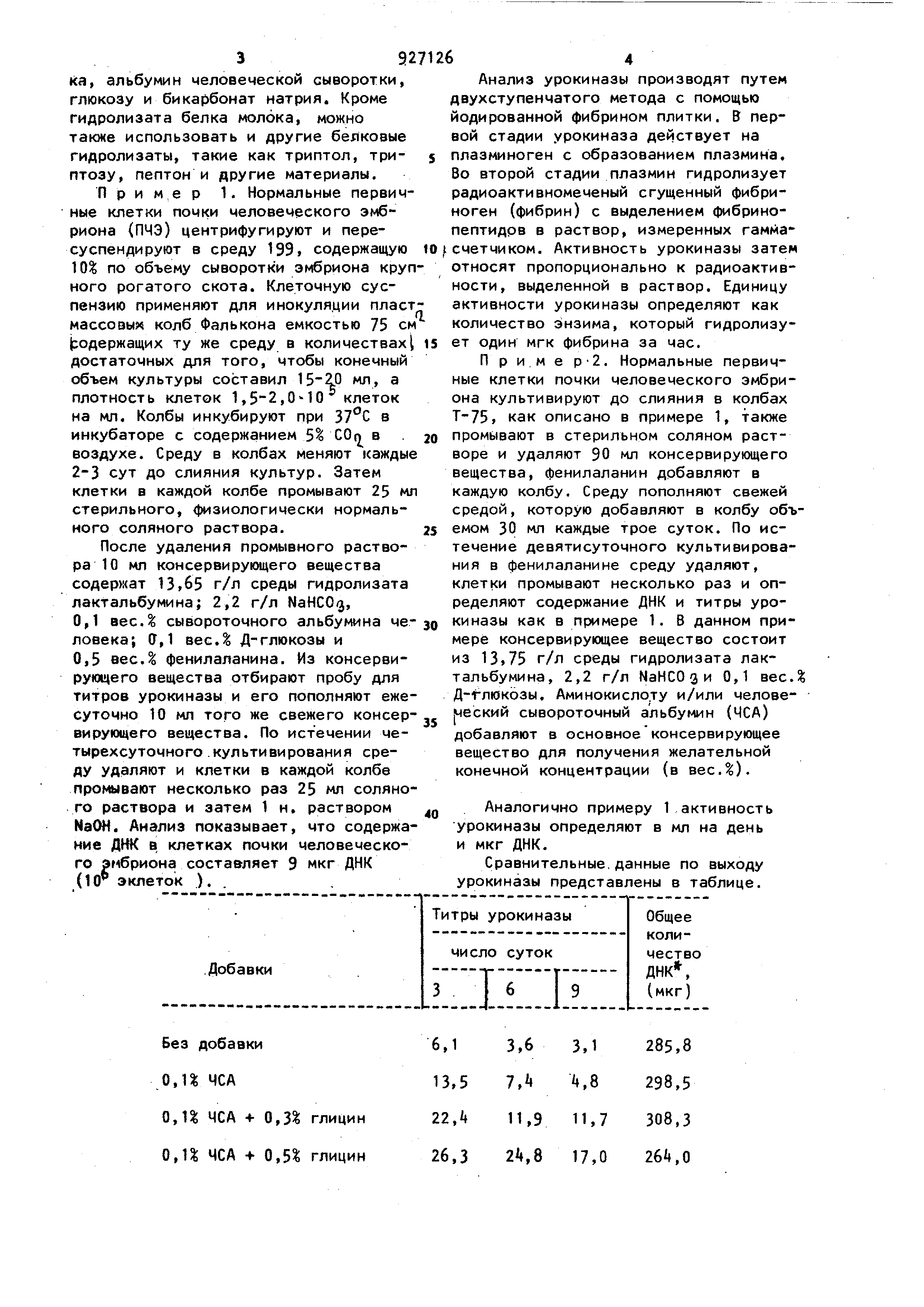 Без добавки 0,U ЧСА 0,1 ЧСА + 0,3 глицин 0,U ЧСА 0,5% глицин Конечное содержание ДНК в клетках в каждой колбе по истечении девятисуточного культивирования в консервирующем веществе. Выход урокиназы, полученный куль- ткани в жидкой питательной среде в тивированием почечных клеток при ис- 5присутствии аминокислоты с последуюпользовании