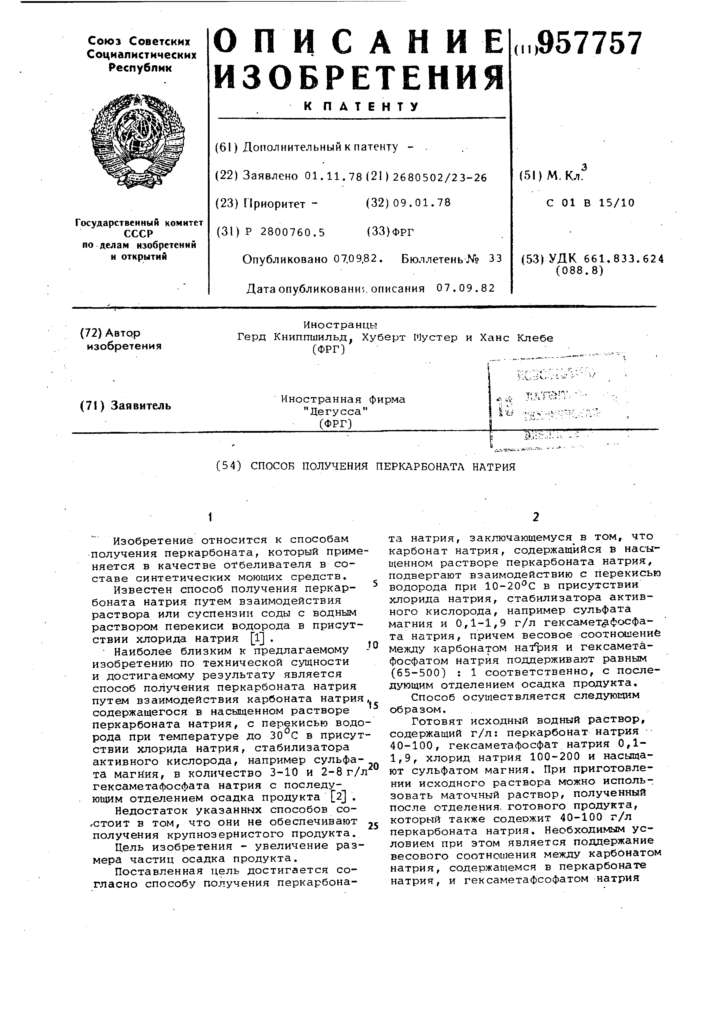 натрия, .содержащегося в насыщенном растворе перкарбоната натрия, с перекисью водорода при 10-20 С в присутствии хлорида натрия, стабилизатора активного кислорода и гексаметафосфата натрия.с последующим отделением осадка продукта, отличаю .59577576 щ и и с я тем, что, с целью увеличе- Источники инфо1 ации, ния размера частиц осадка, гексамета- принятые вр внимание при экспертизе фосфат натрия используют в количест-; 1. Патент (Ивеции 90295, ве 0,1-1,9 г/л раствора при