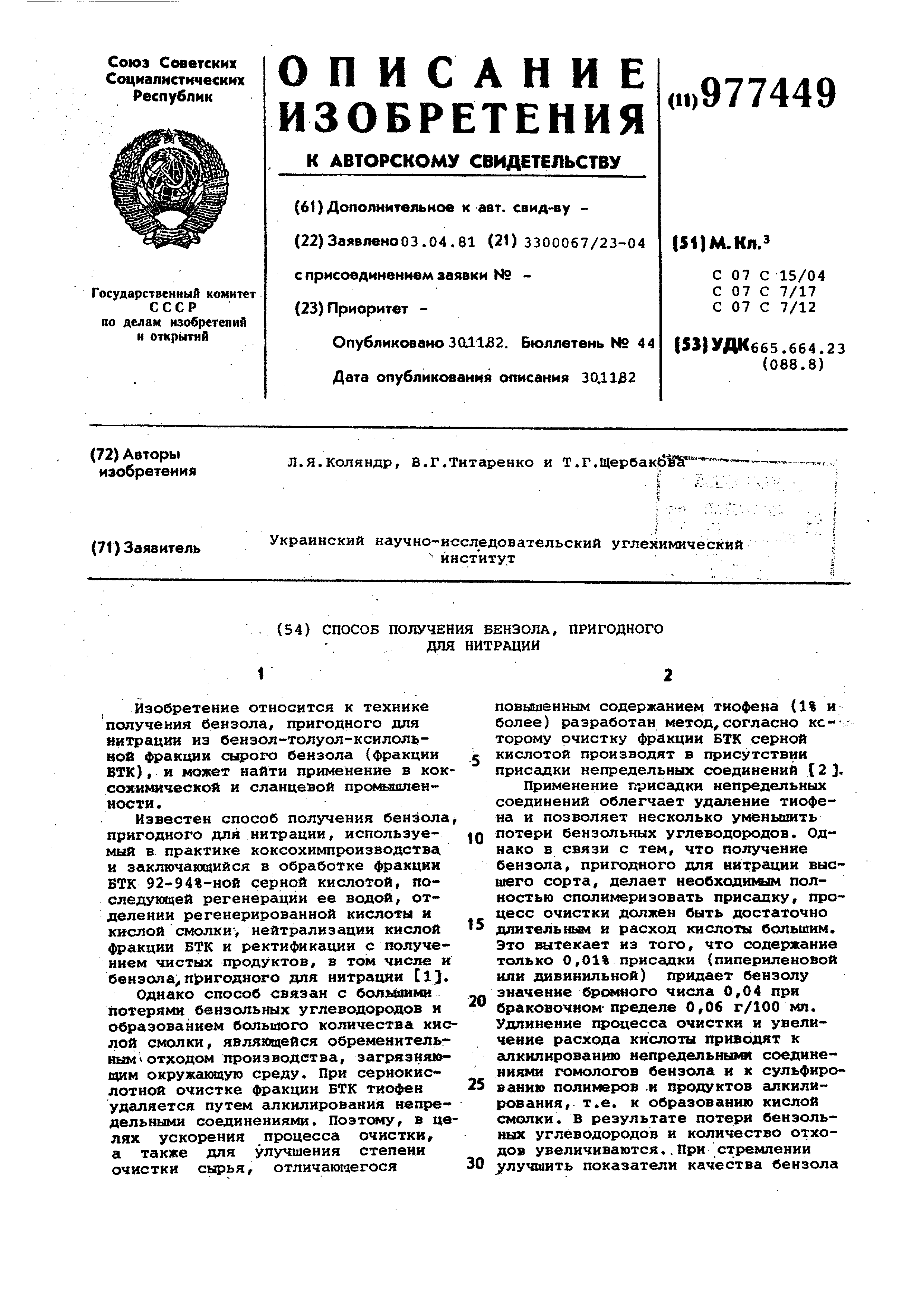 (54) СПОСОБ ПОЛУЧЕНИЯ БЕНЗОЛА, ПРИГОДНОГО ДЛЯ НИТРАЦИИ