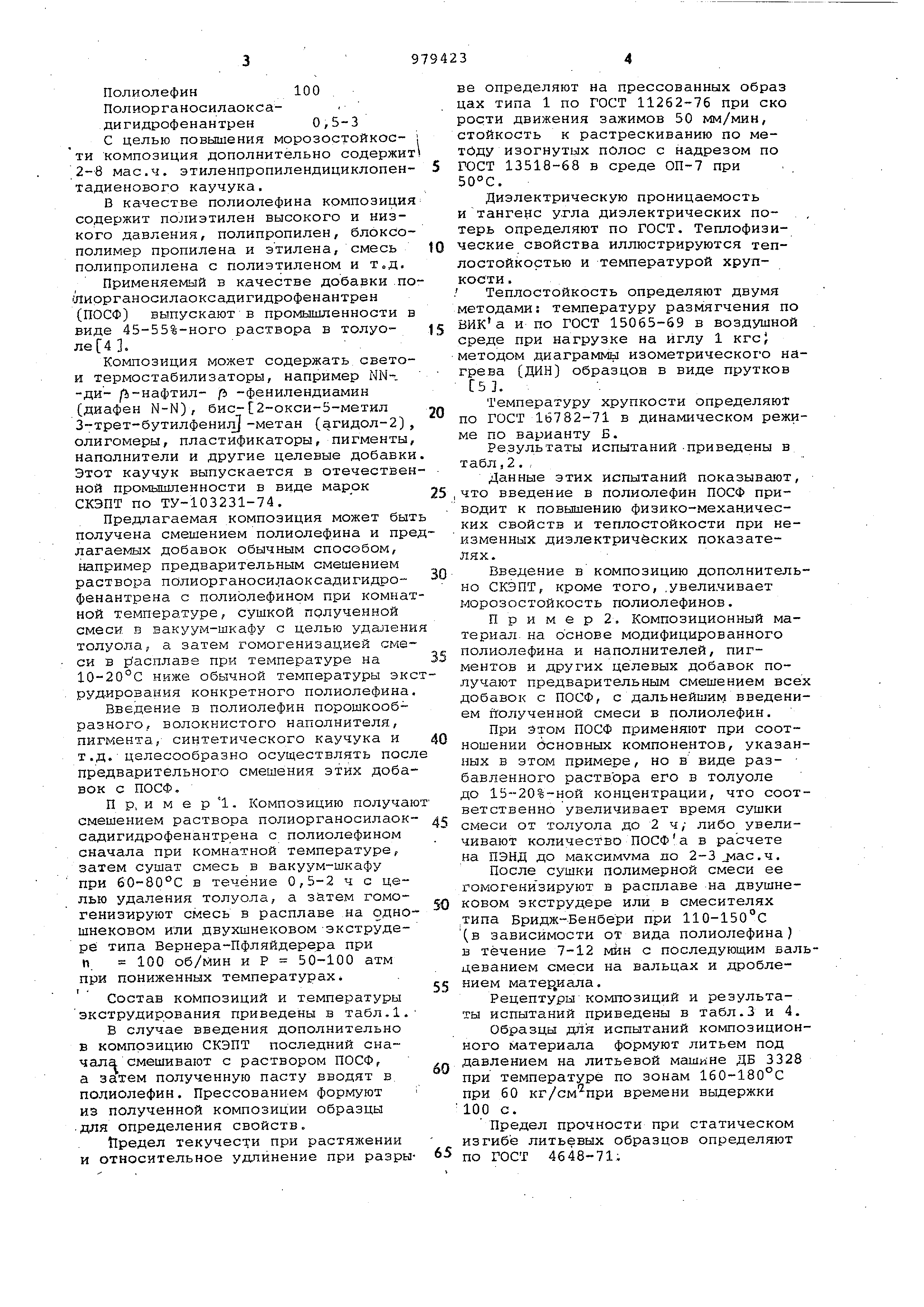 Как видно из табл.З и 4, введение полиорганосилаоксэдигидрофеанантреиа 6 полиолефин приводит к значительному увеличению теплостойкости материала и повышению некоторых прочМостных показателей.