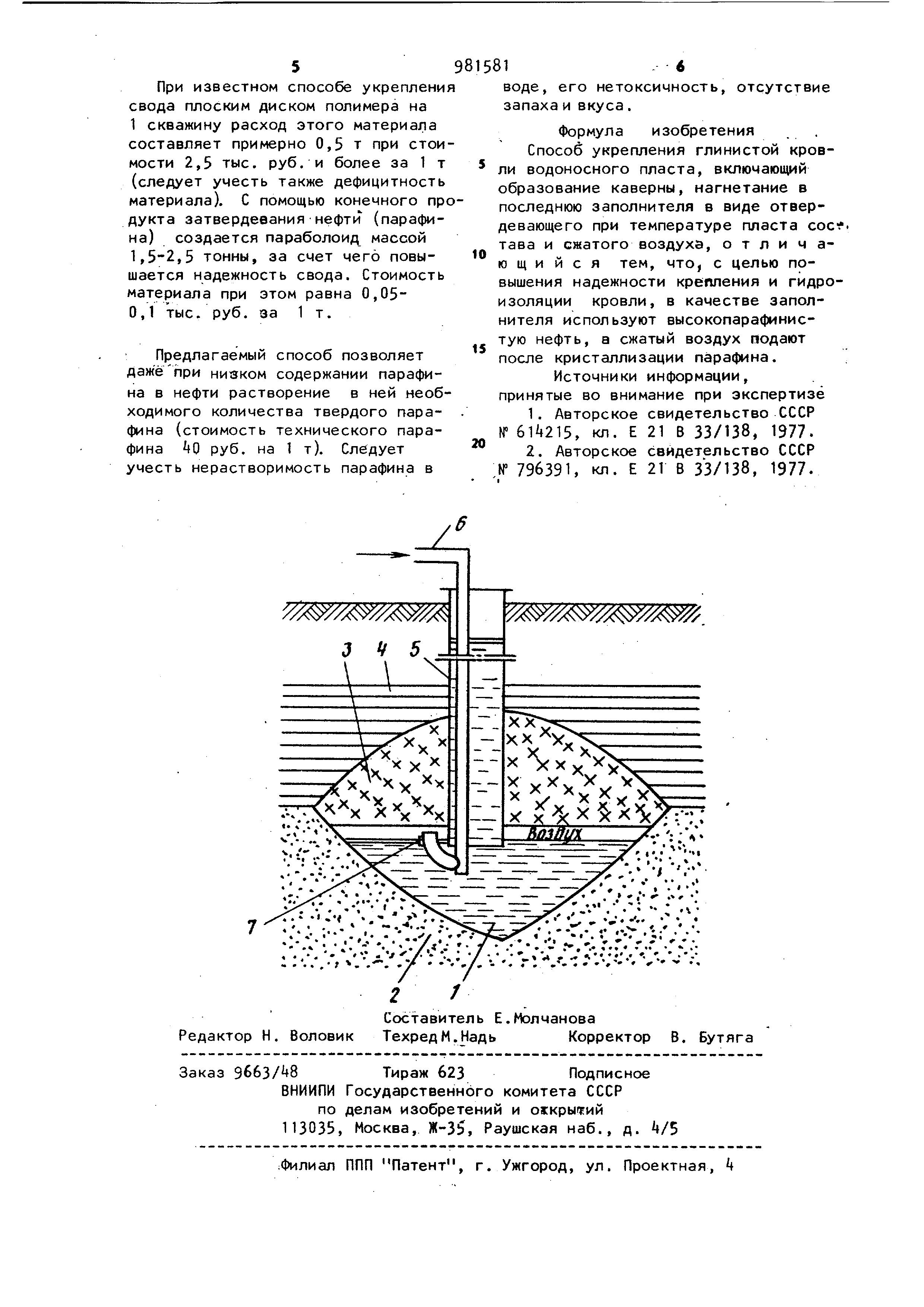 tO руб. на 1 т). Следует учесть нерастворимость парафина в воде, его нетоксичность, отсутствие запаха и вкуса. Формула изобретения. Способ укрепления глинистой кровли водоносного пласта, включающий образование каверны, нагнетание в