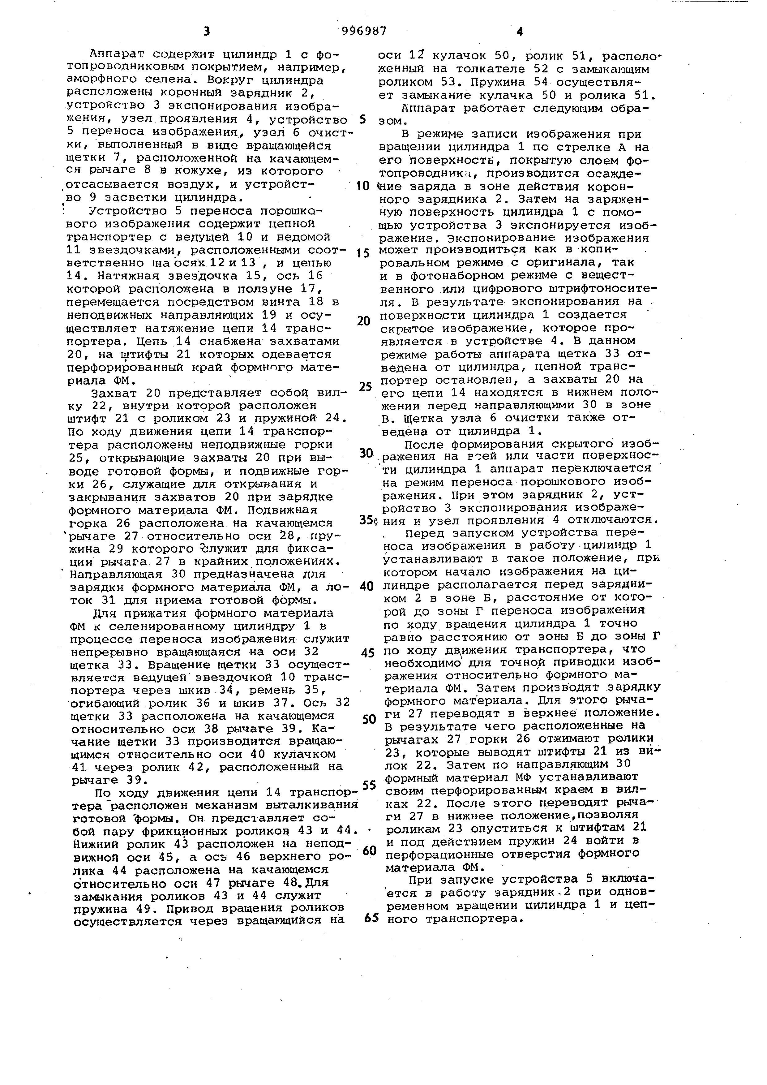 Аппарат содержит цилиндр 1 с фотопроводниковым покрытием, например аморфного селена. Вокруг цилиндра расположены коронный зарядник 2, устройство 3 экспонирования изобраХ (ения, узел проявления 4, устройств 5 переноса изображения, узел б очис ки , выполненный в виде вращающейся щетки 7, расположенной на качающемся рычаге 8 в кожухе, из которого ,отсасывается воздух, и устройст во 9 засветки цилиндра. : Устройство 5 переноса порошкового изображения содержит цепной транспортер с ведущей 10 и ведомой 11 звездочками, расположенными соот ветственно 1на Ьсях.12 и 13 , и цепью 14. Натяжная звездочка 15, ось 16 которой расположена в ползуне 17, перемещается посредством винта 18 в неподвижных направляющих 19 и осуществляет натях ение цепи 14 транспортера . Цепь 14 снабжена захватами 20, на штифты 21 которых одевается перфорированный край формного материала ФМ. Захват 20 представляет собой вил ку 22, внутри которой расположен штифт 21 с роликом 23 и пружиной 24 По ходу движения цепи 14 транспортера расположены неподвижные горки 25, открывающие захваты 20 при выводе готовой формы, и подвижные гор ки 26, служащие для открывания и закрывания захватов 20 при зарядке формного материала ФМ. Подвижная горка 26 расположена на качающемся рычаге 27 относительно оси 28, пружина 29 которого Служит для фиксации рычага, 27 в крайних положениях. Направляющая 30 предназначена для зарядки формного материала ФМ, а ло ток 31 для приема готовой формы. Для прижатия формного материала ФМ к селенированному цилиндру 1 в процессе переноса изображения служи непрерывно вращающаяся на оси 32 щетка 33. Вращение щетки 33 осущест вляется ведущей звездочкой 10 транс портера через шкив 34, ремень 35, огибающий.ролик 36 и шкив 37. Ось 3 щетки 33 расположена на качающемся относительно оси 38 рычаге 39, Качание щетки 33 производится вращающимся относительно оси 40 кулачком 41. через ролик 42, расположенный на рычаге 39. По ходу движения цепи 14 транспо тера расположен механизм выталкиван готовой формы. Он представляет собой пару фрикционных роликоц 43 и 4 Нижний ролик 43 расположен на непод вижной оси 45, а ось 46 верхнего ро лика 44 расположена на качающемся относительно оси 47 рычаге 48. Для замыкания роликов 43 и 44 служит пружина 49. Привод вращения роликов осуществляется через вращающийся на оси 12 кулачок 50, ролик 51, расположенный на толкателе 52 с замыкающим роликом 53. Пружина 54 осуществляет замыкание кулачка 50 и ролика 51. Аппарат работает следующим обра3 ом. В режиме записи изображения при вращении цилиндра 1 по стрелке А на его поверхность, покрытую слоем фотопроводника , производится осаждение заряда в зоне действия коронного зарядника 2. Затем на заряженную поверхность цилиндра 1 с помощью устройства 3 экспонируется изображение . Экспонирование изображения может производиться как в копировальном режиме.с оригинала, так и в фотонаборном режиме с вещественного или цифрового штрифтоносителя . В результате экспонирования на . поверхности цилиндра 1 создается скрытое изображение, которое проявляется в устройстве 4. В данном режиме работы аппарата щетка 33 отведена от цилиндра, цепной транспортер остановлен, а захваты 20 на его цепи 14 находятся в нижнем положении перед направляющими 30 в зоне В. Щетка узла б очистки также отведена от цилиндра 1. После формирования скрытого изображения на всей или части поверхности цилиндра 1 аппарат пер