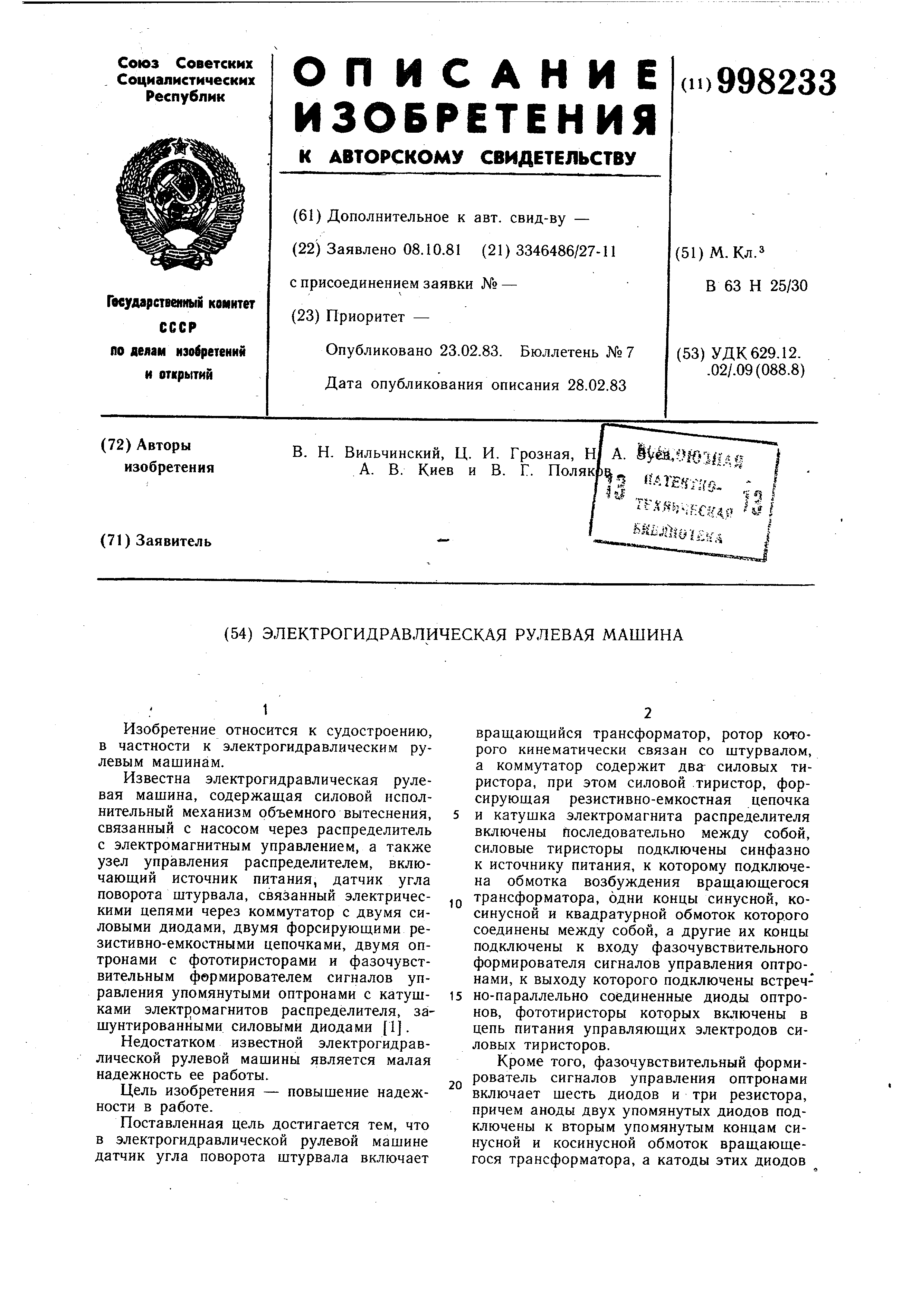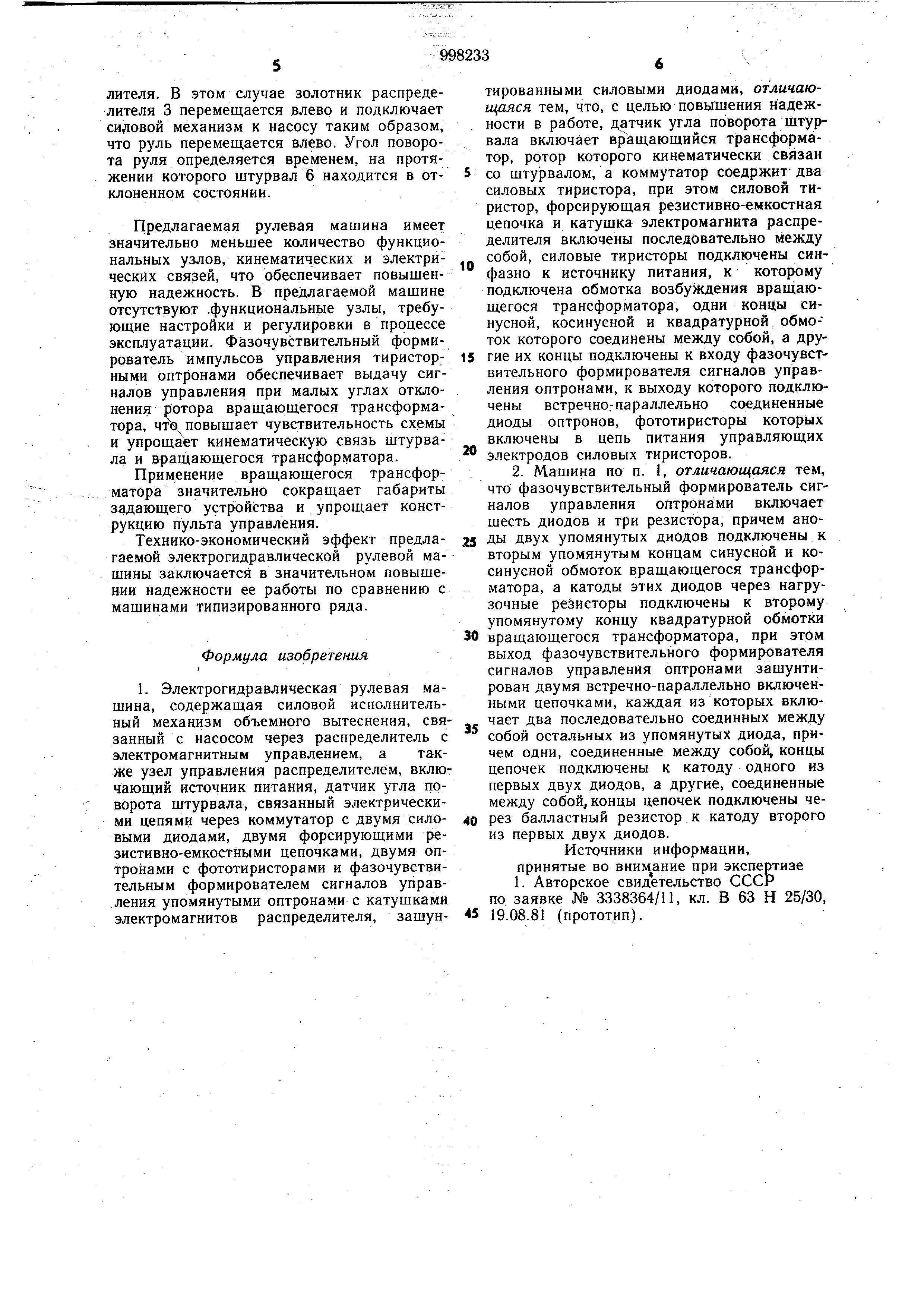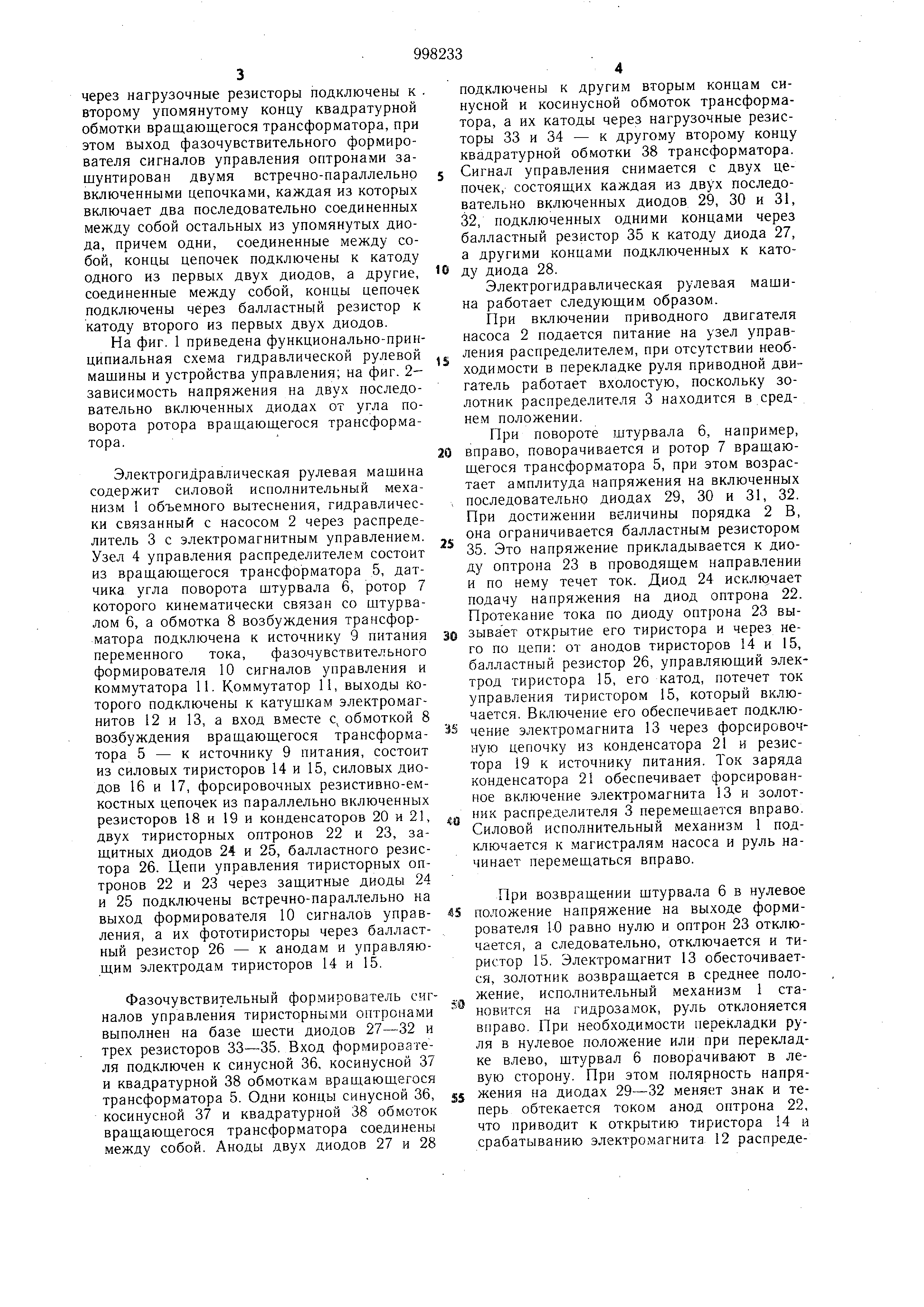 балластный резистор 35 к катоду диода 27, а другими концами подключенных к катоду диода 28. Электрогидравлическая рулевая мащина работает следующим образом. При включении приводного двигателя насоса 2 подается питание на узел управления