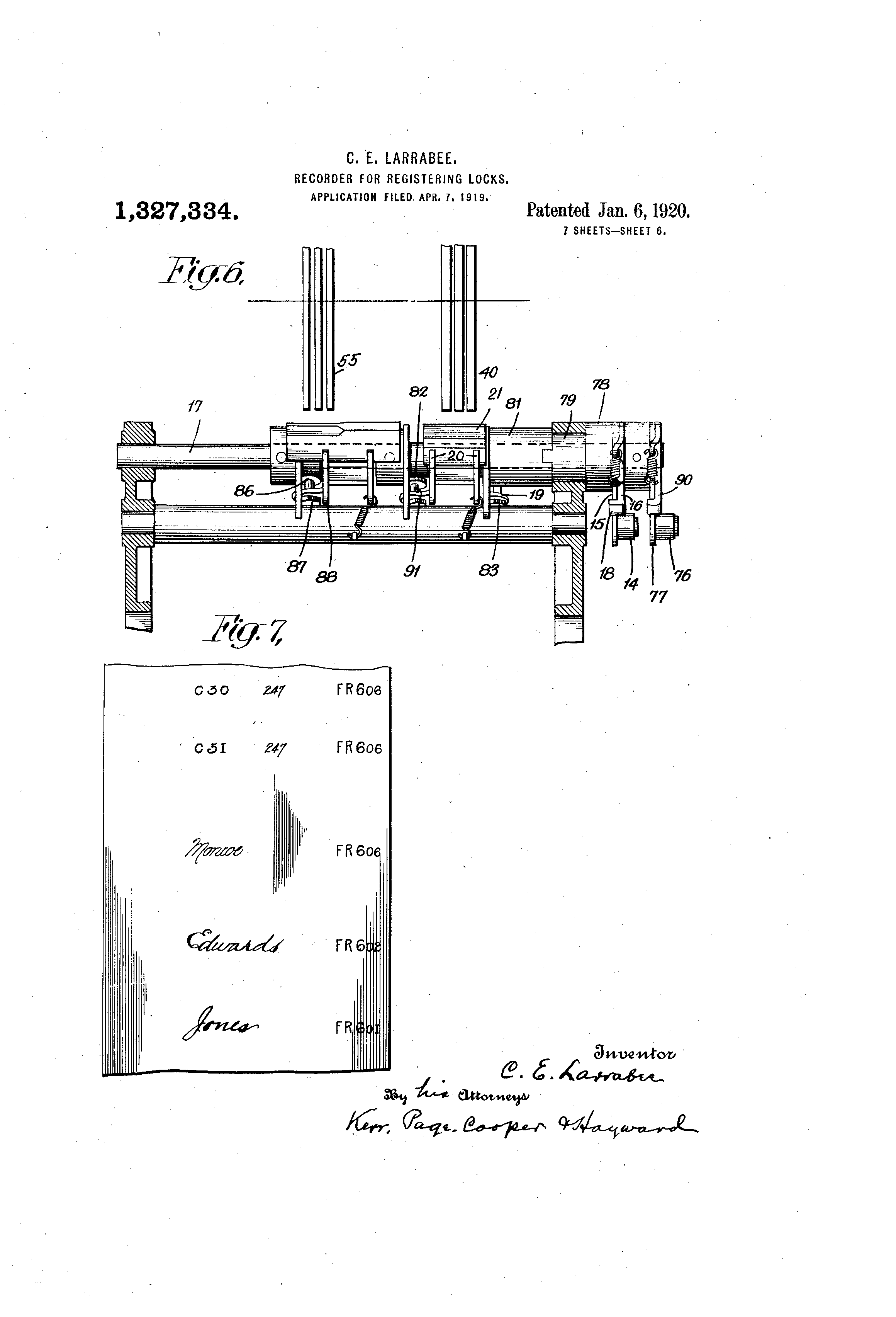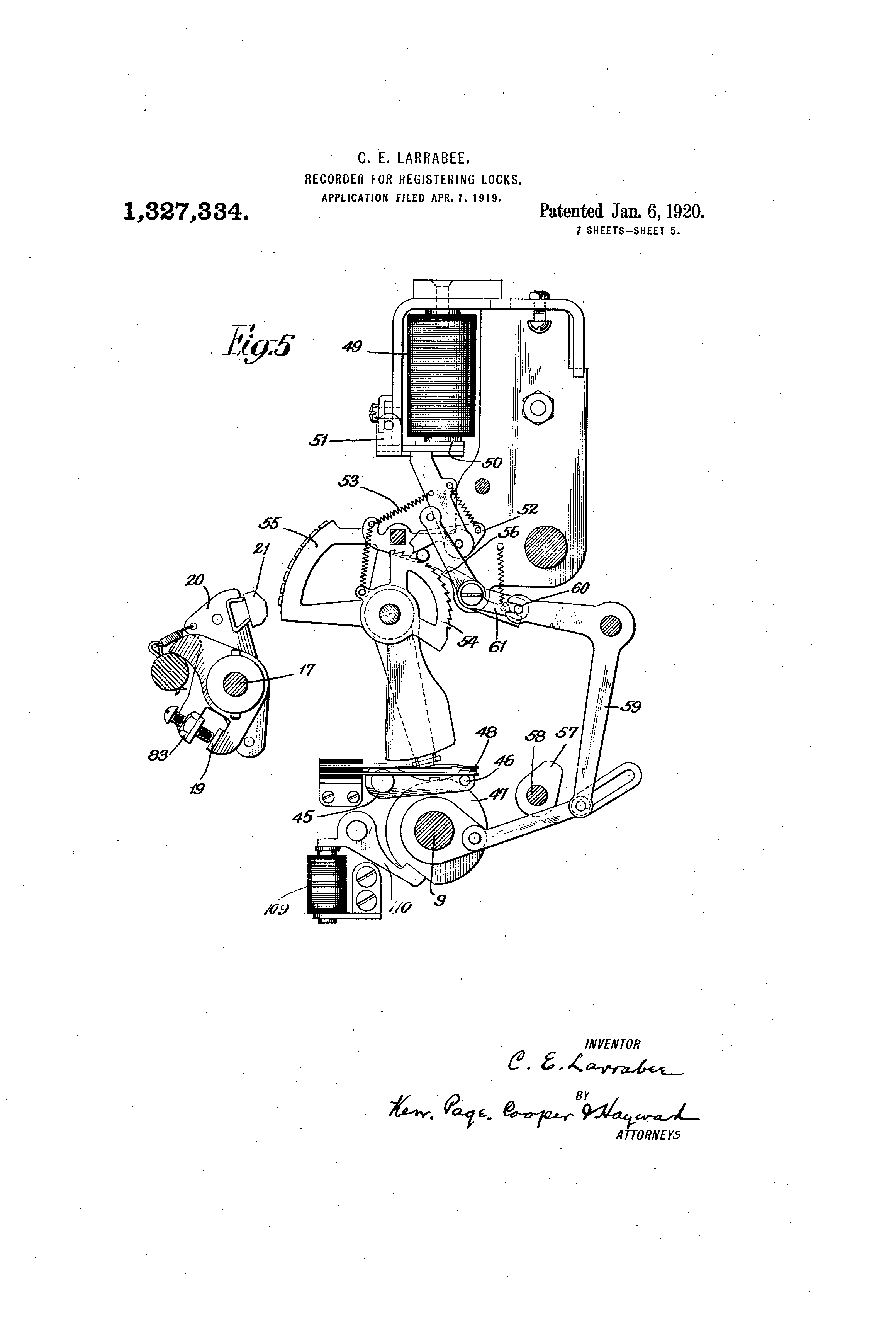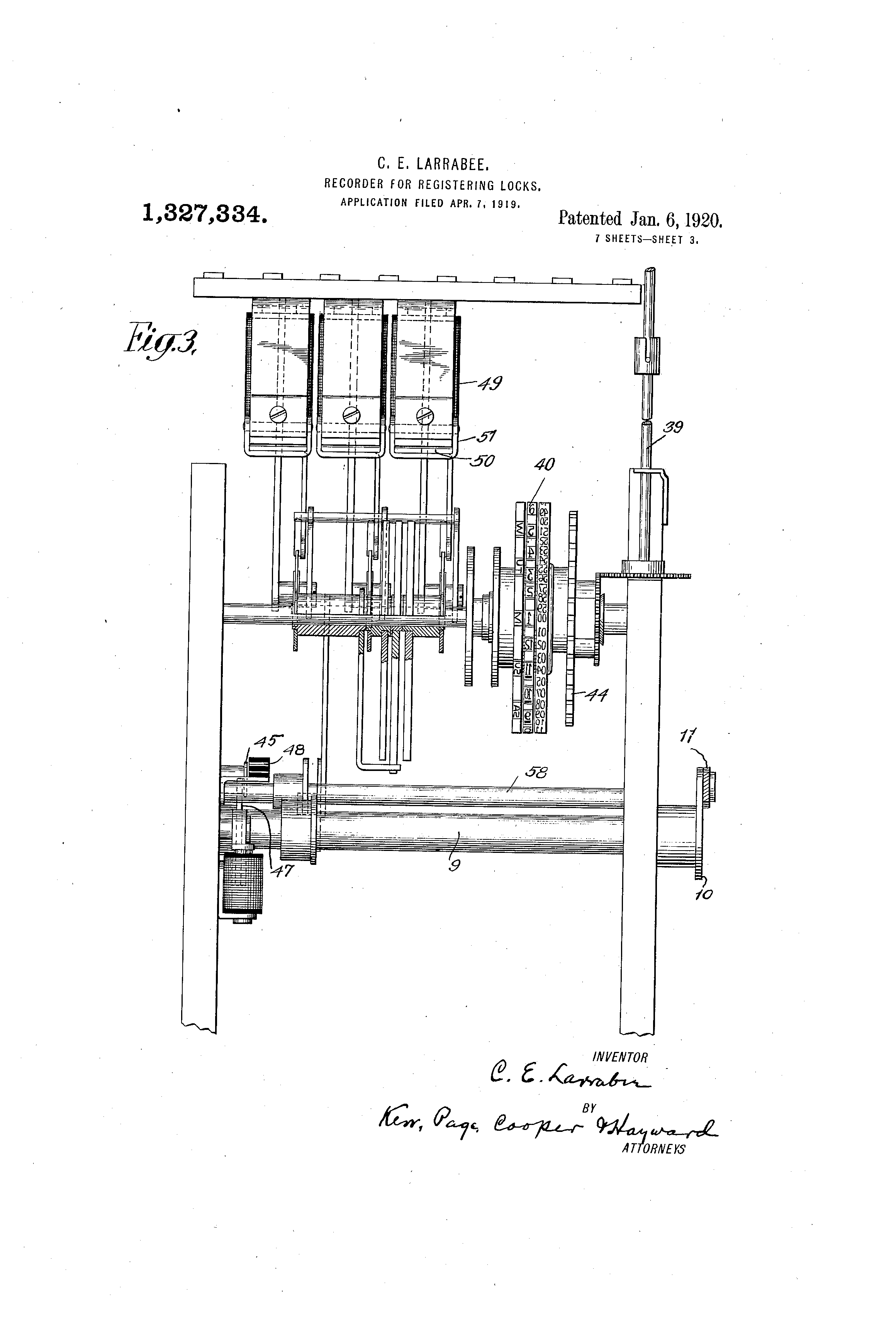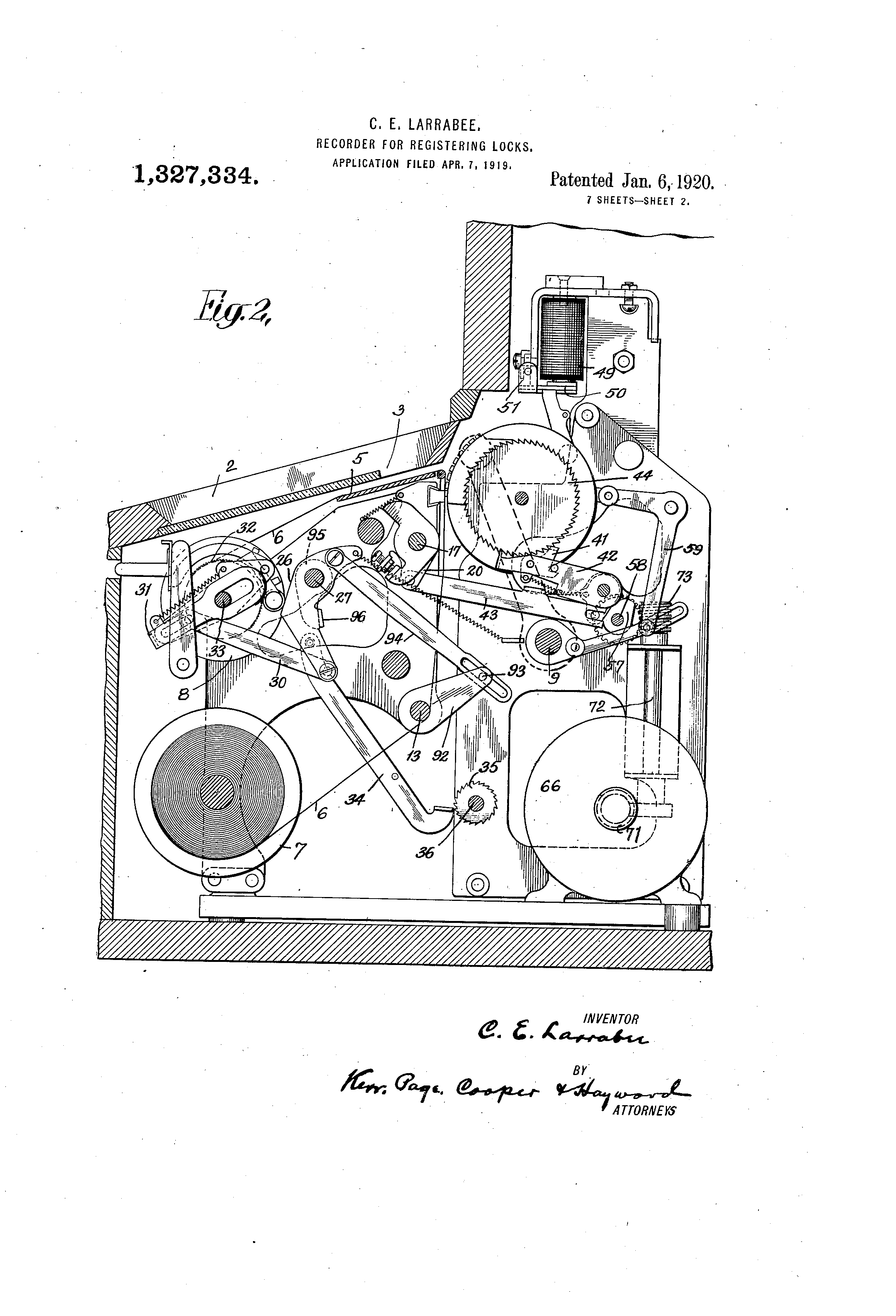-U.Nr-UED "K;ITATES PATENT OFFICE'. CLINTON E. LARRABEE, OF 13INGHAMTON, NFW YORK, ASSIGNOR TO INTERNATIONA.L TIME RECORDING COXFANY OF NEW YORK; A CORPO:RATION OF NEW YORK. RECORDER FOR REGISTERING LOCKS. 19327,334. Specification of Letters Patent. Patented Jan. 6,1920. Application fLIed April 7, 1916. Serial No. 288,080. To all whom it may concern: Be it knoivn that 1, CLINTO@N E. LARRABFE, a citizen of the United States, residing at Binghaniton, in the county of Broom6 and State of New York, have invented certain new ancl useful Improvements in Recorders' for Registering Locks, of which the following is a full, clear, -,tnd exact descripti6n. There are at the present time in use, and lo there have been proposed a variety of recording locks, distinguished in general, by the combination with the lock mechanisms proper of means for operating a more or less remote mechanisn-i over suitable circuits 15 to record the particular key tised to operate the lock; the particular door or the, special lock attached to it which is operated, a ebaracter of figui-e which indicates whether the key was inserted from the outside or the 20 iiiside@ and otlier - data of a like useful nature. The invention upon which the present application for Letters Patent is based is an iiiiprovement in the recorders or the means 25 employed in such systems for. receiving and recording in permanent form, the inforniation of the nature referred to. The mechanism of my improved ihstrument is designed to be operated either man30 tially or electrically to record the data desired. It bas provision for recording the, signature of an employee in conjunction with the tinie at which the signature was iiiade, and other items of information, such 35 ',is marks or symbols indicating the door in ivhich @i lock is located, the parlticular key used and such others as htve been specified above. It is so arranged that @vhen being .used as a signature or autograph recorder, 40 certain parts only are operative while the others are locked against operation, while, when used in conjunction witl@ the automatic mechanism of the lock, the previously locked parts are brought into operation as 45 well as such of the other parts as may be .necessary. The apparatus is further desi--ned in such manner and form that when usi-d in co6peration with a lock to -a-Litomatically record@ it 5o cannot be oper',qted manually and vice versa, and it may be provided with means for giving a signal or alarm when operated at certain predetermined or unusual times. The invention resides in the construction 55 of the elements and in their novel combin ation to forn-i a iiiore effective and practic al mechanism and one n-iore dependable a nd reliable in operation than those which p receded it, and hence no further general st atement of its nature and plirpose will be 6 0 r equired foi@ its. proper cornprehension. In the accompanying dra-Ovings, which il lustrate'the details of fhe mechanism, Figure I is a side view looking from the ri ght, with parts of the casing removed, of 6 5 t he recorder proper. Fig. 2 is a sectional view of the same n iechanism on line 2-2 of Fig. 4. Fig. 3 is a top plan view of the recorder mechanism with the printing elements re7 0 moved. Fig. 4 is a fi-ont view in elevation of the - apparatus with certaiii parts omitted. Fig. 5 is a detail view of parts of the d evice whiqh are designed for setting the 7 5 t ype segments for printing. Fig. 6 is an enlarged view, partly in elev ation and partly in section, of the operla ti@e recording mechani@m. Fig. 7 is a view of a portion of one of the 80 sl ips pi@inted by the recorder, and Fig. 8 is an electrical diagram of the s ystem includ.ing a plurality of recording l o@ks. The character of tl-ie locks used for oper- 8,5 a ting the recorder is not of the essence of t his invention, and may be greatly modified. I n a copending application. filed November 1 1, 1918, Serial No. 261,976, I have shown in d etail such a lock and.reference mtty be had g o t o the drawings and descriptions of that c ase for such information as may'be req uired as to the actual constr,uction of such, l ocks. In the apparatus of the present case the 95 p arts are properly associated in a casing 1, h aving @n inclined front 2, with a window o r opening 3 therein which may be either n ormally open or stand iform@,lly closed by a shield 4, adapted to be moved over a l oc p latfo@m 5 over, whi6h is carried a record s heet or strip of paper 6 from a supply r eel 7'to take up reel 8. The construction a nd mode of operation of the device when o perated manually may be first des@iibed. i o5 The main driv6 shaft is indicated by the n umeral 9, and for hand operati'on it is prov ided with a suitable crank 85 Fig. 4. Ass uming for the moment that, by means hereina$ter to be d.escribed,. the type on wheel 110 40 to indicate time have been set to printing position by the time mechanism, the turning of the shaft in a counter clockwise direction through a'given are rotates an arm 10 fast to the shaft to@ which is pivoted a link 11 connecting said arm to a bell crank lever 12 on a shaft 13, the end of which is formed as a cam which engtges 9, i-oller 14 on a lever 15, see Figs. 4 and 6. 1.0 A lever 16@ see Figs. 5 and 6 is fixed to a hub 78 on shaft 17 and having an extension 79 which interlocks or eiigages with a sleeve 81, which carries a projection 19 that is in the path of a bent projection 83 froiii one 15 of the plates 20 that carry the printing pad 21. The lever 16 has a bent or turned over end 18, as shown, which lies over the lever 15, and by the movement of the latter sleeve 81 ' is rotatod clockwise and this operates 20 thr?ugh the projoetion 19 to throw the spring actuated plate or levei- 20 carrying the p@inting pad 21 against the strip 6 and thlis print the set up characters which are in the printing position. 25 On a shaft 27 is mounted so as to turn thereon, a lever 26, condected by a link 30 to a pawl mechanism 31 which whe