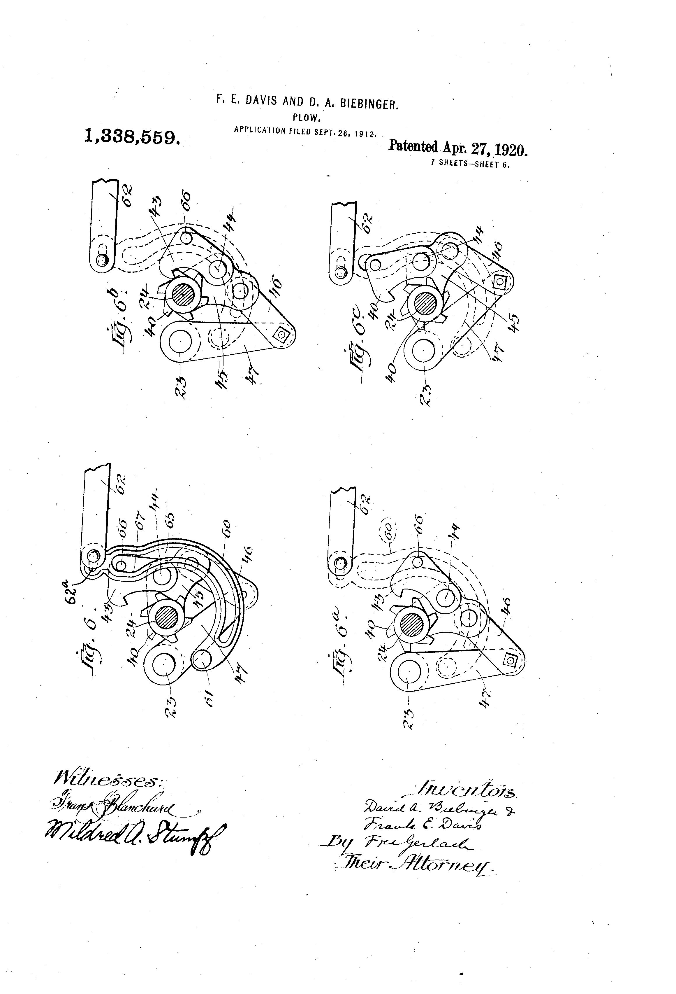 TFJ,4@'- @ AT-ENT- O.J., 0 E. D.4@-'@TIS tA.TI'D A@ 'J,31BBIIqG O'@F LA To 1.& PLO!YI COITPANY, LA WISCONSIN, A WI,--- ,- FLO W, SI)tcificatioii of Letten. Pateiit. Pat tell A-p@e. 2i, Ap .pl4catioii film' Septernber 26, 1912. Sei-ial se. Rg tile Opei@,ltion of tile B,3 i,t ki@tc)v,,-n tL,:i,t ive, 'DAI@TIS lifti-a@@--n-i(ichanisiri i-ii-itit thc, ploivs -[-lave been ,II)(! A@ 1.)otli resiclefits of raise(I tO tlle pOijIt. )AIIIQI'E qre ip the cotipt'-, of 1,:,, Crosse ancl lo(@ked. F,@'g. 9 i@s a sili-,.iia@- osif;,)n aiid the "liscolisilli lizi@-e ill oper,-Lti@,e P [TSQELI@ lLqPTOVellie i.I.A of ',In(! 3101(lillg bav iii o be is dp,- l@- I)Iol@- carryiii, "@tl.,Ctctul@e comp@-ises IYIII CII are rigi@:1 @,- seci@3.,ed 'I'll(, iTil-t@l-itioll to PIO%YS I @"n(,l more ill sl,)aced relation @).t tlle'lr -@troylt ei-.tds by@ to type of Plo-,'V \VI-licll is 14, --15'qrlCt -, CrOss 1)@7tr IC) and at l@,-ioivii ,is fr,,iiiieless an@ci iii ivhi(-,Ii their -,ea,r ends by A i)l oA-vsh,,zre, 65 is pro- 12 is i@egi@lly sectired to eg,,ch bea@n - 'i3. - The ploiv ill'ijstr,,il@-lect iii tlxe droll-iiio-s 'Plic. iiiA,e,,-ition desi-ns t(,,@ p-zovide, im- @i,@gaiig pf three ploavs bi@l-t it, wtill L-e 15 i-)roi-ed draft-o?,)eritecl iiiechiiiisn-i for liftstood that ,iny 6f pl,,,)ws inty iii@(p the, plo@l,,s. improve(l. controllin(,-meeli- b(, ernplo.),ecl. 70 ]'l ie @,ii-Lisiii for se-,id ),nd iiii- fr@nt ei)@d of tl).is ploii,- ctrrviiig-stri-iccoi@in(@et'ons ii@liereby L the tlire' is i,(Ijust,,ibly stist,,tinecl bv 'tv,7o erfn. k be ,idjii@,,tecl to -%i-ork ,it diffe,-e-at axles 23 and 21 ivliicli ada@)ted to serve 20 d@,,p(@lis. 7r!ie iii,.-ention to as lifting coiinecti.oii,,3 f.,)r ti@i(, side@, of the ,ti-L iiiil)ro-@-eCi -ajp,(,-i-)Iow, ,tiid to pro- striiettire i-espe(,- tively. Axif., 23 is pivotecl 4 5 nII)r,@, e( (@)istrticti6p-. iii tli@, fitrro%-,,- wlic@el 25 @ind is cori-iecte(-l t,) YI(IL@ I I)Ioll' of i ov (@oisists iii tiie several novel the ploi@,-Supp().,tiii- to 1 ills, tcie s(-,t forth PD.(] ii-iore ptir-, I)Ioivs carrie(@t I)y sir@,icttice rei,,i,Dive to 25 ('tefiried t)y elziiiiis at the coi-iciii- the ground, I)y swiii-,I-j,-ig tlte ,txle Iboitt its axisinthefurro-,N,- @vhecl. Axle,,-)I;spi),oto(I s c, @'i)- tii(,, draw-iii,,s: I is ,i I)Ian of a iii the iin(I Avl-iec). -9,6 ind al-so pivo@Lal.ly c-..i-,ibo(lyiii,,, tile irventi.on. j[4'i 'is coiinected to th stri3etilre. e a si(li@ elevittioll, tl)C lan(!-Yvh(@el b-,iiig reThese craxik-axles 23 a-@),dPA --@@,hich gre -)Ollre :iiiled iii I)r,,ickets 27, 28 lli) 34i slio)vii iii se(,,ti,,)ii, l,h' d 29 wli;.c'@@ tre Ploiv-, 1)ein(, slioavii iii raise(i positi.on for i-esl)eqtively secure@; '@o tlip, 1)',Iolv bearrL,@, 13 s5 j@ig. 3 is a @;imilar iie-,v,,tlie - ,ii,e oiie in of-' tli,-- oti'ler and i@i i)ositioi-i asptirned Avheii extei). (Is y ,he @)lo-,y is lo"v@@reC! iiito tl-ip- s,@oil, Fi,,. -1 is 3 16 i ti@;,Ins%-(,rs,,@ section tik@,ii o@i line 4-zi. of- 'Tfie end of @this sust@,ained ii,.. 2. @-,i zi se,!tiori laiceii oi) Iiiie 5 -5 )y a st,,tiidarei. IS -tyiii@lo Ila o"-, is @@L (let@til of the it@, eini(It to o iii its ino-f)er- -the - stare@,,ircl, 1)ei@-iix plow@'i 1)@;li.-ig rxlised. Fig. iii ,t sl(,ei,c@ 20 @lthol-i secii,,ect tia is t s;@ii-@ilar @-i<-w sl).oAvi.,ig the parts iii (ii-ie of- tli(, 13 b-$T , D@ll-S the I)Ioivs have I)een The re,,)r end of the J)Ioiv' . i).ia-@, be adjustad Fi(,r. 61, 'Is a -@,ieii, of th(, s,,iitie slioivi-el.atii,ely to the grotitid, by t)a le-@-er 30 i-zi@, tli,,@ (lo(, of tiie (Ir,,ift,-operated liftiii - is I)ivote(i ',.-o oDe of tlif@, b,,trs 22 'ond is cont-I 9 -,Iiifte(I iiat(,, Ql)er,,,tive p6sitioii. iiected to t stancl@ird IS l@-)y ii l@irilz 311, a stop 45 @@ig@ 01 ,t -,Tieiv ()f tle saitie tlip. 3P. for leier 30 being prov'ide(i on (,n@- ol@ the, iii p@(ill"li(,ion assiiiyiect @@,hei.-i t,l@ie doi), I-,,,is b@ii-s -)I i@,bei, it is ' iii,c)Tie of its,, altei,native @)ob(,i@@ii trop@i the ratchet ancl befove sitii)ii-S. Idink 31 lias its the (,,ontrol.Iii,g 1-ias-I)e(,n re@tor(,,d 'to a coll,@,r 3'0 iybieli is liel(,I. . <ill Stanclircl 18 t,) it@,, noi-xxi,,tl ,)(!k l@ig. 7 is ,i, I)Ian bv ))ins @il)ove ill(] 'b@low tj 1. le collar respec-l' ,5,) Fi.)-. 9 is a @,ieiv paitlv iyi 1)1,,in tively. The ptirpose-iii this a(,,, @l 11 (I Pat-tly ill sectio@l, sliowiiig the lockiii 64, the piaw@ jiistiiient, is to 1,)erinit tiie in I)o,,,itioii tl)e bart, to I)e riise(.1 eTitii-(,,Iy clc,,ir 6f "lie o-rotnd lvlieii tlie, 1)1(@w is not ill lise. '@ilheii n i i , @ l @ i g . 2 , t h e i ,ell lii)@'cls 1,11(i T" is op@@r@Ltiv(,, as oectirs is iii tlie. j.-tositioi of the pivotal connectioiis of the lever and Iiiik -iiill be such'th'at the, sleeve 20 wil lield ii). raised po'sition Liitomatically by this conneei;j.on. - A mecliaiii@4 is pi -ovided .5 forsbiftii-igthe axles fo botli sides of th,-- plow-c,@tTy'lng structure. This mechanisrn is. opet,,tble from the Itind wbeel 26 which serves as f-, traction-,vv@heel for drivii@g this niechanisiyi. A sprocketwheel 35 is -e, s-@jitablv secured to the hub of tlle land wheel ,,vbich is niounted on the inturned sl)indle 36 of ttreh ttxl@e 24, A coll,,tr 37 on said liolds the land,wheel and sprocket o,,,i CI)e sl)indle. Tl,,is sprocket serves to drii,e .,.5 a cliair@ 38 whicli exteiids arouiid ,t sprocket wbeel 39 wliieli is loose on crankaxle 24 and has -;nteat-ally forme(I tliei-ewitli a eltitch or 40 wliicii will I)e constintly driveii.Nvheji the plow is iii operation. These 2() sprocket.@ tnd.cb,,tip- serve -9,s power-mecha.iiisni for sliifting the ei,44k-axles to raise the plo-,A,s, A tightener @1-1 for-chain' 38 1.@j inotinted. on aii arm 42 wliieh is secitred to. .haft 24. 25 Wlicel 40 is adtpted to 'ol)ei,ate a dog 43 @whicli is pivol@ed as at 44 to a-collar or carrier 45 whic@L is pivote(I on shaft 24.. Stid collar or carr,,,,er is conne(!ted by a@ lirik 46 to an itrn-i,4f -@,,,Iiieh ic, ri,-idly sectired to the 30 f,,xle 28 w.Iiie