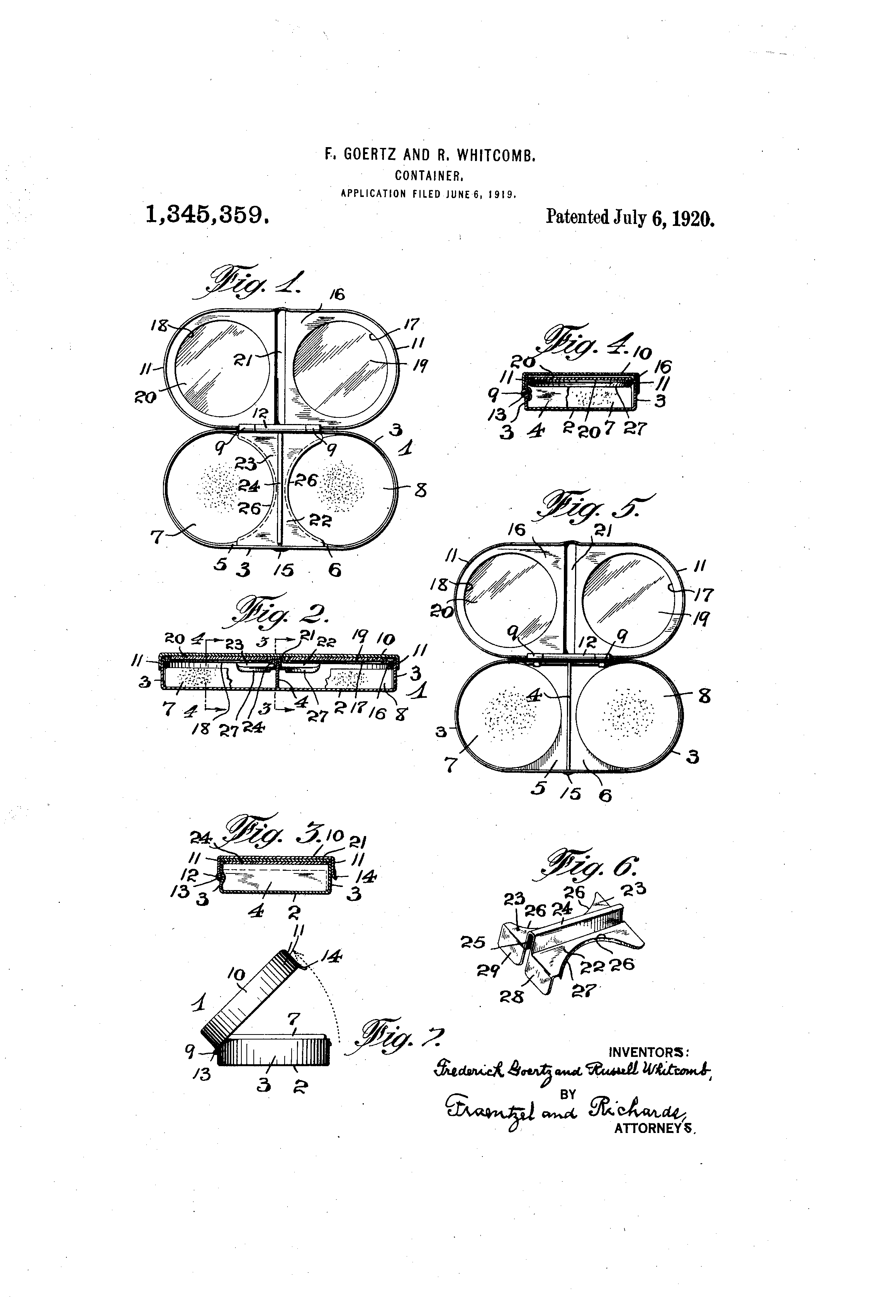 UN@ITED @STA@T@E@S P@A,TENT OFFICE.@ FREDERICK GOEP.TZ, OF 'NEWARK, AND RUSSELL WHITCOMB, OF ELIZABETH, NEW JERSEY, ASSIGNORS TO AUGUST GOERTZ AND CompAwy, A CORPORATIO.W OF NEW JERSEY. 'CONTAINER. 1345 359. Specification of Letters Pate3it. P a t e n t e d J - t i l y 6 @ 1 9 2 0 . Application fLIed June 6, 1919. Serial No. 302,205. To all whogn it may conce-n: Be it known that we, FRFDERIck GOFRTZI a citizen of the Un'tted States, residing at Newark, county of Essex and State of New i ey. aDd RTissr@LL W:RITCOMB a citizen 5 ers of the United States, residing at Elizabeth, in the county of Union and State of New Jersey, have invented certain new and useful Improvements in Cont,,tiners; and we 10 (To herebv declare the fol.lowing to b6 a clear, ,tncl exact description of the invention such as Avill eiiable others skilled in the art to whi.ch it ai)l)ertains to inake and use the same refet-(,ri@e beii-i had to ti-le nipanyiiioclraavings, and to characters .15 '1@cco of reference marli:ed tfiereon, which iorm a part of this specification. This inventi6n relates generally, to improvements in cases or boxes adapted to S 20 coiitain f,.tee-powcler and the preseiit invention has reference rnore particularly, to a novel c6nstruction of toilet ,trticle iii tl-ie form of a double-coinpartm nt po ,I e w er-box or case, adapted to contain po@,v-,Iers, in the r ,tkes, or otherivise, 25 form Of COMPacts 0 c and of di:fferent colors, one comp@,.-,,ct bein-ul red or pink rouge, tnd the other comp I a@t being a white face-powder, the box or case being provided with means for keeping the 30 var I iidusly colored and face-powder I O-LIgo, separate from each otiler, and, f Lirthermore to provide a box or case with a ctkeretaining means which can be r--adily cletached and separat.ed from ,tbove the compartments 35 of the box or case, for the @emovii from or replaping within @ the said compartments of the -Lisu,,,l compacts or cakes 6f rouge and fice--D6wder. Ti@e@ invention has for its 1.)rincip@l ob40 ject to provide a novel and sii@iply-constructed powder-box or ctse of the general character hereint-fter more T-Lilly set foi-th, and for the plirposes tbove gt,,iied, providing o,. box or :casing, in:'Whlch variousl y 45 cl"Ored rouae and face-powder, as compacts or in cake-form or otherwise, ma), be pla6ed for use, aAd may be removed there-.Lrom, if desired, without any possibil.it@ of the powder of one color becoming mixed:or in50 termingling with the powder of anotiler 0 color, or. of the color f the rouo@e s ili the color of the f ace-powder. PO ng The resent invention has for its further p object to provide a powder-box or casing of th.e character stated with a -Liard 6r re- 65 tainin),- means for holdinto., the cornpa'cts or cal@es of different colors in their separated relation within the compartmedts of the box or case, and furthermore, to provide tlle main body 6f the box or case with @ a 60 dividing or separating ivall which serves as a carrier with which said guard or retaiiiing means is adapted. to be brotight into frictional holding or retaining engaoellient, but ma'y be readily d he n etac (I for reMOVtl 65 from the b x or case, wlien necessa ? ryOther ob. je6ts of the present invention not at this ti ticularly enumerated me move par will be clearly ui-iderstood from the followiiiu det,,Liled de@,,cription of the present In- 70 vention. With the variotis objects of the preserit inve nti6n in vieav tlie: said inveiition consists, primtrily, iii tl-ie novel powder-box hereinaft@,-r set forth; and, the present I'n- 75 iition Ae cor.L@,ists, flirthermore, in the no.vel arrangements and combinations of tl-ie V<trious devices aiid p,,trts, as well as in the details of the constrtiction of the said parts, all of which will be more fully described so in the folloividg specification, and then finally emD6die'd in,the clauses of the claims whlcfi ,tre @ti)pended to and -"Ihicli form an esspiitial part of the said'specification.. The inventi6n is fully illustrated in the s5 ace6mpan 3,in- @ra@vings, in which:@Figure 1 is a plan- vi@W of a powder-box or ct@,e shoiving one en-ibodirnent of the principles of,the presont invention, the I box oicase being @epresented )vith its lia opened, 90 and illustrating in connection with the rjaain body of the . b6x or case, tl-ie com@act or powder-cike i-etainino- means in its position for retainin(f tlie rouge and powder-cakes in place. 95 1"ig. 2 is a 16ngitudinal vertieLLI sectional representation of the several parts represeiited in SoLid Fig. 1. but @h6wina the lid in its closed position. Fig. 3 is a t . ransverse vertical section of loo, the device, sai(:l section being taken on Iiiie 3-3 in stid Fig. 2; and Fig. 4 is a similar section, @tdken on line 4-4 in said Fig. 2. ,,g 5 is -view a plan of the powder-box or case, Avith its, lid in opened posifion and lo5 with the p et or po der cake retainin' w 9 me,tns re oved and Pio@. 6 is a perspective view of the said c6mpact or powder-cake retaining means. Fi 7 is an end. view of the powder-box g. 5 or with its lid shown in. its raised or C, ,tse, opened relation. Similar characters of reference@ are einployed in all of the said above describect views, to. indica4@-c corresi,)oiiclin,- parts. lo Re-.@L,erring now to the several figures of the drawings, the reference character 1 indicates the complete p6wcler-box made aecordin.cr to the pr'mciples of the present inveiation, the main body the-l@,4@o'c cornprising a base 2 and side-walls 3@ forming a box 6r clise which is preferably of elongated confio-uration the satne being centrally divided by a laterally extend@in(,,, wall-member 4, stiitably secured in position in any inanner 20 the said wall-member with the b,,tse and sidewalls of the main body of the box 6r case, providing two compartments, as 5 ,tnd 6,, in which the rouge-compact @ tnd the facepoivder cowpact 8 are ad,,tpted to be placed, 25 stibst-,tiitially as shonvn in the several figures of the dra-wings. As 