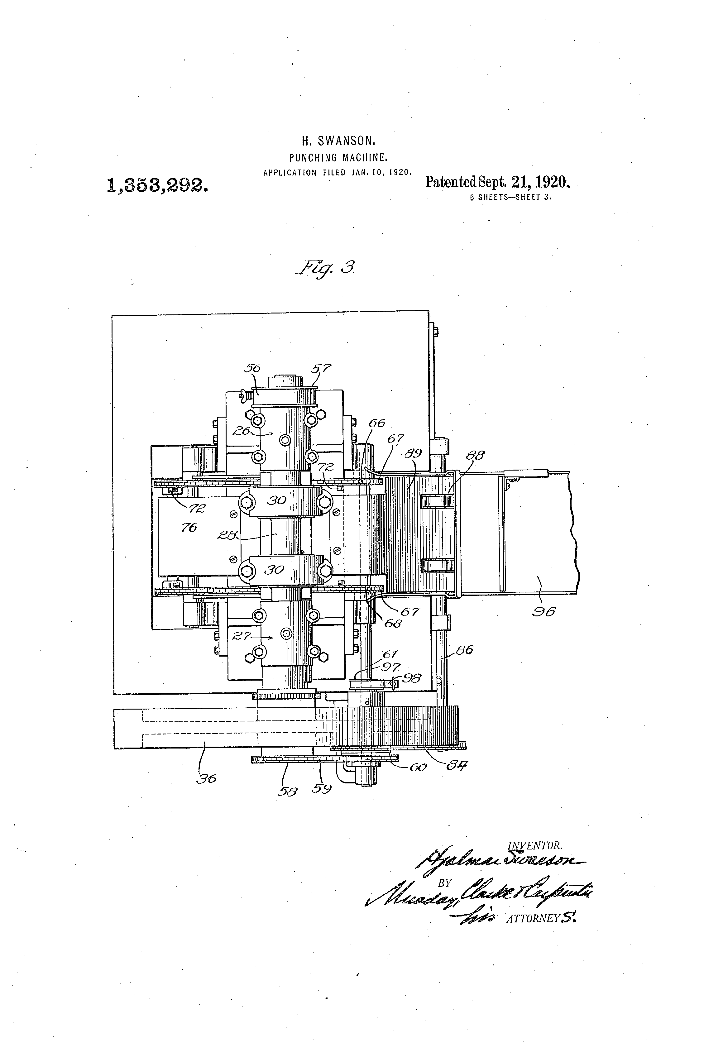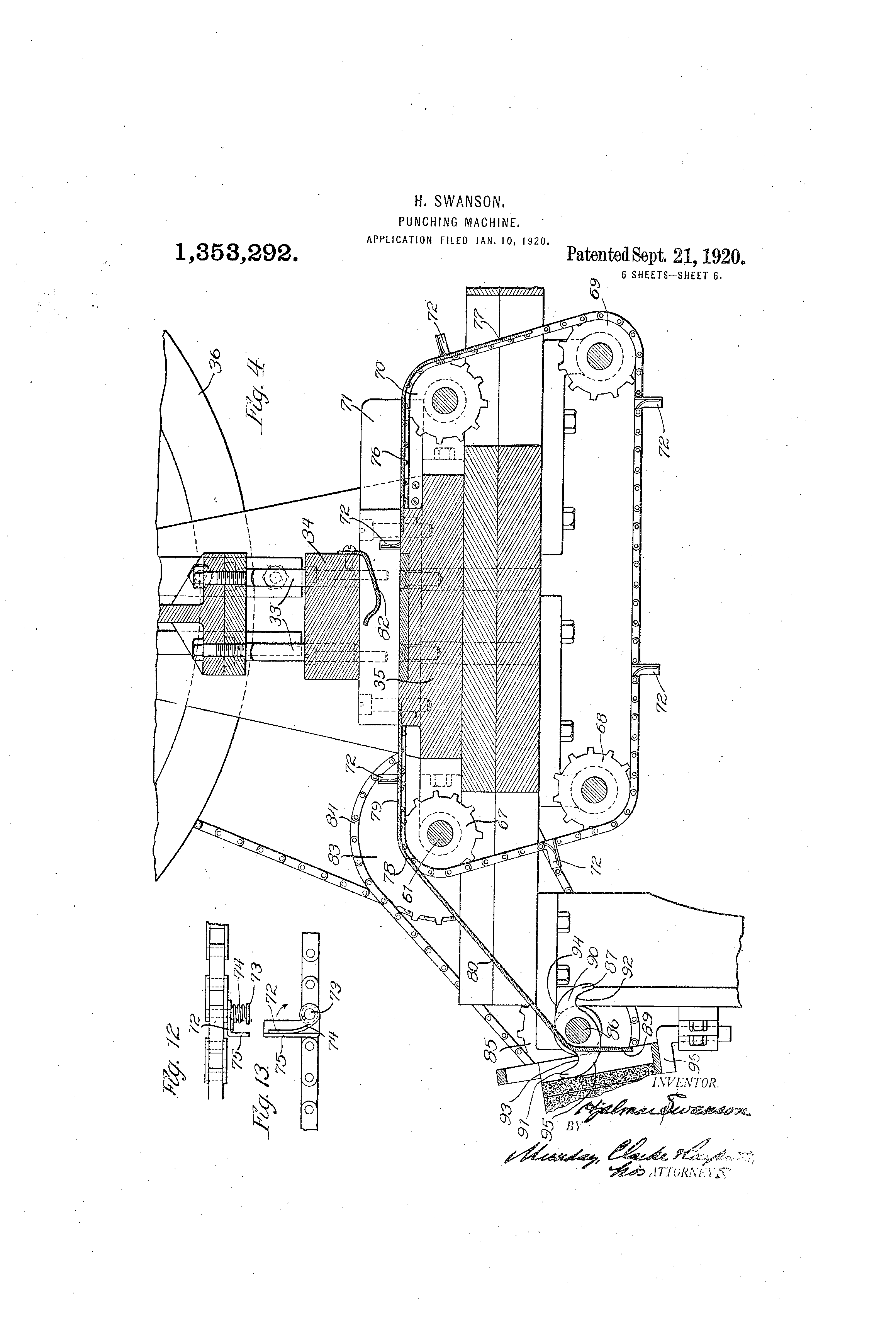 UNITED STATES PATENT. OFFICE. IIJALMAR SV,,TANSON, OF C-'Z,-ICAGO, ASSIGNOR TO CUMMINS PERFORATOR COMPANY, OF CI-IICAGO, ILLINOIS, A CORPORATION OF ILLINOIS. PUNCI-IING-31ACIIINE. 1,353,292. Spec-ification of Letters Patent. Ptteiited Sept. 21, 1920. Application filed January 10, 1920. S,.-rial No. 350,627. Toa@tivhov@iti ?za,y con-ern: Be it known theu I, HiALiUAII SWAI-TSON@ a citizen of @uhe United States, i@esidin& iii Chicago in the, count-y of Cooli: and St,.tte o'L Tlliiiois, h@,@iTe inventea x ne-w c,-,id usef Lil Improvement in Puneliing-M,,tcliines, of -,vhicli tII6 follolvilig is a speciiic"Ltion. This inveiition relates to peri-orat,@ii(y or ettneeling macliines and the lili:e,,,tiid has l'or I 0 its uenei@@i,.l object ti-ie proi,ision of ,t gii-yiply coiistrliel@- ed tliougli highly efficient intcliiiie of this charicter, Nvliic@,, eilil)o(,Lies aiiiong other f-eattires, a novel alitom,,ttic feed of tl-ie .Ynaterial to -end froni the puiiehi:a,, o-,- cti@- 15 celin(- inechai@-.-s-m, the -feed o-L:L@,li(- -in@-ttei,ial being so timed Nvitl-i rel,,ttion to the operation of the punching 'or caiieeling- ri)echa.nism th,,,t m,,tteriall is pro--ressively adv,,tnced into the path 6f the . pu '@ching Lechanisin, 20 held in position stifficiently lono-. to pern-iit the puncliing inech,,Lnism to perforn-i its operation, ,tnd is then ftirther adv,iiiced to the Point o'L clischarge. A MOT-E detailed object of the iiivention 25 is tO Construct the feecling mechanisin in sucli m,,t.-nner that althougli hiahl@y e-i"ilei-eiit for performing its function oi - PLeedink the in,tteria,l, p,,trts of said feeding rnech,,tnism -,ire ,tdapted, on encounterin-- Lii-id-Lie 6r dc30 str-tittive pressures such as oectir -'L-Le th-e machine becoi-Des jamniecl, to yiel-,', ind to p-revent s-Lich presstires from c,,iLisliaoinjury to p,,trts of th6 niacliine. The invention has for othe@., objects suelii 35 other iml)j-ovements i-n coiistrlictioii tncl aclvanta(les in oper@t-tion as m@ty be i-oun(I to obt,,tin iii the mechnnism lier e'Ln@),fue,- de t,scribecl or claimed. in the @tecompanyin(y cli-a.wiiaus, forming a 40 I)qrt 6f this specificat-lon and sionvincy for pilrl)otz.@es of exemplificitio-n, ,t prefei,red form ,tnd rnanner in which the inveniioii m,,ty be embodiecl ,ind practised biit without .1iraitino- the cl,,timed invonti6n specificaII3, 45 to stich illustr,,tti-ve instanee or instances: Figure 1 is ,t front Olev,,ttion 6f ,t perforpting mechine COD8trLIcted i acc6 clance i@ith n r tlio inve:iition; Fl- 2 is a side elevation of ti-ie s@iine look-, 50 ing fromtlie ri-ht of Fig. 1; zn Fig. 3 is ',L top plan v.it,,w; I eniar@@-ecL vertic,,tl secti.orltil Fi L,-. 4 's ,ti ion ti@t@icen c @i (@, v,@t nti,,,tlly in t pl e -n dictited by the line l@4 of Fig. 1 Fig. 5 is an enlltrged horizont,,tl seciional 5-5 clevttion ttl-en s,ubstan-'Uially in a pltiie indicited by the line 5-5 of Fig. 1; Fig. 6 is an enl,,troed liorizontal sectional@ eleva-ti6n t,,tli:en sLibstanti,%Ily in t plane indicated by the line 6-6 of Fig@ 1; 60 Fig. 7 is ,tn'enlarged det,,tiled vei-tic,.tl seeti.on,,Ll elevation taken iii t pl,,tne iiidicated by the line @ .7 of Fio-., 1; Fig. 8 is Itn enittrged det,-iiled iertictil.seetional elevation talceii in ,t plaileindic.Lted 65 by tlle line 8--S 4,' Fio@ I Fi-. 9 i.s a.ii 4et,.tile-' verticil seetiolial elevation talzeii in @ pla;ne, inclicated by the line 9-,9 of. Fig. 2; Fig. 10 is a fragmeiit-,Lry det,,tiled vie-w of 70 the driveii SI-iift lookiii(y from tl-ie horizont,,tl plane ,in'd@ in -the direction of the arrows 9 10---10 of @Fi . 8 I Fig. 11 is an enlarged deitttiled -vieiv of the eltitch ctm lool@:ing f@om the pl,,tne ancl in 75 the direction of the arrokvs 11-11 of Ficr. S; Fig. 12 is an eiilarged ciet, tiled- toi) i)l@@n i,ieiv of a fra--me@nt of -tht feecl chtil@. Fig. 13 is t side elevatibn of the p -,I . As illustr,,tted 'in Fig. 12; iind, 80 Fig. 14 is ,t perspective of a b-Lindle, of bink notes per-'Lor,,tted by the m,,tchino, ilIListrited in the dr,,tivings. Th6 sqme characters of refe renc6 clesigntte the-s@Tme pcttts throughout the sever,,tl 85 views. In the ilIListrLted embodiment of tl-ie inv6iition the m,,tchine is especially de igned for the purpose 6i periori-ting 13-,tckages or bundle,@; of baiik notes and the like and for 90 convenie nce the present cl(@ scription 6f the machine wil.1 be corifiried to tl-iis use of ti-lo inveiition. Fe,,ttures of coiistr.uction of the maclii I ne - are retdilv slisce othe ptib e o-L r iises, howev@r, and it is manifest that the 95 scope, of 'Che invention is -7by iio means con-'tined ito the s.peeific tise ,t-.ici @recific embodiment herein described .Ls a;ia: illu,,@tr,,ttive ex" ,tinple Peferring to the dra-,@@inas the varl'ous 100@: p,,Lrts aiicl th i s@rumentallities o4! I e n t -.le ina@ chine tre stippo:rted by a t,Lble or platform 21. Moui@t ecl on the ]Dlttf 6rm 21 ,tre i:)edbstlls 22 t]]Ld 23 provided tlong their iacing, vertic,,ti sides Nvith:@aLlides 24 a.nd 25 ,tnd Llso 10 5 havin,- dt tl,,Ieir ilpper ends b6tLrin(ys 2o anc-, 27 -vvhi(4@ mLitLi,%1137 siipport ttie Ziin h6i-izoriL,,,tl driven sh@ft 28. A pair of e,,centfies 0 1,353,292 29 is mounted on the ,tfores,%id shtft 28 cind support6d by the respectii7e ecceT-it,.-ics 29 Itre collars 30 respectively pi,ovideci del)ending vprtical arms 31 -%vhich tre -n-iutti@-,Ilv pliroted tt tb eir lo-Nier ends to ,t f i-,,i me 32 motiriteci for vei,tictl sli.dingMOITC'rflepb' ill the herei-,:,.befoi,e mciitioned vertic,,tl guides 24 -.ild 25. T'lle '@rime 32 supports zt plurality oL' I)tiiielies @,3 ,tOtaptecl to P,,iss 10 tlii-oiligli @i-Iiiied holes in "I horizont,,il ('-Uidiii@y block 34 SLIPPC@i,ted by til-e loiver encls 6T tl-ie peCiest,,Lls 22 @Lnd 2'0, @tn(I to co6perate -vvith dies fornied -tn the die blocli: 35 moiinted on the platform or tqble 21. Witli this con15 structioi, the punches 33 ,tre loivere(l, ,trid eleva,te,t i-iito aiid @t-NVt)T 'L@roi@n the dies 