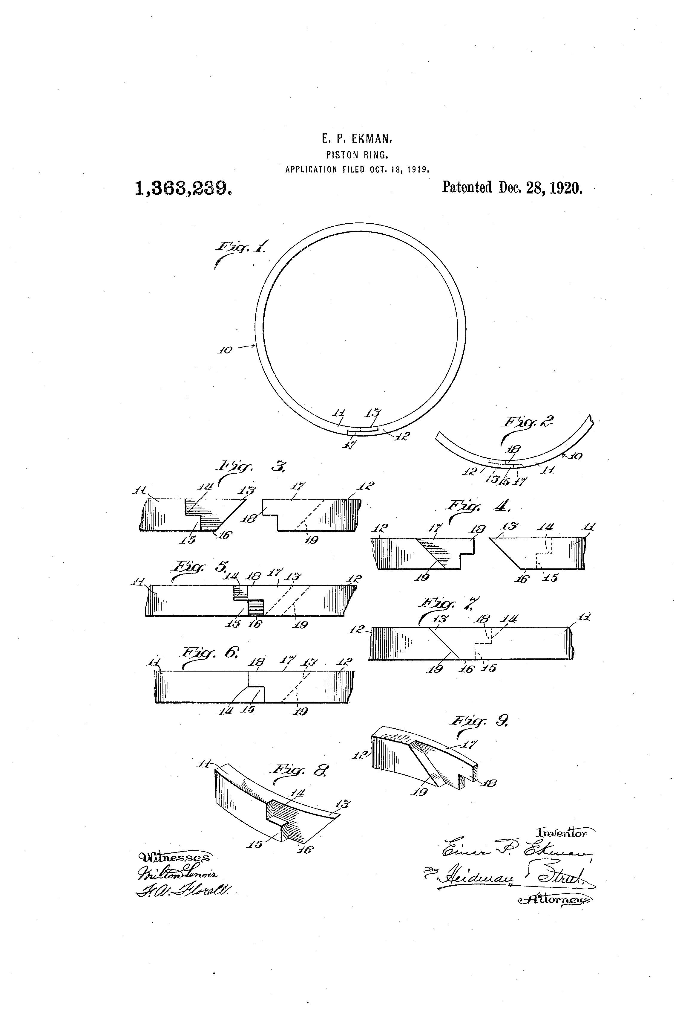 1)363@239 depth aiad prefertbly of traiisverse ividth equal to about onehalf the thickiiess of the ring. As sho-wn in the (lrawin(y, t'lie recess 14 is preferably of subst,,Lntitlly the sime dimensions as the shoulder portion 15, aiid the length of the shoulder 15 is tlso preferably of the same len(yth as the base 16 of the tono,ue or lip 13. fll'e other end 12 is fo,-med just the op10 posite f rom the end 11, aiid is adaptecl to articulate with the end It. The end 12 hlts a tongue l't integral and in circumferential Lilinement ivith the exterior stii-f,,tee oi'7 the ring; while the end of the, ton(riie 1--@ is 1.5 kerfed so as to provide an extensioii oi, I,ip 18 of dimensions equal to the recess 14 of end 11; and therefore providiiig P, kerf o-f dimensions equal to th.e should@@i- 15, ii-i orcloil to permit a complete doil-e-t,,iiling of these 20 parts. The tongue 17, like tongue 13, is ,ilso slibstantially half the tl-iiekness of the ring, so that when the two tonglies ,ire broiight into overla ping relatioii, the combiiied thickP 25 ness is equal to that of the 1-in(r 1. The end 12 adjacelit to the tongue I-,, and on the iniier surface tliereof is clit (- Ii,,i,go,iall at the same degree as the diagonil fory m,t -I of ton(,Ue 13, so ts to provicle the , tiol 30 slopiiip-- shoulder 19, -which iiielines ,irdl@7 W, from the other end tbereof is clearINT showi@ in Fig. 9. The base of the sh6tilcl@,., 9 is i-emoved from the lower oiiter en(I of the tongue 17, the same distance ',LS the 35 sh6ulder 15 is reii,.ioved from,the loyl,er.ei-iCi of the tongue 13; ii -i other -words, tlie @-ai-io,lis toii-ues, kei-fs aiid shoulders ,ire all o-E coi@responding dimensions iii order that thei,e n,iay be complete artictilition 6f the ends 4o ,tnd 12 when the ring has been compresso,,l into completely closecl conditioii is li) Figs. 1, 2, 6 and 7. Witl-i the colistri-iction shoivii ai-ici described. it is tppareiit th,,tt tb@e di,-i-oi!-il, 45 tonaue 13 and clia-onal oi- slopiii 9 19 will preltent the ei-ids separ,,ttliig iiito lion-,,tlined relitioti through any d o@17niv,,ti-d pressi,ire exertecl on the riiip, as I)os;ti,)iief-I 'jii tlle dr,,t-wiiig; while the shoiildei@ 15 aii,-l tiie 5o lip 18 will intei-locli: and m,,tllltain '.-he, ei-i(is in ilined relatioi-i duriiig aii3, Lip-",ai-d pi-esSur(" oia the rin2@ as posiiione(l. i-Ti ti-ie dr@-ti@,ing; tllis inte@l.ockino- relation being, of cotirse, m,,iintained @irlien the riiic,r an@L pis,g5 ton@head hqve been inserted ijito the evlinder. My improved ring, therefoi,e, provides ,t double seal as it were, -which iyill preveii4l the gases escaping transverselv or directly through the split eiids on the coinpressioii 60 stroke of the piston; @vhile at f,lie stme time ,t joint is proiided Avliieh Aiill PI-CITent pass,,tge of oil durina the reciprocatiol-I of the piston, is iio opeii pass,,i(ye by -",Iiich ftuld or oas may p,,tss from.oi-te side of the riiig 65 to the other is presel-ited. At the same time a single piece rin- is provided which will accommod,,ite itsel'f to a;ny degree of exp,,tiision, ivithin reasonat)le, ',,imits, aii(i yet eiiable aii iiiterlocking or ,irticul,,ition of the, 70 ends so as to prodiiee a se,,tl ,I,(F',Iinst a,,is oi, Oil pass,,ige. The colistriietioii shown tiid desei,ibed f beli;eve to be thc- simplest aiid I)est eml.),o(liinent of my iiiil-(,,ntion. I)iit n-io(.Iificit;oiis 75 m,,Ly be i,,,iacle ivithoii.t dep,-,i@tii-iofroiri tl-,c,, si)irit of my ina-ention. Wh,,tt I cl.aim IS'A transversely split, oi-' tb(,, charactei@ described, oiie,. eii(I \ibei-cof is i-e- 80 dticed oii the oviter s'iiri'ace the-ee,,)J' tji,@, other eiicl is i@edticed oi-i tl-io, iiiiieithereof so as to permit 4L]iem to reduced portion of the first iiteiitioiic,,d eii,d tei-miii,.iting ii-i ,t bevele(-!. ed,,e. Nvitli the 85 of the bevel disposecl toivard tlio opposite en(,l of the rin- Avhi.le the secoi-t(l iit(,,-iitioiied tD@ end is providecl witb ,t bevelcd sholildei- oil the iiii-ier stirface adjacelit to ti-,O, l,ecluce(l portion thereof, correspoildiil(, with the 90 bevel of the first mentionerl end so as to eng,,Lge therewith. the redticect portion of the inelltl'. ed end beyoi-id the - bevelecl shotilder bei kerfed to proA,-i(le a lip in cii-cui iferential alinem.eiit ivith the tip or 95 @.),pex of the beveled edge of the first mentioiied end bii,t tranSITerselv oft-set therefj@on-i so as to overlap siid'first mentioie@l e@t-id, while the first mentioiie,(-] encl is r(Ileessed oli its outer Surf@ice to correspon,,l loo with aiicl to i-eceive S,,iid lip tiid to pro-@-i(l@,, tL shoulder on the outer stirface It 1, point adjacelit to the reduced portio-Ti -' I-Ii,- fl, st OL L melitioned endi ad,,tpted to exi@encl ip.@,o the kei-f of said second mentione(,l elicl, the (1-- 105 gree of bevel of said bevelecl eiict @i:iicl the shoulcl-er iiid the lencytil of slid lip oil, e@xteiision and said recess bein- ill corr(,,I,,tte(I so as.to permit contractioii of the ring and provide a eoi-riplete intei-locking jiiiietui-e, lio between the eii.ds agaiiiqt sep,,tration ver.ti.cally in one direction by s,,ti.(l be@Teled eclgo, an(I shoulder and in the opposite (I,r et' i e ioii I)v said superposed lip ,ind shoiildei@. EINAP,@ P. riKMAN. Witnesses: G. I-TEIDMAN, F. A. FLORELL.