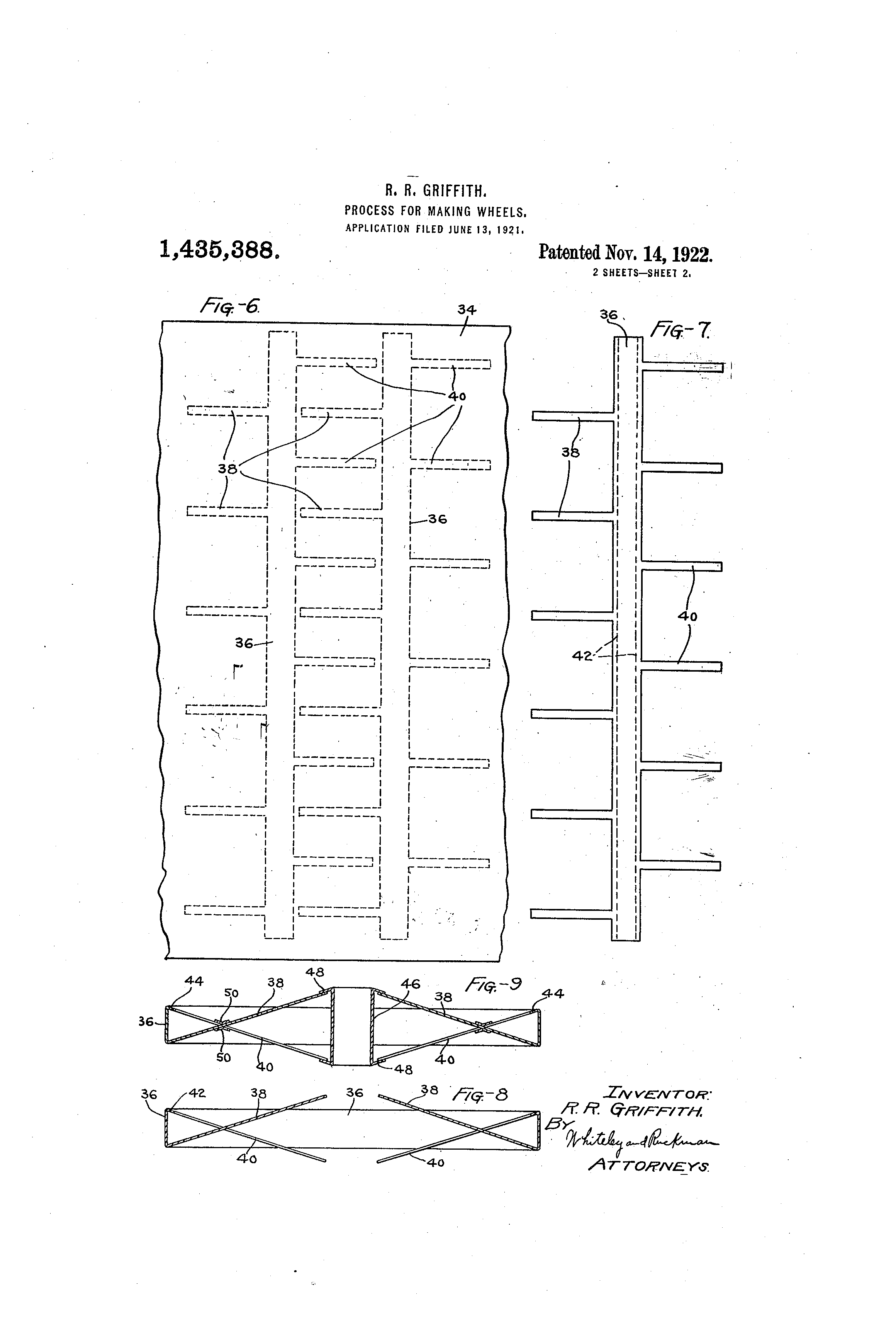 meral 34, @iesigtiates -a blonl@c of,c sheet i inetftl@ lier. asb3,.;spotwpl,.I-',@ no,. Ther spoke. elements from Avhi c@ tlle s@ructure showii. in;. Fiol@. I'@ are,@pre'Leiqbly reinfo,-cce,,L .@'fyy sectirino_@ E@- pair 35 is cut o-Lit. The manner in which this strue- of ,innular members 50 tjiereto on oppos'te tui-e can be cilit out to sav,@-,,materiiil. is sho- n, sides the,.) spokes, cross from one si-de in Fig. 6 This structure iiieludes 9, rii'll inember 36 having a, plurality . o-LI @ intogra;lly attacl-ied spoke elements 38 extending fron-i one siele and a pli:trality of inte-rall@ @i'tachecl. spoke elements 40 extending from.the io o 'p6site sid@. 'The iem'entg @8 and. 40 are p ti,r,.,ano'ec.-I in staggerecl 'r'elailoii with respect to eaell otl@6i@. After tlie@ striieture sho"Tn in i" bas been pro'Nid6d, the @l@i me'zmb-er 36 is rolled iip into i-ino@ - f'orii"i -aiia- the @nds 15 t@liereo@ secured too-eth-er in suit"tible 'm'anne'r ,t's by, sp6ti@,eldi'no-.' The sp-oke elements on b6l,-,I-i sides o-i' the rim @membep tre" .'bent b'ack. I . : 00 t s -vn in tliroti,)'h ,t littl6 more,'than 9 s hoN F.Ig' 8 to thetii the ei-6@s @6lation s@o-,vii. 20 This bei-iain@, is @@ef6r@bi@ d lines 42 sl@ON;i in Fig. 'I, on tohfa ncoltit@ees instp,adi o directly,@t the bases bf the s@6ke elements. TI iis rna,.-incr of beiidinc@- @i,o,,icl'e'c@, i'nwarc-.Ily e@iteiidii-i'p- flanges 44 -@ro-,-,'iid both side@ of the; 25 rim. TI-@@ sli@ping of t@,:e l'im iiii6 ri@,- I-orm ancl,' the bleiiding ba,ci@ 6-o.tilp" @poke eleineiits ma . be, peiTormed i@. a:6y @uit,@ble man@n'eiy i . . ,is by the use of shapino- (I i e.- -@,ft@@ the of the wheel to the other. The -wheel when finished has. t@ie - same appearance as the form preN,iou@-ly du3ci-ibed and referred to in Fig. 40 5@ in 1,6 'A;nish@a c'ondition. The aclvantp,-es of my,prpcess a.re obvio Wh@!Bls haiingo, o,r@4t sir6n'gtb nn'd,dtir:ibility cati b@,!c@caply, @re,adil nstru6@ted from y, co pqrat' is greatly f OQill- 45 sheet,metal. The o ion tat.e. by ctitting, O,U,L 'o, -Tie-, o'f', tl-i6' Avheel members -vvith, integr @ly 4@aphe,,d. spol@o, elorgents. 1 1 c ai The proce8s of makii-ig Nvheels Nvhicl@;consists i4 etit.tiiio,-. f o sb e I ,t heel o II I ,I @- - r rn, i4@tE@ W , member anc iiiteo-r ally, attaclied spoke@ Cl@B7 m:@e'n-t';s', sha'pino-,tbe cLit-6tit struettire iiito the foi-iii Nvhici-.i @it O'ce@,ipi s in the, @finislied Avh eel by @endino, saicl wheel, member into circular T-or;m.,,tnd,b,@, bendi@@ s@i'cl sdoke clemelits 65 b,ckwardly thr h 900 to caljse, s@'l@i's@oke elem nt,@,to ei-oss from on side of tho wheel to the oth-er securino, reinf6reinLy annular @ me ers , to, sa spoltl@, eleiiients Avl,iere, they tl-iiis cross and,t@pn, securing the 60 ot-l@er@@vl@' @l s 1 eel meio,@r,t t fi:ee e cl 6f sa'd Q , lij@, spoli:es h@ive been, given @ I tile cro@@ @elation @ s-Doke elements. 1,10 ... @vhereof.f,hq tinto afrjc my 30 s NVII in r@i-, 'S ah-Lib 46 'of 'the proper, In testimon aiict having 0 t-tlirne@l fla@ A8 igl@ature", u es is s e" 7@e inner' ad@ed by se@iiiii-i the flaii @,es. 48 t'6 encls of tl-ie spgke@ 6lements in suitable manGRII@F'ITH.