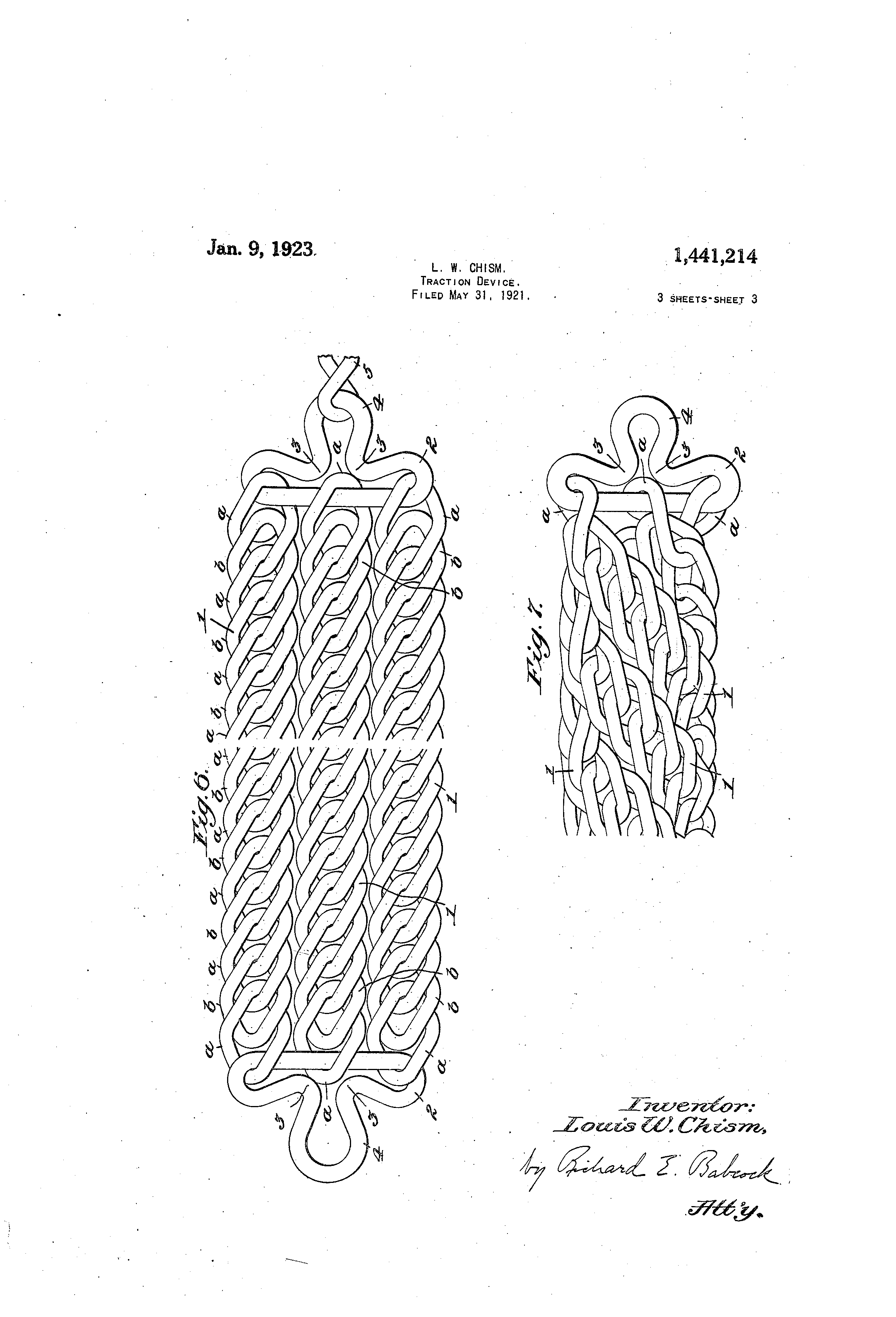 li441@9,14 linlis ")f 'uhe chains -11 co-,inecte(i t6 the iiolclers.2 to guai@cl ,tgainst r-Libbliig ag,,tins't, the tii-e b-,, the h6ldei-s 2 or the teri-p-iiill@l li'nks (t o-.@@' the cross-chaips. whiet-i termina@li:s because of thei,,@ connection to the holj,ei-s 2, are sli,,-I-itly Iii-ii-ited in MoLi6ii Or stiff" a, @ilso t(,@ gii,-,rd ,to-aiiist rtiboing au-,iins'Ll Tlie@ t@tb chqi-n ,5 is then passed throiil"h the i\,heel, on one -,ic",e of sa-i(,-[ si)ol@e. t@breided thro-Ligii the lo@1) 4of the liol(@.ei@ 1), to -,@,-hich it is not peimt-.ieD-tlty attaelie@,,., tlien bi-ou,-o@,lit -@ie oLIiei- s]Cie tiie coi,- 15 -qecto?, PA, t@ii,eqdeci into the netrest link @lo @ki-,e 'ioo-o I OP t b fii-st --@,nentloiic,(i liol(',ei- 2. nector F@ is liooked lioldei@ '-). T-' i.s I'l -,rrtL-geinent limit tl-i 20 peripllel-,I,I, ov pl-ac-tielllv prevent. the 'ier@il, movc,,m nt of t@e -ccnit ivi'i reperipi e Ul l,ttion to the Av.ieel. 0,'@ course i-t is not esseiitial tl-i-,)t the tal) 5 illiistr,-,tecl be eliiplove,-I, or tliat, if iisccl, eitjier o-@' i@(@s e-ncis 2 -0 be peryiiai-iei-itly connected to eitb(,r ho'l-cler 2, i-ior is it essen6al that tlie, -"c. coi-inector E illustrated I)e Lised. lvhile this nne@ctor has -iven s,-,'(Iisfac (- @'Tilts, s of connectors vtill 'Coi@y other form S-L, rice. 3o In 'Lhe modification shown iii F-igtires 8 and 9, by ii@i,,@v of-. -LpLir'L-"Iler ex,,'tliiple oii-ly, the consti@tiction ancl oper,-ltion tnd mocle of applicatiod. -ure the same in the forin above (-Iescril)o-,!, excep'L tiiat the t-,vo otiter 35 cross-ch,,tiDs l@ oi' tl-ie scLi(I ,tbove describ,-d foriii are replaceet by crol-s-chaiiis 11' coiisiderably siiialIGr ii-i crosssee'Llon th,,tii centr,,i,l cross-chaiii 1,1 tllis CoDstri-iction resiiltiijo, in foriniiig t unit, the port,,o--@-i T@'-\vhlch ivill slope from tl-@e eenter tow rd 40 0 a sicle ai-id so inill sv@bstantlally redtice the sliock or jar ea-Lised t)v the tr-tetion --ooi-tion as it stril@es an,-l lerves tiiie@ o,rouncl. HaA,in-o- tliiis described n-i iiventioii, y 45 what I claim as n,-", ircl desilre to se,,,iire b Letters Pptent is: 1. A wheel and ,t tire iiioi-,,n d Iliere?ll, "le " co@-iil,)@Iiia'u'lon iv'th a tr,-@ctio,,-i device inotilife,l on sqid wheel ,tr@,d comprisinl,- a 50 cross-ch,,ii-ii, exteiiclin(, -t,-ross the ti--eacl,"o-le the tire ai-id consisti-,iu o@L' tivo series of Ion ' tidin, ii-itertlireide(", ti@,isted '@inks, @git illy -' aiicl 1-iieaiis con,.i@@eted to the links ol' oi-ie of stid serles of linl,:s for securi-n(r 55 sii.cl cross-ch,,ii,,-i in i-iioii-@ited. i@ela-tion-Li-Do,, th@@, -vtheel, whereby the linl@s of each series ,,Ire left Lill(listrLrbed ia,-itli . relation to the I.Iiili:s of the otlier series and ,t ii-iiiform flat surface will be presented to the tire tread 60 f-,Lce. 2. A cross-cli,,till for ari,aiio-ement across tl@e 'Lreaa of ,t v,ehicle tire, s@ticl cross-ch,,tin con-iprising. a, pILii-alit-y 01 101, 9111-,ClinaII3, arran(yecl iiitertlireaded , caell linl@@, ex6'5 cept the links at the en@t portions. havin(y t' e b I ir v LI-te tbed- th-is coii',-oop 4 (,f this e ,ill- le@tst four other threaclecl t@r6-,igl-i it, tl-ie cress-sectio@,i@ll area '6'L en(I of eaci@ li7,-ik reizi@@L:lon tci the ,trea enclose(I y ti-k d6te,,.rp:iied 1,, 'he niiiii])el'-, of tlire@icied therethroti(yh 70 wl-iile ji@st, siifhelent roo]7ja for the li@-.ilcs to tti.n on eacli othei, to ,jei -Amit fl-exin,,- of the cliein. wlierebv the cross-el-tain 'Is ,@7itil I coinposite sul)- staiitiill.)7 Lir)-bro-'L@ell si-irf,,Ice for enua(yement 75 t'ile tire flexibility of tl)e @liain. ti-a -t;o,-, ,,',civicc@o, on -kA7heel an(i ,.i l@lr@rality of crosscli,,Ii-Tls 'for acros,,3 'the tread: of (9 0 -LI-IL 'Uii-c tiiereol'. @@@teb eonsistir-ig o@' t 0-IL lo,-i(yitii.cliTially ari-at-lged each linli:, except the I II l'iiks ,tt t' e eiid portions, li,,LA,inu @it least -ilotir otliei- '111@Ics tlj-reacied throuo,h it the 85 cross-seo,@-oii,,,,l area of each end oi each lii-ik 'th r6l enclosed b s,,tid v@T I ,itiol@i '0@o tile v by the num@er of si@niillll,@: thre-,Lc'ted therethrougli - while le,,iiing jiist s-,ili-icleiit room for the indi-vicl- 90 -uial to oAa each other to perii@it (i- thi@ cb-,Ii-n, -@ithereby each cross-clipin is formecl with t. composite subSt e -ti s anti,,!!]-,; Linbrok tir-'L@ace for eno,,,,,oement b@ the 'c'@re witho-Lit s,,,,crificing flexibilit,-@ of 9,-) the chal.n. 4. @'@ wheel and a tire tliLereoTi, in combinatioii witli a traction device mounted on said ivheel aiicl compt@ising a cross-chain extendiiig -@ei-oss the tread of said tire and coi-isist100 ino- of t-@yo sei-ies of lon(fitudinally intertili-eaclcc-t 'Lii-iks, ea6li link of eacli sej--ies beinu 2-ii, cii a substantially unii'o,,@.-tl'l t-@vist of ,,t least 90 defyi@ees iiieasured between planes tangent at the eiids of the part-icular links, saild'links 105 ill Lei@,g ti,-,isted iii the s,,ime cliree'U;@on, ayid each link of both series being I siibstantially of the s-@,me size, proportions ancl sliape as each of the otl-ier lijiks of both of said series, ivhereby a fi@Lt sn-iooth siirface of a flexible 110 ain is present rope-like ch ed to the stirface of the 'uire. 5 An inde eiident tr,,tetion u-Tlit for arp rangemeT-i'L on a wheel and comprisitig a pILi-,!alitv,6-,P cros@,-eliaiiis. i-i ari-,iD@,ed rc,,Ia- 115 tioii, extei-idin.E,,, across the tread of the wheel tii@e, eacli cross-chain consisting of a plurality of series of lopgitlidinally iiiterthreaclecl tayistecl linl@:s. tincl nieans connectecl to the terminal links of one f s o aid series of linl@s 120 of the respectiie crosschains for anehorin" saicf elloss-chaiiis oii the ivlieel, - wliereby tll@ liplcs of each of saici series are left - Li@clisttirbed ivith relation to the Iiiiks of the other serie's ancl a tiniforni flat siirface wi,ll be 1 2,,5 preseiitecl to 'Uhe tire 'he said means being formed to h6ld said,.t-erminal linl3:s of the respective cross-chains in sp