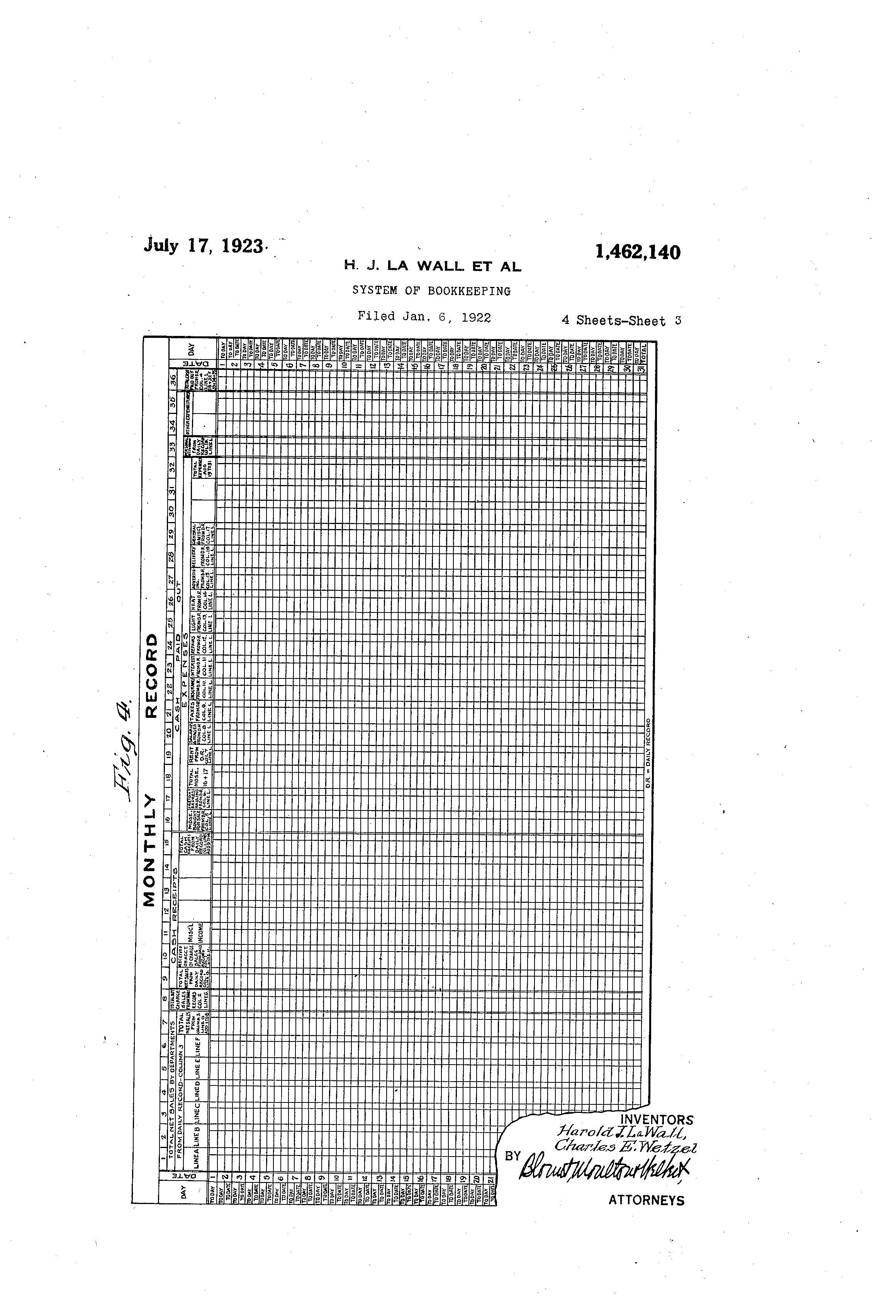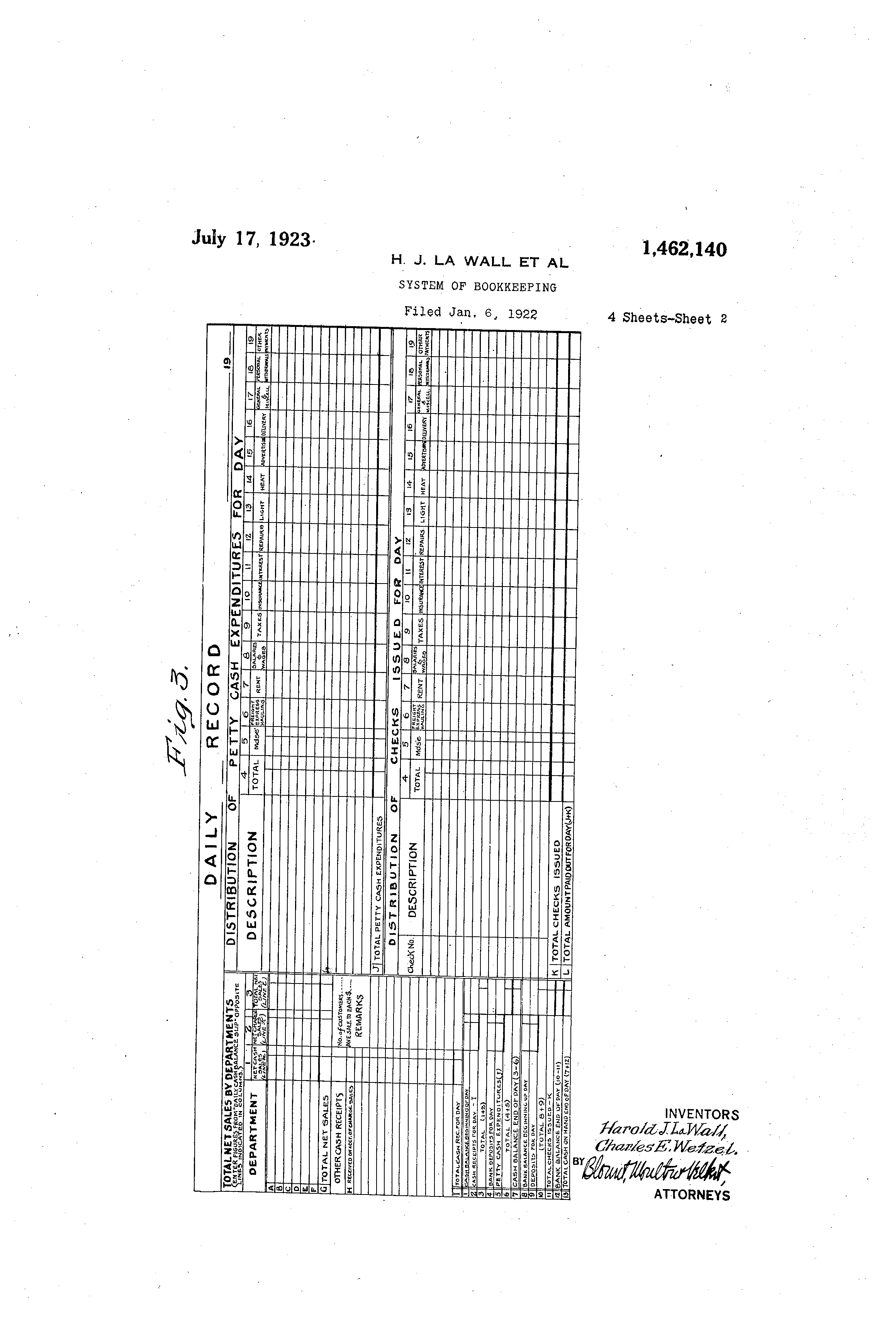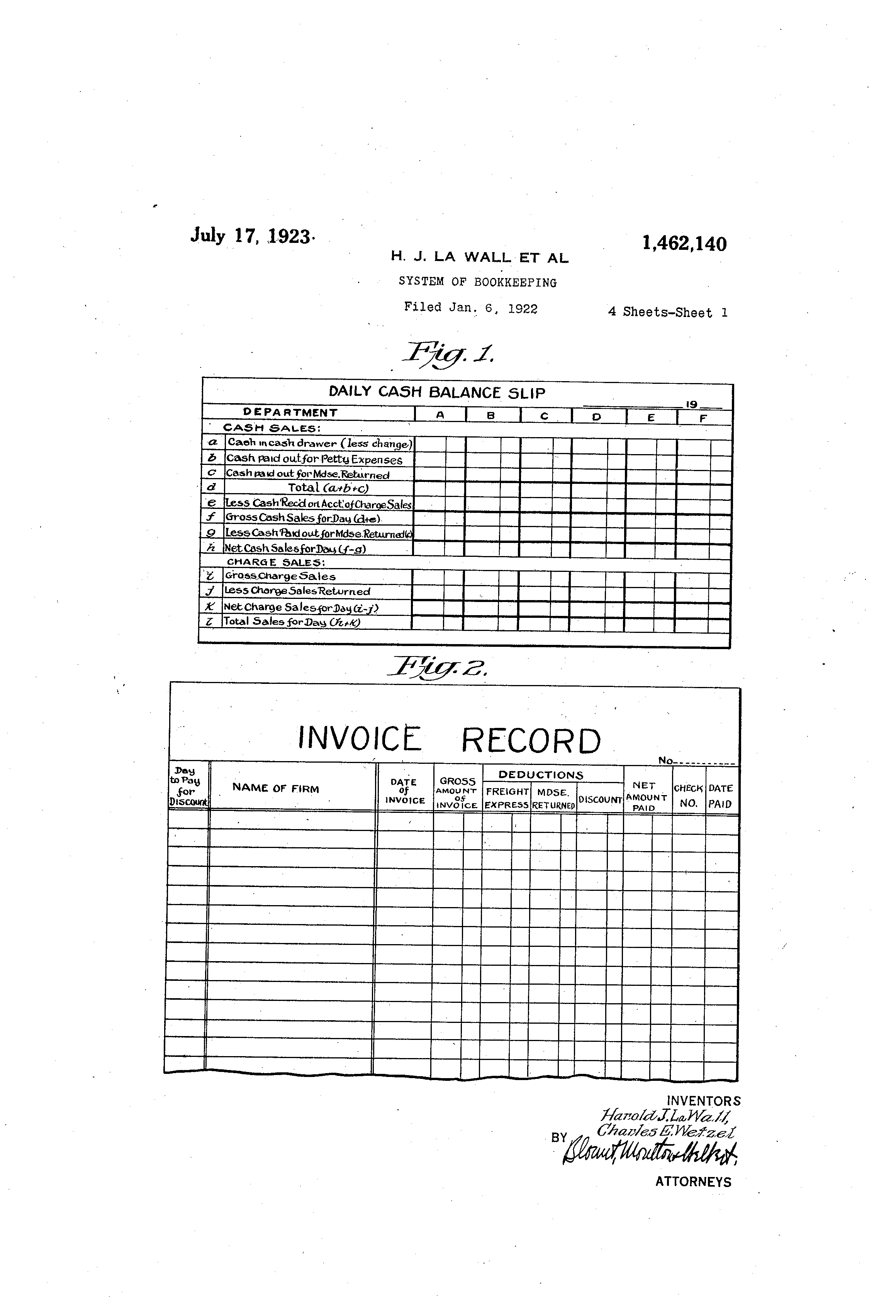 Pate-nted July 17, 1923. l@462@140 UNITED STATES P I ATEN.T@ OFFICE. HAROLD J. LA WALL AND CHARLES E. WETZEL, OF PHILADELPHIA@ PENNSYLVANIASYST7-B-1 OF BOOKXEEPING. Application filed Jan7Liary 6, 1922. Serial No. 527,311. To (611 qoh,o7??, it ma?/ colacer",@: Be it ITilown that IA'e, I-IAROLDJ. LA WALL ,q,ll(l S E. IVr@TZ],@L, CitiZeqS oL the Uilitecl Sta:Los, residiiig in cotinty of r-l-iilaclelphia State o-E 'en sylvaiii,), ip-vei-.ttecl certain iieav aiid' u8eful ID@ipro@TC'mcnts iii Systeiiis of'Booki@eep1119) of @vliieli 1,@he follo)l'ino- Ij L specificatloii, reforeiiee beiii(,- had tberein to thc"- ae10 conip,,tnyiia(>- clra@vinol,s. t, Our i,.iveii@-ioii i-elatcs to o@ s steiii of booky IKeeping coiiiprisiiig a se.-ies of fornis Nvl-iieh iii,ty be prilited or other@N,isc@, i@eprodticed aiid eiiibodied in boui-id bo,oks ol- loose, leaf 15 bi-nclei@s @ind consti'Lute ,@ eomplete recor(I of t',Ie cliily ti-ansactioi-is, @litli inonthly ti@id yearly siiiiin-iaries, iihei-eby coi-iiparisons ,iia37 be m,.,cle at a o-lai-ice an(,l the stat-Lis 6T the business aseerttiii(,,cl at.al@y tin'le. 20 A I)rlncipal object of olir inventio'n is to p@@- Ol'ieic,, ci s@,,sten-i o-.c bookl@eepip-g particti7 lftr'IAT a@tap'Lled -for us(, b3, ret,,til rierch,,ints or in si@all busin,-,@ses, el-iar,-cterized by sLmplicity -ii, iise and noL r-qtiii-,in@,, t sliill@d. ki@owl25 ecto,o of boolcl@:eepina- Nyhei-eby the services of- a bookIKeelDai- i-,iay be clispensed @-jitli, .hi-is ofiectiiig i desirable economy in the operation expense of- tb.e small iii)er@hant. A -further obj.e-,t o'L o-Lir invention is to @@o provid(-, ,t simple aii,-l coiiil)lete cash s stem y of I)Ookkeei)ii-i,-, eiiibocii,@n@,- i@oi@p--is nenv aiid origill",@ll III tli@ir desi-@,ii subgtai-iti,,ill selfy explaiiatory iii t.,)eii, tise, a@,--d -"7hich may be '@e,pt by the iiiercha-,it o@r -,ii enployee eATen if ,15 tl-iey do not have the I-Knowled-e o-I b6okkeepin(,@, tisually reqtiired in the coiiduct of @ti busidess. A T-urtlier object 6f o-Lir inv(,,ntion is to proA7ide ,t simplified system of booli:li:eel)- 40 in(,, in ivhicli the sliii-@ results I-I'lay be obtai.i-.t@ecl as from the use o'L a set 6f double en'ury books. A T-.iirther object of our inveiitioji is to provide ]'-rl a system of bookl3:eepino@ ,t set of 4,5 iiew aiici or@ginal forms so, arraiiged tli,,tt the d,,lily transactions or the ao-o-re I (rate of the Z-1 z@ zn dail), transactions to an), d@).), of any month, the i-tionthly transactio]3s o@ th-, ao-criegate tr,iiisactioi,is of tRy nui-nber of l'i'lontl_ls, compariso-,i of the,months' busliies@ duriiig a curreiit yc;ar oi- w,@th the c6rrespondineII-iontli oi' a pr(- i,ious year, the i)rofit for the yea.i,, an,,! the st,,ttement oi assets ,t-.id liabili@t,l'c,s f6r the fiscal year ip-ay ea6l@ be ftsI certained at sin(,I- @lance a:nd without requjy,jng the turniiig o-12 pages or referring to RUIrer0lls books. l@L @f--Lirther object of otir invention is to proi,ide a s@ste,-i-.-i of b6olKkeep:ing whereby th,, porati0ii O-E ii-icoi-rie taxo'r ol,-I-.er gov- 60 !Dr. tax ret-Lirns may be I accon I iplished ivi-tli t niiniiiium of evj'ort and -"71th accuta-Y. A further object of our ii.l-vention is io pi-oN7ide @) system of bool@keepi in which In the 1;-ee]3ing of the "eash bool@@' aiid the 65 led-er 6f th d e ouble entry system of boold@eepi-i-ic, is elim; .nated. I A Tui-th(@i@ object of 6ur ii,,ventioii is to proA7ide. ,t systeiii of bookl--eeping iii -whic'ii by slitiply referrii-io@ to a singl6 page or t"To 70 1)@)."es the proprietot or iiianp-ger of the b@isiiiess iri:iy instaii-tl@T aseei-tain all the c ne ficts o@.icernino, 'he btisi ss tl-i@t ar e essentl,,il to.a, dettiled anal37sis at aii@ ti.r@ie. 'Othe,, useflil and advai-itageoiis objects of 75 otir invention a]:)petr herei--(iafter. I ii 'L-Ihe clrll I winys Fi(,-. I is a representatioii of, a 11 Daily cash I)ala,nce slip " utilized in @ our systeii,.; Fig. 2 is a repres6ntation o-l@ the " Invoice recor@l Fi(,. 3 is a representatioii 80 of th-- "Daily record" which rnay be embodieci on, a siiigle pago or, for the purposes of convei-iience, on tii,o facing plges by folding oi- otherivise; Fig. 4 is a re presei-it,,,ti0il of the " iNIonthly record " -Nvhich may glso be 85", en-ibodleo, either op- a single pa(,@e or on two f a' eino- pao-es - Fi(y. 5 is the "Yearly sumtD n-iary " -\Vhich like-kN-,Ise n-tay be einbo@lied on a '.i, sl,.,-Ie pa(ye or t-wo facing papes. Preferably each of these. five forms -which are uti- go lized in our s.),Stem of bool@keepilig ara separately bo7Lind @either iii booli@s or loose le,,tf binders or they m,,y be placecl in suitable files. drawing the 95 Referring to Fig. I of the "Daily cash balance slip," this forni is used as I an original record of sales and in balaiiciiio- the cash re@@ister or draivers at the end-of '.lie day. It copiprises a pltii,ality of vertical colurins at the toll), of loo ivhicl-i 'the letters A, B, etc. each colbeinu for a divisioii or deparl,@ment of the blisiness, ior examole, the business of a 1!et,,til d,--ug store might be divided into Depart.-nei-it A, pilescrio,tionsDe-p,,trtineiit 105 -T', (-eneral @nierchandise- Department C, s6@da. @'ouiitain;,Department D, cilrars- Department E, confeetionery, ancl DepLY'Lmolit F, statioyiery; it will be understood tl-itt the aumber of de artmeiits may be 110 p 1,462,140 arbitrarily determinecl for tny particular busiiiess or tl-.e diiisioii of the b-Lisiress into departmeiits e-,iti-rel3, clispersecl ia@,lth if oiily the total s,,tles is clesired. Plorizontal Iiiies r, intersectliig 'Lhe said -,7ertical iiiies foriii appropriat l@-i'eh the trai-isactions e spaces III IV n e c,.iitct@ed, e differeiit traiisictioiis beiiig appropri:itely eiititlecl in the spaces at the left h,,).nd sid(- 10 of the slip ivith i-eference let'Lers sLib,-tanti,,llly the same as those illtistratecl, s-Lich as, c@,s't -),,it for pett@l, expen,3e-11" etc., the ite.-ns or titles 