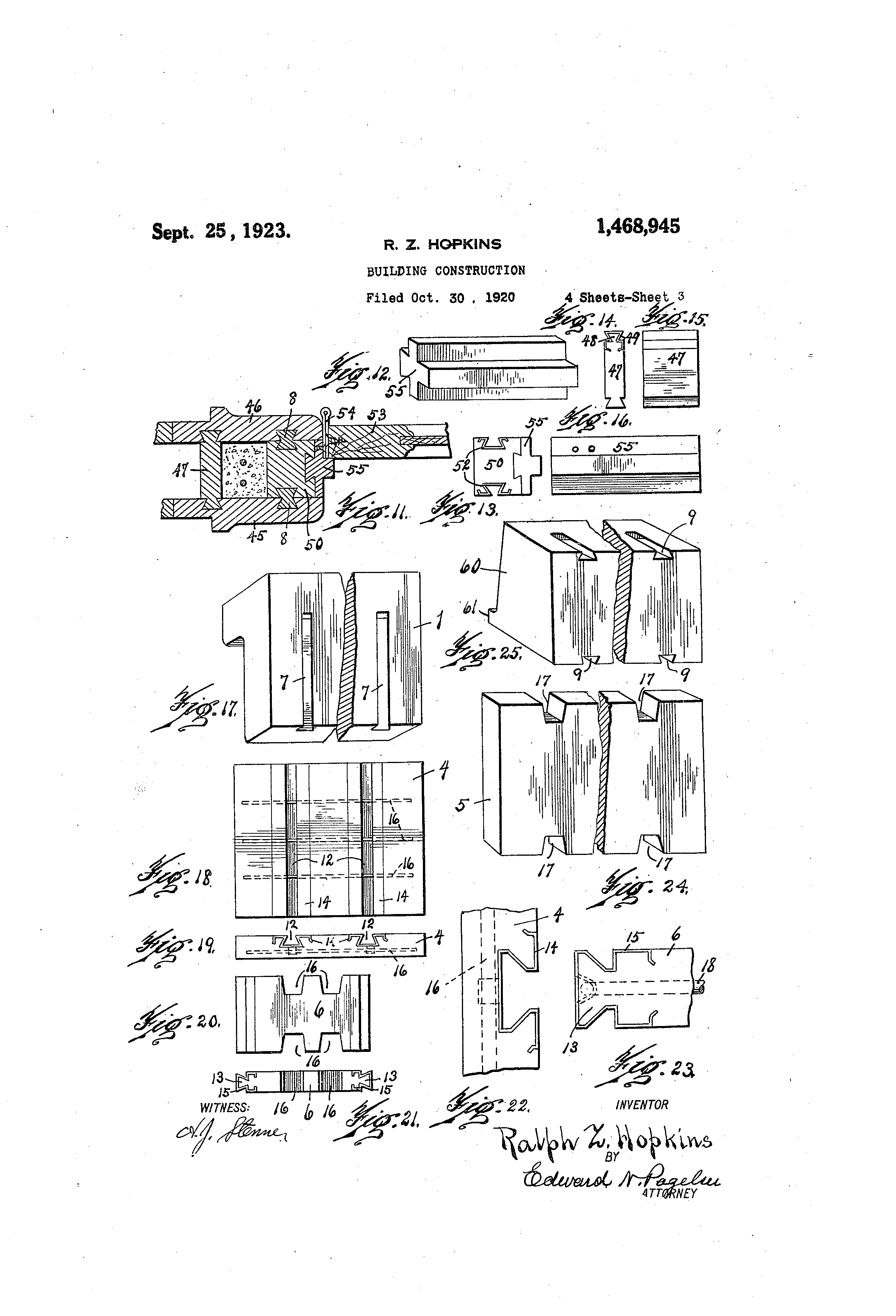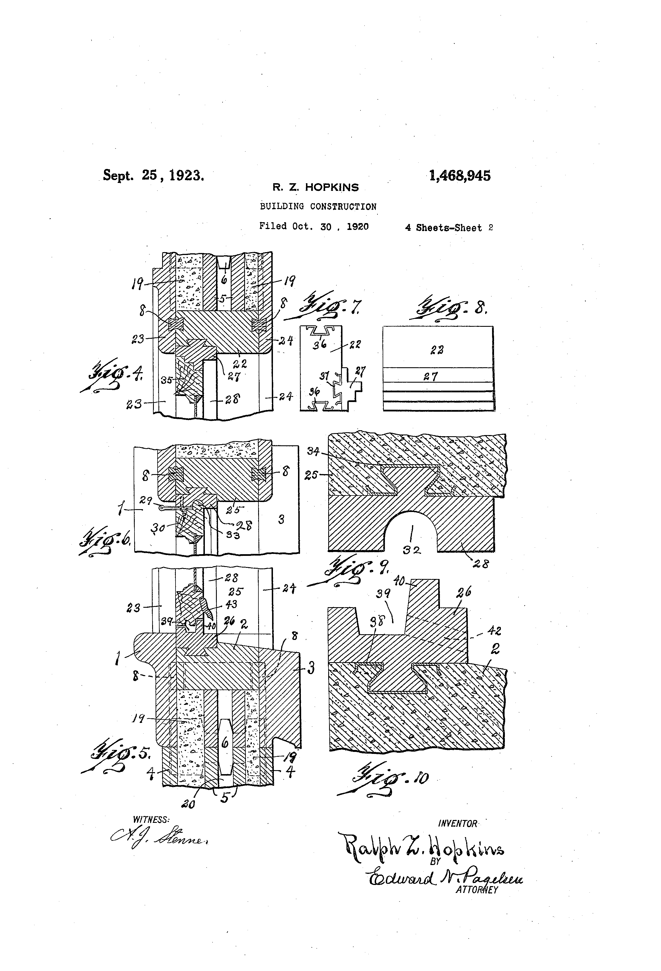 1 468,945 e 65 -not 1;,lii-teci th re4L,-, for stich units as sh6wn frani e onsistin& of inner and outer units ;la tiie drt-@-,7,iiggs --,iiai, be eirp'Loyed for btse -Tor facin(,- @Lhe tD T@,all at P.11 sioes oj' said I-e-,- ope niilg, -id s,,@ch other arclii4 te 11 'oo,,,rds, ils a, -jamb and lin' 1 u,-iits betwee the tur,,.l OLe 4- _IIIS is ,n -Fqci-Tic, units all the tiliits bei-iig precast, -ty be conveniently 1-ia-Tlii,3 ;-actured. ii-,eaiis to co@-hi,,3ct t'r@e :idjacent Linits, n,.et,,tl Mic C-.et2,,-Ills of the sevei,,-l units i,,-iay -, -i ae n I un' @70 11 plates q@tt - hod to the iatnb ,tnd li te its be c'iiiin,ed by 'Lhose skilled in the ar,'@- "-vith- o-i-iiOLe plates @-or- sash-s ottached to froila S-.@)irit 0-,L inveqthe P.-letal pl,,i'ues, said Aiall being forn, ed Nv'l@th ',---ion as se'l- fortli in the clai@-.- .s. ch,,,mbers fc)r sash -;cio@hts bet-@,11-e,,,@l@ @- ,.be s:ide 10 I c'i a,'@ m f,,Icinc, iiiiits -L b-ack o' the jaiib -Lini' aii -L LS A -L'ra-me i-r;- a ivau salici tiie ol@iide plates aiid stil:)port4 i,),2 aii op,@@niii, 7 - n,. plates b6,i-,I-g 75 fra,-..-!e cop-sisting of i-rner, a,.,-d olitcr f-aci,-i-@,7i@Lh rece-,@so.- I-or sasli-co,.d p-Lillei-,s tre@L arrin -@'L at t',,,e top of t-'Lie ol g, u P. and s,-,sh pulleys i -ii- v(,rt@c,)l ai-d hor;@zo,-ital roavs, jimb f-@ cl mou-@-ited iAl q,,ticl recesses. 15 ii-i el -LiT-li'@'s -'Llic faclng ulnits ai-icl i'lso A '@r,-,me --@er "in opening iii a N@,,Lll, said ,ii-rar -i vertic-I a.-id hor'@zontal ro7s, nlr 80 --ed iT COI@ISISL',')O' 01 !-'Iller aid outer fgc,' all sq@iet u-Thts bei-,ig 1D--,-ocast riicl -,,@'orm,-cl Avit'ti U-nits aclilicent saicl ope,-.i--,ig @and i-Ti -- ,(Yis,erilio, (Yrc.OTes, an,,', co--,,i,--P-cto:os - P:,,ourtect ve " ri., - zn 1-@ rt.cal P,,-id hori-zoi-ital ro-ws, jan-ib and lint-11 i--q S'li,-l gi-ooves to u,,iit-, 'Llie Lini'Ls In@.o fi-a-- -iies, uT-l@"cs betv,,,een the facino, u-pits ---qd a!-so t@ 20 2. A for ,i-ii ope_qi-nf, i-ri ivall, slid @,ri aTiged i-@-i and h6rizo-.ital --,Ws all o-i f-Lrd ou,----r iqcin! ui- ew ih ,ime co-713-istir,- stid -Linits bei@-,(y pree s- c,--,id -loi,iii cl i' 85 rino@ rooves, conr-,ec@Fors in ui-iits adiqcei-il, sa'@-L ope-,a-in,,y --iid cirr@,n-ge-i re(yiste 9 i,-i ver,@-Ical ii6riz6@,ifp.1 ro-w,;z, iai-i,b ,t,-id saiOi grooves to urite the u-.qits i--tif-0 linl-el un-'@ts b-Itwc,,e,.i t'@ill@ aiid tt cenerete fij-lin" b-,tiieen thc. fqcing@ 25 also ai,raii,@@ecL iii -;ertica'@- '- ,Iorizort,,ii units It-,he -Linits have beei ere,-,ted. iCL urits be-i.Tig -'@o -lie ro,,@,s, al@l s,.i r,@ -,I S. Al -Lorame io.- op(@niiicy in ,t @.@,,all, 90 ,,iid S"Iie in,3 c onsist,,-.,i '@ac' fra its I@l9 , o f - L I T I ( Y U n 1 4 - to ,ii,@ite tlie llnifs i,- Lcent, s-)-d open@.n,.)@, ja@-,ab iiii@ s 'b6t-@-,c--.i thG, ii,to ac,jq ce--iit,. iac-,Iig iini-'U-g of the @-er'Liqits, saic', upits bei-n,- Drecf,.St ard th-, oi)en- regisleri--ti-l- lui-ooves ti,,d cori-iectors I-a(.,s iii the sarii,- i)lane and @'I 0 01)])OS-@L i C" s'Llo ii,.a the iiii-lb tind fteino. units. 95 io@- En opoi -a; 9 fra. i in o,- j r. a iy, a 1 3. A fr,,.riie for an opepiii,- i-@i a cl ir,@riI O' U ceS @'t I , 6 co-Tisisting of iii's rclid lit u - 01' said o-,,)eni-og ,,.ncl jimb ,ilDi'@s bet-v.7e,-.-I tl,-ie O-L cl o ter -,,,.nit-, zn a',l slcl,,@s0P, S,Liq units, s,,@.i-d i,,@-ii's belri-- pre@--,,,st i,-Id -.-Ig, 4 -,iib aicl li@-itel t,.,,@its o-isteri _.i, h aviii,@l; re.; ng groove COj@nl2ctors to. 100 4! 0 ,a-14,p.g iii-ii[s 'Lb--, ii,,-iits beino@ p,-ec,,ist u-ii'L-le tl,,@e Lll'-its, q_nd rl'os I -i3 aclj, -i u -Li'-.- ,its, o-i the jamb iinits. to C,-)l li-2ct tL -.cei to .-he -j'vrib aid iiiitello, frame for a--i opr-,iii--.i,,- -q "I i,.,all, 4@IJ u,,iiits. s:, - @l 'Lrime con@istino- of units 4. A in a sfl,@,d jtcent@ saic', openitg qnd jfm'i) @.iiii@,s bet-\,7(,eii 105 o, outer - Luiits 4-Ine, ullits, q -@id -cii@@lls bei-jig and -@ll si-,-t-,s o-f2 tti. tdjpceiit clove'a'! L,@r o-- es Pn-I coniiee'L,b r,- SE'licl o,,Deniii@, Lillits -@- avin(Y dovetpii- ejle,,s the 45 iiiii thc@, ii-@iits beirig pi,eoperii- @i w,,Il frarae tor ,,P g In -@ol -.- Lect nt St! -L @-o @i- the adilILee iiilits, comorisi-.io7Liiiits cop.,,@titiiti@-i(r aTi e@iC[ r',ice 110 '-o !lie ia@-iib a-,i@,l 1--, of tl'ie ,t@acl ii-n;ts on ea-h sic,e L i-)i@@tes i,Ioiv c-T stie'Ll l u qa,,Ii(3 ur)-its. il- o -t' such u-,g"-s recast, ,i ii d b-,i-in-- r@ie@-al piatc-s. bein.0 ;P 50 5. A --ri-)r i7-i ti -\v@Lil, Sfti',! )'I'Ooves, Ind "-.,i tlie, (,-roo-i7eS ICo f,., --q ('@ @etiter TIT 115 co-cs7s' @,nite ".he iii-ii-ts. -@'Or the -I4, siclos ol' so.;,@i -9 A frtmoo a 11 opeT-11"y irl @-C. 1)7all ri OT'loniTi@r, jp,-@lb u its - i i t s a n - P c l s u r - @ iirits L'il tl),,-, f,@i cefthe ii,rl ii@-iits on e-ach 0 si de 0 @i' sticl-i o'L s Licli 55 iiiear,--s C) c, T'If! @eS fl@t@-ae' to t'iie ia3,,,bac',, 'i-ilits, U-lq 1-ts bein- Drecast r,,Pcl i,ecriStc,.@,-iT u flocit 120 Li S u C grooves. icle pl,-@1--s s,,sli-o at'@t -'iied cop.,.iectors ;n the gi@oo-.,es@ to ,,inite to the i)l@-ttes @it, -f-,ch s-"Cle 0-@ @ c +he 'Linits, said -L,tcipff liniis 1- i,,;@,v-'L-Tl 11, a@ CL; - u -ial vertical -7ioi7eta;'l :IleLo--@- orc- o' :'clie u; ct ei,)Iiies @io@ cioveraji- grooves re(yist-,.-Ill. 9 r @ii f, 0 p o,,; i t, i o i--i e -I aL-; the 0--c wii-h each @ot'.ie-.. an.O,, co-Tirecting plate S C Y , - ' d lieigfit a,,iel Pt e;@ch sid,,@ )f ,-.he In, cl, @ceticliiio, icr6ss bet-,Ye--i-i s@,.i Taciny tin-Lts ,t d125 above @nd be!-o-,7 having t@,eir eii,- Is do@,eta@lle d dovet,@il g,.ooves. 6. A -Tor an openilig iil -will said RA-LPH. Z. HOPKINS its acli,-icer-t @@-icl t,@c@,ii rows havit,.cy the c-iie.,s zn other guic@,e said n-ii,-Idle pl,,lte.