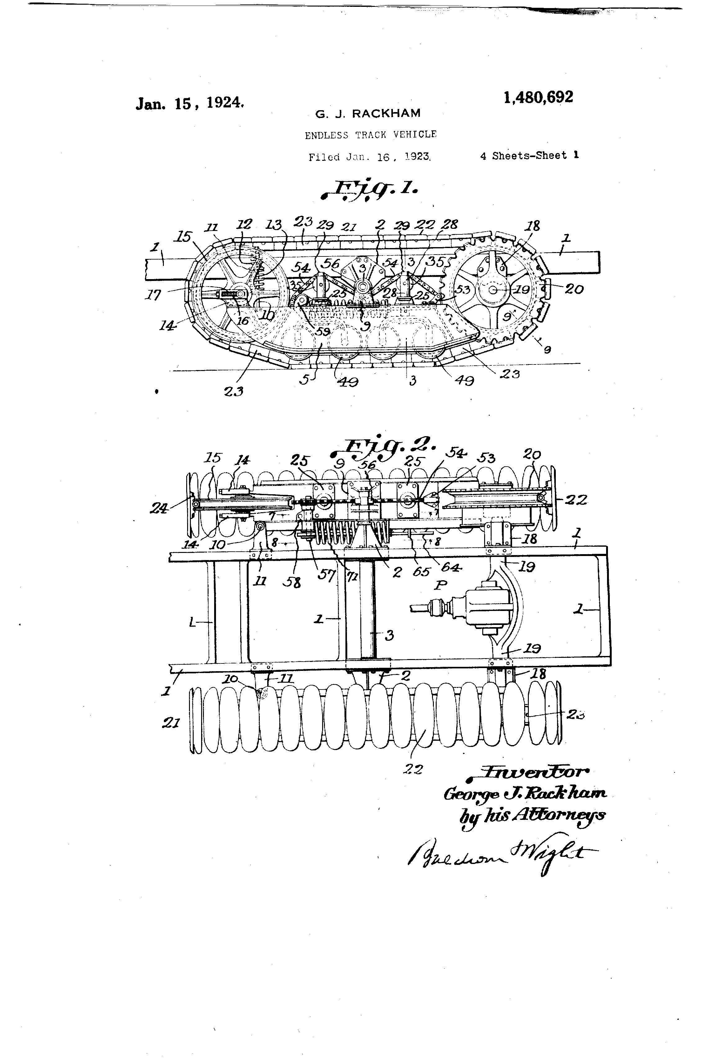P-,@te.,c.ited Jari. 1924, 11480@692 UNITED' STATES 'PATENT OFFI,CE 6L,ORGE iOHN-RACKHAYT, OF.CHI(,.8,GO, ILTINOIS, ASSIGNOT-,, TO ROADLE@SS PAT@ENTS 1-16:LT N 6'C'OXP@A Y, OF -V7. LS-,rIINC--TOI@,'' b.E,9@P.RTCT 0 .N F COLU1\IBIA. ENDLESS-TRACK VEI -IICLE. Application filed Taniiary 16,,1923@ S6rial No@ 613@004. thereto ancl,the fixed axle al,v@tys mtiiiitains Be it@ that T,, JOHN li,ACI@l- a fixed relation @-",ith the driiting mechonism. 55 (,t @,,,iil)jeet o-f. ti@i(., Xiyig o'i:' Bri.tain, The iieiglat of the i-eilicle is iraDsi-i-iitted. to ,I@@("Siding iii Cbicagg; coi@Li-Li-,y of- (',ool@, tnd, the lo,",oi-,i,uns of (,lie traetqr belts-throiig@. of liljyioi.s@, certain iieiv, I)ody supportino- cl-,vices of i-iovel coiistrii(.@- el nts@ In Impvovelile, Enclloss-Track, tion,@etrred,by,the@ siib-frai-ties., These d(, V(,,hicles, oi. T,@,hich tbe.follo-winsy@is a speci.-, vices are of such, codstructi.on anci are so 60 coniiected @vith the sub7fi.-ames-and ivitli tlie Tliis- i3i@i,,entioji relates to veliieles. of,tl-io eliss iia -vvbieb @enclles,-, ti.-@icks,or tra@ctor be.Its al@e - OMpIO17ed i@o stis,t,@tiii the -vehicle,@ ti@a,Arerse, th@, -groiii-id and p.,i,r'bictilarly to of'siicli vehicl(@s ii-no-,.vii@,,is."pilot lialf tr,,tck ina(,,Iiiiies" or tliog,@, iii -wli'leb the -front, oi-, wb(,,,-Is o.f tlie. are of tl-ie @()].@(Iiiia.ry kiiict wliile@ the ile,,tr portioti of the vi@liicle@, i@, siipported I)y eiiclless@ tr@ucks or trt--tor belts@,, @ I . : . I ... I @@@ 20 Ftriiet tjie eii(II.ess track iiiav,l)epf(il'i'l -'Irt@s Tlie@'object ii-iveiition is to so, con-. 1 - Tlie@accompaiiying dr,,twings,-,how the prevelii,@le body tl-lat they may iiiove, vertieallv to ,i limited extent relltively to -the chassi @l iiiay have, a, shoi,t fore and aft rocli:ing@moA@emeiit in, -thc@,gtib-frames, in(I-also a, short lat- 65 er,.tl or transverse moveme-ut in said frtlnes. Tn. this @Nvay tl-ie, ine(@baiiism. aiitomatically accomi-iiodates, itsolf tocoiiditions -,tnd- eire-Limstances and assli@es @@the,,great(,st ease,, of oper,,ttion and freedoi-ii @ froiii slio(@k.s 70 9.ncl stra@ins. th,,@t it. ferred way of amboclyiia,- my invention in @@ro,,,ttest, i@i-iaeliines of thp, kind bef--ore mentioned, oase ' i iid - Nvitliotit, undi:i e str al'ii oii tl-ie Fil(-tire I is a, si(le, elevatioii of tlie tractoi, 75 bu abi-i-,@)i.,, iiil si-io(@lKs tb,the i,ehicle., -i@ieeg@iiisrf! at the rear end,of the i7-ehicl(, (v', oiit my,, iiiventiont I provide. cliassis. 25 (,,Iia8sS, o@'@, a,-ly sliitable l@ind ancl @T siipport ,, I ..@t,b.e@ froiit Liid'of the chas,,@@is in "tn):@ suit,,tble wgy,, eithei.,,@,by fr6iit@,@s[6eri@iig Nvheel@ of oi,di-nai-, )7 constr-Lictioii's-Lic@h a s -ite comiiiionly iii', half tra6l@.c iiiachines@ , or I i-nay '30@ ii'c 'ndless tr"k. m6chai-iisin @Lt'botb ends of the cli,,i,ssis, or the entiro chassis iiiay be stipI)ortecl oh the tr,,ictor For con%,onieh(@e of, ilIListrEttion',qnc.1 (les@eripti6n i[ @'n@ay be a@sstimecl, tl-iat the f tont' end of - tl-ie cli,,tssis @is sLippoi'@i-ecl@ in aiiyl suit,,tl)le way, the reir porl-tioii@ howevei-, beiiig - stipported by IUIT iiiiproved tra,etor mochaiiisiii. -@-Fho ebassis has I)Ivotally coniiected to its 're,tr po@rtioi@ at e@ieli side a stib-frai-iie-'wl-iich is m6iinted'to,roclc'ab6Lit 'a horizontal. hxis Figtire'2, is. a I)Ian itiew of this mechanisii,). on botli sicles of tl-ie, chas8is, th(@, top run o'L tbo ttactoi, b6@lt on''on:e @--.ide of the vehicle 80 be,iiig 6mitted in order to @honv cer,tain mech-i' ,tnisn4 ivhich -@A7ould otherwise bo hiclclen. The,.Iremaiiiii-ig fii@tives'a-re on aiii enl,%rged scale. Fi(,Lire, '3 is :i detail view in sectioii on 85 the line'3-3 of Fio@tire 15 @howing IDartiou-@' 1,,irly,l)arts of one 6;.f- the i-)ody supportiiig device,'s, a'hd th@,means employed'for pol@mitti-fig lateral moveiiiehl t.,Iiereof. Fio-tre'4 i8 'a @ d6ta-il -@iew in sectibiri of 90 6ne of the tr@,clc - wl-ieelp, foriniiig p,,trt, of t'hd bo'cly supportiiig de@@Tices and illu@trat6s the, tri,,t'nne@ in -@,7hicli it is mouiit6cl and I)ref6r6bly -,itti@ited - i-ni'dway,' betn@,een its hoiv it elio-a(,e8 tho t:@acl@. fi.@ont,,tnd rear chds' of the sub-f-r'hiiies -. F-igtirb '5 is t side 6levdtion '6f 6ne of 95 slippo@tg at'its front 6ncl@ @@ I)ulley'ov6@ -,vhich aii end.lcss t@a@tor belt 6.r siiitable, COU tTU.@45' tion @ p a,sses and by -,@ihi ch'the froiit - portion o-rtlie@beltissi,ipportecl.. i-\iiothertr,@ictor's-Lipportiiig plille@ oii (,,a6h side of'tl-i& )@ehi6le is fTxedtoarear-sl-iaft,oraxle,'Mountecliiibe,,tri.iigs,c,,trried @by the chissis@ ctiicl,@p6-wer from 60 the hiotor is ,ipplied to,said @eat a:i,,Io. @ ThLis @Nihile'ther T@ront rpoftion of the tr'ack or belt M,g,y i,,ise, tii d f@ll relativel' t,) the el-iassis, the l?oi@tiop th(@keof hq,S, rel9,tiOD the stib-fr,@mes@,v@ith patt of- certaill: bra@ck6ts @a@ridd thereby. Figu-re 6 is ,t view in silde elev,,ttion'sl@iowiiig 1,):Irtictil@rly th6'ebnstrLiction and manner of iiiounting oT I ie o,f tliel body support- 100 ii-i(rclovices. Figtire, @ is t det:iil vie%v iii 's6ctioii on f tli.,6 liii,e i of 'FigL!re 2 and sh6Ws par@ti6@iltrly a'part'of'ihe ,tdjustable flexible @s spensio,.n membars o7-j- -whioh the body I'D,5 u reStS.. 1,480,692 r,io,ure 8 is a vie-,v of another part of the @@ispending member shown in Fio-ure 7. FigtLre 9 is a cletail vieii, iii -.ection oi-i the li e 9-9 of Figure I shoivin(, tl-ie ren n of n latio o e of tli@ driving ptill.eys witli the tractor belt.. The ebassis of the vehicle as shown is in the forril of a frame I whiol-i comprises longitudin,,tl side members connectecl by transverse members disposed at stiitabl@ intervals. Bracl@:ets 2 bolted to @ the chissis stipport,,l shaft 3 from which is stispended.on each side of tlie -vehi,,-@l,(, a, slib-frgn@e which is riGo.-Lintecl to sivina or turn abqllt the axis 15 of sqid shaft. E,,t@l-i of 't@es-e siib-frtmes comprises t-,vo side plates 5 cojiiiected to a to @late 7 and sp