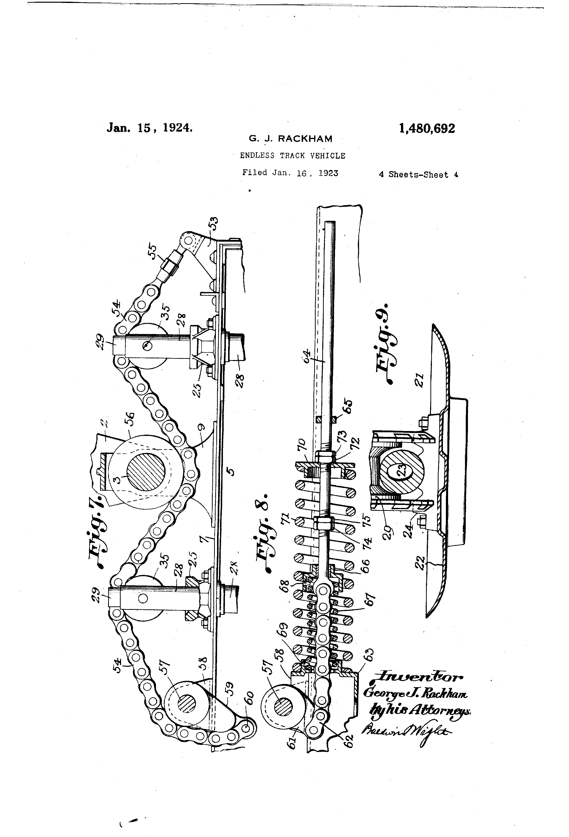 th,,tt -wheii the frai-ne's 4,@ ctre -.wuiiq- 1,,tterally tilting they are ,tlso piven @,n tngul,@i,r or 40 movemeiii-,, indic,a,ted by the dasb. lines in Fig. 3, -whieb i,estilts iii tilting the ,txes of the wl-.teels 49. The shaft, 3 carrie(-.l I)y the cliassis is equipped oii eael-i side Avith i pi:i.Iley 56 45 Avl-.tich i-ests oii a rope, ca,bl.e or chain 54 n-iolintecl oii the siib-fri,me. Th(, ciid of the el-iain. is connectecl to a bra,eket 53 on top of the sub-.TTame and the chaiii after passing ,teross tlle pulleys 35 of tl-te posts 50 29 and unclor the pulley 56 of tl-ie sbaft 3 is --Lttached to an arm 60 assoei,,ttecl - with a cam 59 oii ,L sl-iort sliaft 5'7 iiioiinted iii a bracket .58 on the sub-fr,,i--,ne. The eb@,tiii i-ri,,i,y be provided %vith a tui@n-blickle 55 foi, ,tdjtistiiig ,55 i.ts length. The 60 is coiiiiectecl witl-i a short lengtli of chain 62 ,,itt,,iclied to ,i 3-iorizontally ,iri-an,@,,ed rocl 64 siippoi@l-,iu!x a eiip TO agaiiist -whieb beai-s oiie eiid of a stout coiled sprilig '(1, tlie ol)posite ciid o-f -@vhi(@h r)O rests agaiiist a. slil)pori@ing bracket 58 oii tl-ie siib-fi-an-ic. TI-io reiipo@tioii of the rod 64 is gliid(,d by a br,,.@i,eket 65 and b)7 metiis oTtlile n-Lits 72 tnd 'f3 the teiision of the Sl)l'InOmay be adjtisted to correspon(l. witil the 65 weight -or load carried and to hold tlie chain 480,692 iyiouiited a' 1)'ulle'y' 35 piv6ted ii,t 14: tlo L@lle "',5'4 ])ositi.oi.i. 'TI)e froiit end of flie post. Yly t@Iiis -tli(, post@ ,iiicl it@s 1-od ,A @arriul a cup 66 ilit6 hicb. xteiicls w e Plill y ina.)" Illove voi-i-,ically to a limil@c,,ct @tlie ilear'eii@l of It i-eltitively Sm "@Lll'spi-iii@,@ C)7. tent i.11 tli@, slet@ve@ T@'n tl)i,S ii",IY the @fT@'oni-, e . nd of wliieh exfeiids i-n.to the the bod@, stipportin@,v mli@, M0,70 of th6'bi.,acket 5,9' Sci.e-wF, 68. 69 1-told. @'hc, 70 cilly il@ Llie siib-filames aiid '@ti-e PrOI)ej,ly spriiig 6'i''i.n PI.Ltee betiveei,i the @Lil)s '66 all(t giii@ie'cl Avhleii' 'I'lie 1011,'(@i, o'f @70. 'T'he rocl 64 ct'ri,'ies-adjustal@,le niits or i,lie haii-,ei-s iio"sidelaris'e 'move@ncnt iii -,tops @4 75 The spi@in2,, Tt'is iiii@dei@'@ei@isi(n tlio siii)-i-rames btit tlie, iii)pei@ of f),n@T tl-ie'spritig 67 i@ @u@ iiiidei.- lei-@tsion )Illv ]LO I-Ilie@e lian(goi-s iuay i)@E, in(,)ve@f si(TeNvise or wi-ion the c@h@iii 54 is plit iiiider 'LiiiusLl,,il feli'- 75 r balls 3@ ,incl tl-iiis a sicle-' Sion aiid pitlls oil t.1-ie i-o'cl to an a i e icli-al movemc 0 sec'. xteiit -inall@T he Ilie'cb Ws or la, ii-L i43 (Yii,@,n t f he, incize e Noi iv ii I tilli fi.@,,imcs 43 wliieli c@trry the wi@eels 1-9 so tl-i,,it 54 is raise'd by a post 29, tb@e sl:)i-inl& @i-l- iA,vhen, tli(,. ti-acli: belts tre II-iovei @ltt.'ei,ally f-l-ie compressed, the ilitts 72, "t@ pi-essi.iig a-,tinst 15'',Wl-ieels 4-9 r@ove The b.e ciii) @O blut th'e i,6cl 611 is inovect flo 80 tiol@s of. 1. e T. It.2 m,,ty also @.@oelc Toi-e siicii an exten s 0 ciiise tli'e hilts 74,to ('Il@h i t and afi iii aboiit ili(, b@t]]. -,tncl ga@,),e and move th(,, cup 68, alixi.,Ilary s@ei,et joints',3-( t-,Iliis 2-i'ving ,,t j@-ocl,:ii-io- move- spriyi@g 6@ -will be c6iiipr&@-sed.. ay i-ne.nt to ti-ie,,wbeels 4-9. in' t is w one of-'tlie @ostsiii,,ty be i@@i@ecl 20 1 TI-ie the I)os@s 45 @ire ai-id lift tlil,.,tt part 6f iti6 @hal,n Av,ii-@li Avl-ilcll it"' 8.5 ,-ii tec SI(, owise 1, 9 1 "s iiiclicated @li@t is aSS66lated witl.iout in6viiioOfh6@,I)Ortions cal.lv in Fio-tire 3. Oftli(,, chain. The cam 59",re mains,@in:c;oiiThe bocly sul)@oi@tiii,@@ 'clevi.e@s 4ca6t witli tl-ie ch,,tiii' a'f all'times. While I ii.,tve a ' fore anc ',t -t M6VeMent iirit) the stib-, pi,eT-.er to use tl-ie"fle'x'ible spiij.ig 'c6nti-61led 25 f- I ' 'e s on i-ames NA,-io-n i-lii, swii-i-, oii 'tl-ie 3, ,t @iisl@e:@ i' m6jylber sh6-v@n I'@10 not iiiiiit''n-iy 90 ATerticai ll'IOITCMent in 't--lie sl@e@,es 28, ai@d a@'clailms to @SLICI-l'inecli,,tiiism @s @1-16 i@6sts in,@tv 1-ocl;@ing ,und sicleivise moveiiieiit oii tl-ie ball ]@e C'oi-inected with the eb'ai s'iii 6ti-16r -N@eii @l'id s6@l@:et I joliits 3'@. lrn,o-vvn 'w@ay''s'., rt@e of'the tract6@ belfs i-@ay tlilli Certaiii f-e,.tt@ire@ of the iiiventi6ii,91io%A,ii 3,0 cibout tl-ie of @lle linli:s 23 in tl-ie 'm,,I"Iller iii@ltl-ic accompan@Ting dr'a-\vin'gs',,tncl hereiii-' @95 iii4leateci at A. in I'@i@ur@'3 this I)ii,ot'al@'bef6re descrit)@@l @,tr6 cl@lim6,d-iii aii @@i,)I)Iicamo@einent, beiii(, fii-,,iite by fl,,inges 47 on@ tlie tio@ oi' Geo'@,o-e Tohn Racl@hl"",n',@,'Frede@iclc 16wer ell,4s o@f s'ic@ic @pl,,Ite@ 5. P)'ri.ddoii Lamb, filed M,,ti-. i'@, T,@T(@. It will. bc,, ot d by t,,o Fi(.. 3 fli@ siibj6cf'm,att"er 6ftl-ieS"e''Cift"IM'S' 'De'lll'(y h .1iist in t. @ie speci,,il c @sr c i6n il rated e joint, ii-ia,eiifi R' o trii t t on of said' elkh@ti-ii loo the ilaiigc-,rs 50 are iiieliriea @-rl@r@'t,6p to'bot-' @@nd - @aid' joint apl)lic',iti6n beiiip, tom@ clowiiAATai.-dl,@@ iii o),:@posite -Ii@-ections so',Toundeci oi'i.an"a'l@'pli6,,ttioii 'f-,'oi, fil6@i i'n'Gre@@t oii'A-p'r. I cl,,tii-ii is ii@iv inveiition:- I., An endless trtcli: veliiele coiiipi-i,@;ing 105 tr,,z@ctoi, belts, di-ia,iiig i,ii(I idle piilleys sii])pol,tijig thein, i veb@iel(@, bod.)r, ,i, siibfr,,iiiie coi)nected tberewitli iiioi@ifited tlo il-ock I'@oile ctiid ,Lft, ,tii(I iieli-is - t@oisiipportin g t,]3e Aehicle body Co)-Ylpri.'sing AITI-I(,,els eliga,ging I-,h(, loweiriiii.s of tlic, belts, fr@tiiieg i.ii wliieli the Nibe(L,,Is iiioiiiited, c,,tbles coniiected witli the oii v@,liieli the veliiele I-)o(iv rests, aiid @,ertlcall)r nioi,ablc,, coiiiiectioits b(@- tween 'Llio of- the ti--,cl;c-eiigtgiiig 115 @iii d sii.d cibl es NN Iiieh ctls o the i@r,,tiiies to s)Niiig bodilar sidewise oi, lat(,rLll)r wit'll i-,I-ie trctetor belts. 2. Aii endless @Lrick v(-,Iiiele coi@ipi-.isiiig a, ch,"sis, stibfi-,,i,ri-ies stipj)orted fi,ol-ri opposi't-,e, sides thereof ind (,.,Leh D'Iouiite(I flo rocl@, fore @irid. aft -t,boiit "ti'l ,txis iiitermecli
