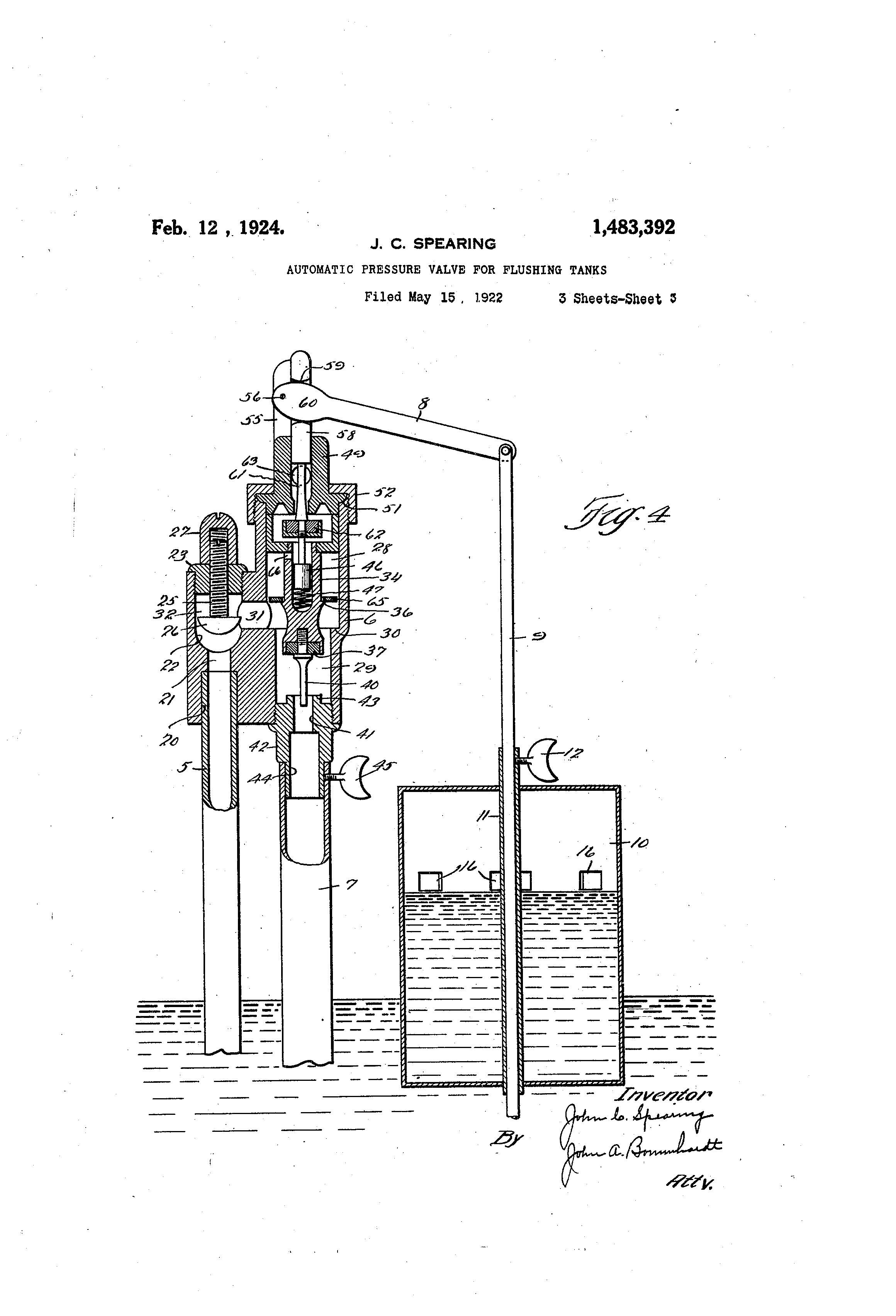 claim: thro'iiali the refill '64 aiid into the over- 1. The combination with a flush tank and zn pipe -flow pipe 4 anci ' refill the bowl,@ .tfter it has its suppl@ and refill pipes, of ,t valve casing 45 been fltisli-ecl. to -WI-iicli saicl pipes are @co-niiected, an out- 110 A ' sh@r 65 is placp- d ,iroLind the plviu oo4, let v-,tlve to tb@e tanl@, at the bottom of the the diameter of the bore in the washerbe- casi I n(r,, said refill pipe being connected to ing soi-iie@"rhat o@reater than the cliameter of the casino, at the top thereof, ancl said tile p@ttt: 34, ,tn@d@ sai-d - washer -will rest upon slipply, pi-pe openi@.ig thru the side of the 5o the sh6ulder' 36 -when the valve is in op6n casino@ @between the refill. pipe and the OUt7 115 positioii showii in Fiu. 4. It -will also.@be let va-lve, ,t -Di ton in the casino, between the no-@ d th,,tt,the w,,tsber 65 is of a som6- ,@,liat supply@ @i.p@ connection and Che refill pipe 'e lesser cliaiiieter tha@ the bore 28. connection, said piston being connected to Ilows. e v ve, q n The operatio-n is ,is fo the outl t al d a float valve above the 55 When the fitish'@ball 3 is raised the water pi@t6n, controlling the , outlet to e , refill 120 iii the ttnii: 1 is. drained througl-i. th6. flush pipe. pipe 2 -ito th bowl. This will' @cause th' 2 'L he combination with'a iqush: tank and fl6at 10 to 'lower and in t-Lirn will@lower the its sii ply aiid,refill pipeg,l of a valve casp ' v ha-vink aii o-Litlet va, e arm S;which will inove the alv6 62 @from in Iv -seat @at its,lower 60 'lt s@at 54.1 ' This will allow-the ressiire@of ell@ a float Valve at its -Lipper end control- 125 p I tl@e w@Ater'worl(ing @gainst the ' iston. 33@-to lin .tlie refill-'pipe, the-stipply-pipe.being PI.... 9 rais6 the.same ,ts@the@'pres'sure against the con -n6cted, to the casing betwee@ saia. vaiv6s, @u @t siii@ 6f the:pisfoil:33,@-wil-l@b6 less than aiid @ a 'piston in the @ casiiig . betwee-Ti,, said pp tile @pregqu--re T- o- n- -fhe-- 16wer,, sid6,@ the: I wate@ siipply @.pipe .,Oonnection @ and the @refill.,,vaiv@, 65 66,i'n@@@th e@'@li@g,.a4 said,:pi@toii -being@ provid,ed with rt plil pro130 9 into the,bore 35 and around the plunger 46 iiito the'eha,'mber above the piston 33. This then will raise the valve to the position shown in Fig. 4: -and the w,,tter will flow. through the pass,,tges 21, 32, 31 iii-to the 70 bores 28 and 29 @,-,nd 41 @ into the pipe 7 ,tnd tlience into the tai@tc 1. As Nvill bp- seen by Fig. 4, when the@ valve is iii this position the extension 48 on the plunger 46 strikes the valve 62 tnd depresses the plunger 46 in the 75 bore 35 ,gaiist th6 presstire oi" the spring 47 to a poil_,t below the hole 66. This will allow a greater ,tmount of water to pass through the refill pii)e 64 into the bowl while the tank is filling. 80 -When the 'Wp@ter in the tank has reached the pr I oper level the float lO and rod 9 will oper,,t'e the arm 8 and close the valve 62. This W'ill tl'len c,'Luse the presstire of the w,,iter to 4' orce the piston 33 do-wnwardly 85 aiid shut off the water into the pipe 7, closing the washer 37 ac,'ain@t the v,,tlve seat 43. As the 'pisto'n 33 is moired downwardly the -washer 65 ivill rest upon the s',,ioulder 30 and diminish the flo-vv of water into t e go bor6 29 -Lnd 6onsequ I ently into the pipe 7 and7 the valv@ will sea4b more re,,tdily and there will be iio chattering. When the valve is in closed position the water passing tl-iroug e hole 60 aitd iiito the bore 35 95 h th and around the' plunger 46 into the chamber above the piston a3 will tend to fo@ce the pistcn 33 clo-wnwardly and hold the washe.'r 37 firii-ily acrginst the se,,tt, 43 and it -will@ also exert an @qual pressure upwardly 100 and hold the valve @62 firmly against,its -seat 54. 1,483,392 jecting downwardly and cooperating with the outlet valve seat. 3. The combination with a flush tank and its supply and refill pipes, of a valve casing having an outlet valve seat at its lower end ' a float valve ott. its upper end controlling the refill pipe, the supply pipe being connected to the casing bet-ween said valves, and a piston in the c,,Lsing between said supply pipe connection and the refill valve, saicl piston being provided with a plug projectin(r dowiiwardly and cooperating with ,the outlet valve seat;, said pist@on having a by-passage from the lower to the upper side 15 thereof, and a valve carried by the piston and controlling said by-passage and havin a pilojection ad.apted to strike, the re@l va,lve to open the by-passage. 4. The combination with a flush tank and 20 its supply and reffll pipes, of a valve casing having an outlet valve seat at its lower end, a float valve at its upper end controlling the reffll pipe, the supply pipe being connected to the casing between said valve, .15 and a piston in the casing between said supply pipe connection and the refill valve, said p'iston being provided with a plug projectino, downwarjly and cooperating with the out-let valve seat, said piston and plu having a by-passag-e through the same, an5 30 a spring-pressed valve located in said bypasst(r e and having an upwar(ily projecting stud ,tdapted to strike the refill valve when the piston rises, to open said by-passage. 5. The combination with a flush tanlc and 35 havin, y and refill pipes, of a, - valve casing its suppl refill " a valve seat at its lower en(l, the ipe being connected to the upper end of the casing, and the supply pipe being conne cted to the intermediate portion of 40 the casino@, a, float valve controlling the refill pipe Ei@@d having a stem working through the top of the casing, a piston in the casing, be tweei) the supply pipe condection and said float valve, a piug depending froin the pis- 46 ton and adapted to close ag@inst the outlet valve seat, and a, washer carried by the plug adjace nt the piston, ancl movable up and down thereon to restrict the flow through the outlet valve. 50 In testiraony whereof, I affix my signature in presen
