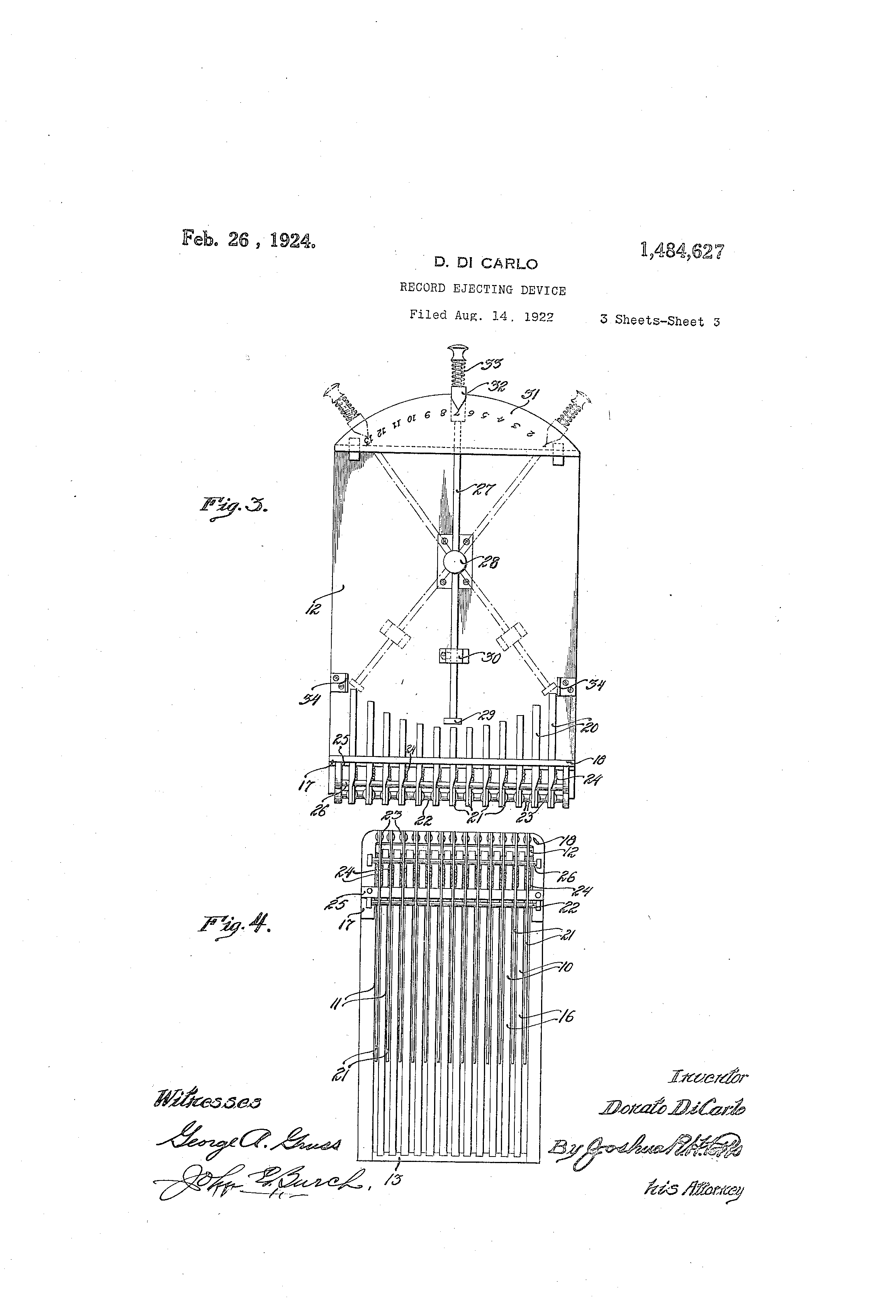 Pat,en@ted, Feb. 267 1924,@ 6 2 7 UT@RTED STATES PATENT C)FFRCE. DONATO DI CARLO, OF P@ DET-Pil!A, ]?ENNSYLVANIA. RECO--,ZD-EJECTIBTr;, DEVICF-,. To all whom it q@iay concelm: Be it known that 1, DONATO Di CAzf,o, a subject ol the King of It,,tly (,iak,ing (leclared iny intention of becoiiiing a oitizeii of the Unit@-,cl St-,ttes), iesi(-Iing ,,),t Phi!7)lclelphii. in the county of Pi-iiladelphip, ar@d- Sta;te of Pennsylvaiii,t, htve invented certain -nenv tnd useful Improvements in Record-rijecting Devices, of whic',i +,,!-le following is ,L specifi10 cation. This inventioii relates to pl-ionogr,,.ph record cabinets and more parti-lillarly to record ejecting devices therefor. The object of the invention is to p-ovide 15 a cabinet which will -tecommodate ,t maximum n-Limber of records and prevent accidental dis lacen-ient thereof, and megi-is wliereby any one of a nlimber of records may be ejected by a siligle operating@ meiiiber, as 20 desired. These objects, and other advantageoti@s ends which will be described herein-,Lfter, I attain in the follo-wing map_ner, reference being had to the accompanyi-ng drtwin(,s iTi 25 whichFigtire I is a perspective view of a T)hoT-iograph cabinet constri-icted in ,iccordtnce with tlie invention, Figure 2 is an enlarged frogment,,tr-v 30 vertical sectional view throuoh a coinp,,trtment to disclose the record ejecting mepns, Figtire 3 is an inverted top plan view of an ejecting means as applied to one compartment, and 85 FigLire 4 is a rear elev-,ttioii of the striietilre shown in Figi-ire 3, on ,t reduced sc,,tle. In the drawinks, 5 is a hotising, s-Lich qs a phono a h c,,tbinet, the lo-wer p,),.,t of -which is @irvipded, by vertical waIJs 6 and horia zontal w,,ills or shelves 7, into -,t number o'L compartm- ents. As illustr,,tted, there is ,,,,Ti upper compartment adopted to receive the larger records horizont,,tlly ,tnd f oiir lower compo,rtments adaptecl to receive s--rn-,iller records vertically or on edge. The upper comp,,trtment is divided by horizohtal p,,irtitions 8 i-nto correspopding cells 9 and the lower compartn-ients ,tre divided by vertical p,,irtitions 10 into corre00 sponding cells 11, e,,Lcii cell h,,tvijig -t sp,,ice of sufficient width to accommod,,tte,,t record of the flat tablet type. E,,tcli of tho comppj!tments mav be provided with ,Lii lltli.xili,,irv top wall 12 and, between top wtll 12 and the ,tcliacent 65, division -w,,tll of the c,,tbinet) ,t space 14 is produced. Such a space is provided at the Application filed August 14,1922. Seriol No. 581,580. top o-I each compaitineiit to ,ic(,oiiiiiiodate re-,orcl ejectiiig devices, a)-ici siiice all o-F these devices are the siiiie c6iistj-uctioii., ,, (-,Iescription of oii-I -will siiffic-.. 60 The p,,trtitioias v@iiieli clivid,- the coiipari@- r.-iei-it iiito cells, @ire providecl at tli,,,i-r front edges -@vith b;.ndiiigs or coveriilgs 15 o'L some in,,tteritl such ,ts velvet, to perii-iit the -,@ecoi-ds to be inserted in the cells bv I s'liglit pres- 135 stire, but to @-Liriiisi-i sufficieiit friction oii the opposite f,,ices of the i.-ecorcl to ret,,iiii them ,,gainst @tecide-p-tal displteemeiiu-. The il,,ner or retr (,dges of the -D,,trtitioiis ire sp,,iced frorn the b,,Lcli: of the @o-Lisiiig or bick walls TO of the vlrioiis con-ipartn-ieiits P.Pd the inedial ortioris of said eclges project re,,irwardly as indicated 16. Ai-i i-nverted U-sh,-tped br,,tel-@:et 17 is niounted ,tt the bac]K: of etch comp,,trtme,,-it Piid its biql-it portion 18 is dis7r) 7)oseci it the b,,ick of sp,,ice 14 ,tnd provided with 9- ntiml)er of ,tpertures 19 corres-Dondiiig in number tnd disposed in alig@-ime-.it with tl-ie cells. Cont,ict members 20 are slid,,,.ble iii. aper- 80 tures 18 and extend 'Lorw-,Lrdly ap-d re,,irivardly thereo@t-. Levers 21 ,tre molintecl on -. pivot 22 siit)ported i-n re,,,.r o' br,,tel@@et 17 and. tlae i-ipl)er en(Is of the levers 21 ire pivot,,tll y cop-i-iected to cortvct i-riembers 20 05 as indic,,tted -,t 9-3. -Retractile s@,oi-i-qgs 2,@. co,,iiiect the short arms of fhe, l@@-vers to @i cross bar 25 ol' br,,),cket 17 @i-i-id holcl s,,tid arms for-w,,trdly disi)laced. A cross rocl 26 is rnoiiiited oT-i br,,tcl;cet 17 Ili-id limits the oiit- 1)0 -w,,,).rd movemep.ts of s,,@.id ,trins and the, cotitact rilembers. The lo-wer or longer of the levers ,ire bep-t for'Wardly to li(,, bet-weep the projecting parts 16 of the partitions, and are limited i.n tl-teir cross rod 26 bilt ,),re m.ove,-ilents by '35 to cot)tact with the peripherpl ed-es of tb- recorcls 16 in their normql -Dositions, as indic,,tted in Figure 2 of the d@,,twi-ngs. A push rod 27 is slid,,tbli, mounted in ,t 100 lpivot 28 -Lipon top 12. Coniaet members 20 'are of ditterent lengtl-is so '.I-iat their oiiter ends lie in ,in ,trc concentric to the pivot, of the push rod 27. A rect,,tngiilar heqd 2,9 is provided @it the inner enill (;@ rod 27 Ind 105 ,t block 1n)O is fixed to the rod to preve--nt it from turning on its -,ixis in conjunction -with he,,td 29. A curved index plate 31 is moiinted above e,,ich comp,,i,rt,meDt, over sptee 14 and rocl 27, and a p6inter 32 is slidablv sup- 110 ported on the rod and is ad,,ipted to'move on the curved edge of the pl,,tte concentrical-