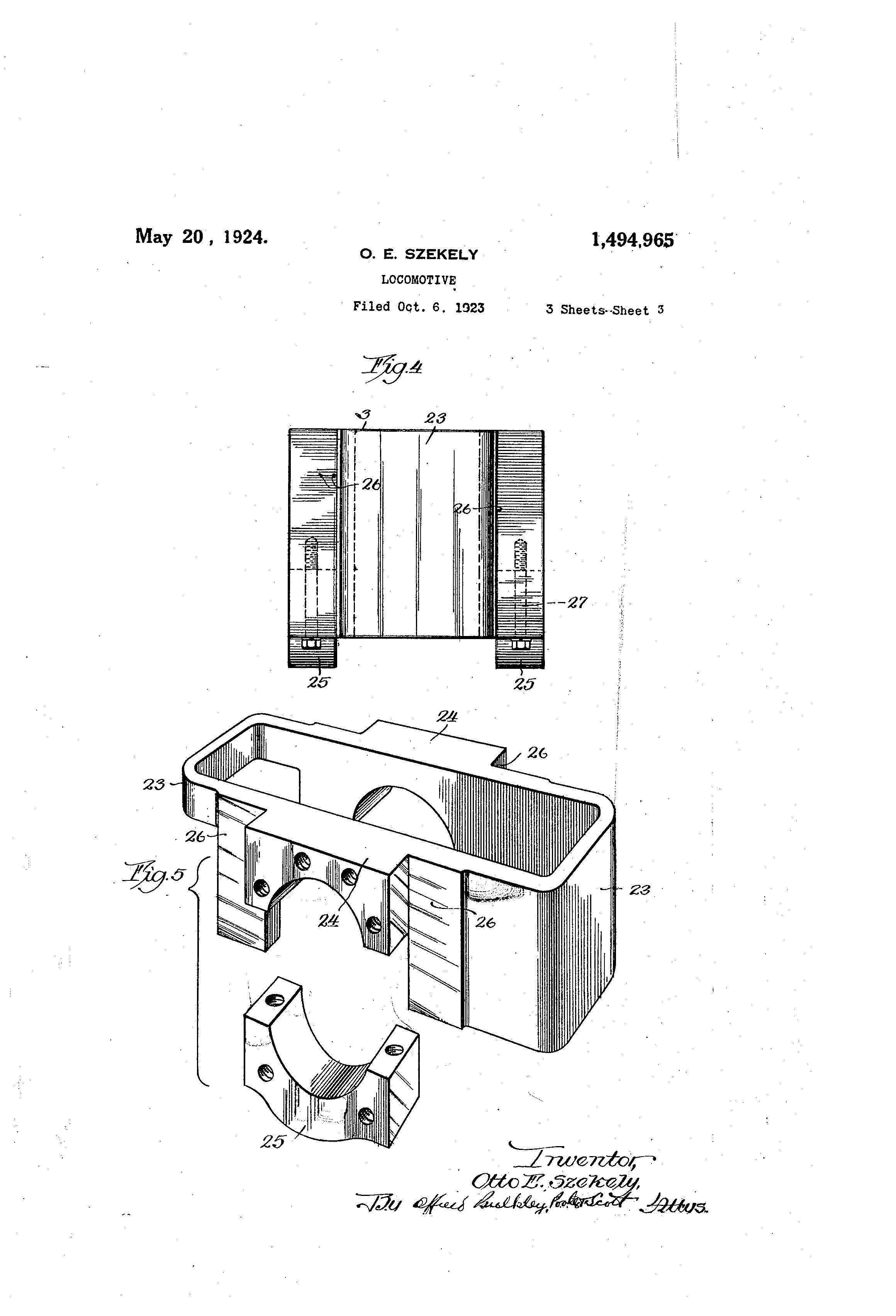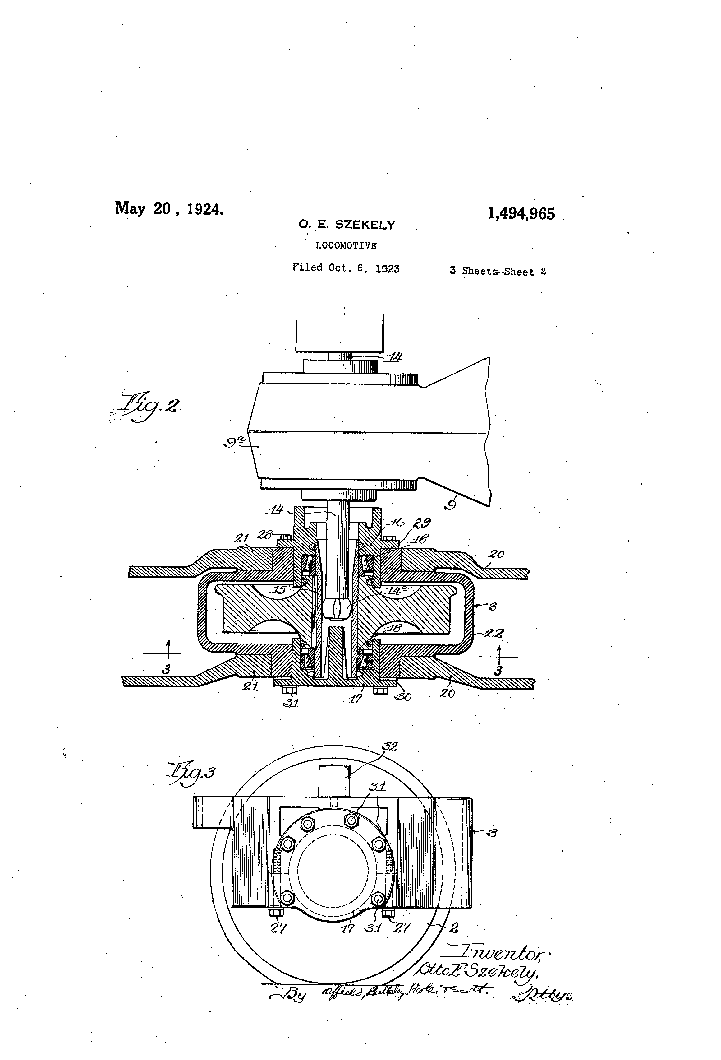 Patente May 20, 1924, l@494 965 .d UNITED STATES PATENT OFFICE..,., OTTO E. SZFKELY, OF XOLINE, ILLINOIS, ASSIGNOR TO DAVENPORT@ LOCOMOTIVE WORKSI OF I)AVFNFORT, IOWA, A CORFORATION, OF IOWA. LOCOXOTIVE. Application illed October 6, 1923. Serial No. 666,873. To allzvhon?, it may concern.- Be it known t@at I, OTTO E. SzF,]iELY, a citizen of the United States, and a resideiit of Moline, in the county of Roeki Island .5 ,tnd State of Illinois, ha-ite in-Vented certiin new and use@ful Improvements in Locomotives, of whicli the following-is a, specification. This invention relates to iiiipi-o-,,einents in 10 locomotives of t-lie t),pe and cliar,,icter disclosed in a prior ,t . @plication foii Letters Patent,, Serial Ntimber 583,198, filed on Au(viist 21, 1922 in the, United States P,,itent bfflce., na-iiiely: internal coinbustion motor 15 di-iven loccmoiive@, design . ed for industria-I ,,tnd constiuction work. The objeot of this invention is to provide in iinpi-cved ti-uck and journal constriietioln for locoiiiotives of the, @enei-al character 20 hereinabove described and rnore especially the locomotive of s,,tid prior application. A further object of the invention is to piovide -,t method cf journal constriietion calculated to ,tfford a.n ihiproved mounting 25 of the wheel journa-Is in t'he truek frame includino, inere@ased giiiding area in the, rela,. tive vei-ticql inovemclnt between the parts, ,tnd otl-ter mwl-ianical advant,azes havin(-r to do with the resistance to thr@ist and c@ther 30 foi,ces to which the driving partq are subjected. In the drawir@gs a genei!al disclosure o,f the locomotive is made, togetlier with a niore dettiled drawing of the parts enibody35 inef the ini,ention. Figure I is a. gene;ral view in side elevation of the locomotive embodying the in. vention, Figui-e 2 is an enla.rged view in horizon4o tal -4ection through the l'otirnal bax and drive as taken on line 2-2 of Fig. 1, Fi-iii,e 3 is an enlai-oed det.,til view of PD t5@ the joui-nal box assembly as taken on line 3-3 of Fi,-tire 2, 45 Fiatii-e 4 is a vieiv in end elevation of th6 journal box, and F@(,ure 5 is a perspective vienv of the jouri@al box removed and parts disassemb.led. 50 Considering the I locomotive in its general asp ects, it comprises a main frame 1, rigid t,lir otighout an(t synimetrical in shape. The fra nie is supported upon two pairs of wheels 2 located midwa-y between the front and ie,@ir ends of the friiiie, said wi-ieels being 55 jou l.nalled in joiirnal boxes 3 whirh in turn -,iie, stipported betwe,-n vei-tical (ruides in the f I-,i iiie to -,ifford relative moveiiient therebet weeii. Springs 4-4 form the connection bet ,ween t,he joiii@nil boxes and tile@ loco- 60 iiiotive fr,,ime.' Mounted iipon tl-ie fr,-Line. 1, is ,i, lieavy dii @y@intern,,il combtistion motor 5 and occupyi ng the forward portion thereof. A hood or housing 6 covers the motor. At t,.he ex- 65 trei ne front end is a, radiatbr,7, similar in co nstruction ,tnd function to I the radiator of an automobile. -The rear poi-tion of the fra me is occupied by the operator's cib 8, wh i@h is journalled to the rea,r end of the 70 b o 0,,d 6. RPllipwa,rdlv of the motoi- 5, and coupled the reto is ,t tr,,insmission casing. 9 with clu teli and fly -,vheel liotising 10 interposed bet ween. The i-ear portion of the t,rtinsiiiis- 75 siq n casi-n@g extends into the cab, with the se vei-al opei-a.tin levers at hand n,,tmely, t reversi.na lei,ei- o-,eir sliifting or cliange speed le-ver 12, ind a, ellitch ped,,tl 1-3, all Nvlthin i-etich of the, locomotive driver. 8o It will suffice to desci-ibe the loconiotive pon@er plant as co@nfoi-ming zeneri.Ily to standard automotive praetice, @,it,hough owing to the essential diffe@rences between loc@om6tive and road vehicle operation, ceitain s,5 departtii-es ai-e incoi-poi-ated in the transinission inechanism which may be briefly referi-ed to since they are fully described else--vllere. iiiasniucb as a. locomotive, is called upon go to ptisl-i as ivell as pull its loa,d, and from either end it in-List be@ ca,pable of d6live@ring the@saine power at the, wheels regardless of the direction of travel, hence a revei@siiig niecli@,,nism is introduced betivebn the cliange 95 speed gearing and the clutch to t-lie end that equal po-,),er is delivei-ed to the; change speed meel-ianism in either direction 6f rotation of the moving p,,urts.. Tiie po.)@er is tiltiinttel' delivered to the, loo y