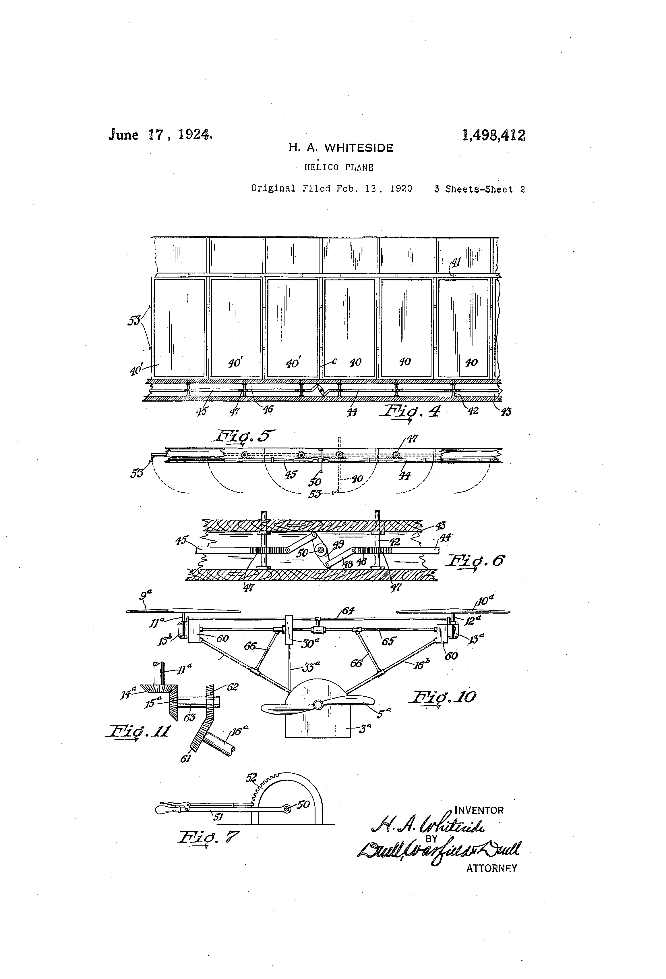 Patented June 17,.1924. lt49gt4l2 UNITED STATES PATENT OFFICES HOWARD AUSTIN WHITESIDF, OF NEW YORK, N. Y. HF,LICO-PLANE. Application filed February 18, 1920, Serial No. 359,553. Renewed April 30, 1924. To all -zvhom itntay concerti: Be it kiiown that 1, HO-.VAiti) A. IV.HITFSIDE, a citizen of the Tliiited States, residing at New Yorli, in tlle cotinty of New York and State of New Yoi-k-, have invented certain iie-Av ,ind iiseful Inipi-ox-eiiients iii HelieoI'l.ines, of wliieli the followiiiis a full, clear, .iiid exact clesei-iption, sucli , -.is will enable otliers skilled in tli6 ai-t. to wliieli it apper10 tiiiis to iiial@eind iise the siiiie. I'Iiis iiiir'eiitioii i-elittes to -.tir@hips of tlte lie.,Ivi(.r tli-.in -.iir eliss, iiid with respect to sotiie of its iiioi-e -,pecific d(,tails to flitt tn-pe kiiowii as lielicoptei@s aiid tpi-oplaiieg. 15 ()ne obl(@et of this invention is to provide .111 It I el-ol)itiie -%%-itli iiiipiox-t@d ikie-.tns for dii-ectly liftiiig i! upwardlv ijito tlicair witliotit tiii! r6liminary riiii along the (ri-otind. . p Aiiotlier object is to provide qii ieroplane 20 witli aii iiiipi-oved iiieajis for sust-.tiiiiii(,- it in .stibst.intia]IN- statioiiary positioii ill the air. Anotlier ()bject is to 1-)rovide tii iiiiproved nie,ins foi, diject]N- liftiii(Ily -iii aeroplaiie iii fli-lit. iiito the air, foi- stisttining it i-n posi25 tioti iii tli(@ tir oi- for effecting substantially vet-ti(--.tl d(@seciit witliout any direct action of stist,ti iiiii(r,tir cui,re iits on tlle wings. Anotlier object is to pr,ovide an aeroplane witli iiieins of iiiiproved -constructioii for 30 liftiii(,@ the -.tei,oplane or stistaining it in flio,,ht or for'propelling it forwardly or rearwardly tlirougli the air. Aiiother objeet is to provide an aeroplane witli iinproved propelliiig means in which the 35 dii-ectioti of the propelling effort is readily a@l.iiistable. Aitotlier object is to provide a wing for -,iii IIPI'(@plai)e witli iinpi-oved me,,ins wli er@by little i-esistaii(.-e is offered to upward or 40 dowtiward iiit)veiiient tliroiigli the air -,tnd wliicli iiiay be ,tdliisted o as to form aii eflicient sustaiiiiiig . siirfice for in aeroplaiie ill flio@lit. Otlier ol)jpcts of the iiiveiition will be in 45 p,,irt obviotis and in pai-t poiiited out hei-einaftei- iii coiiiie(- tioii wifli the followiiig det,iiled descriptioii. The inveiition accoi-diiiglv consists iii tlie features of construetioii, coitibination-, of eleset forth, and the scope of the application of ,vliieh will be indicated in the following claims. Iii the accompanying drawing wherein sev55 eral illustrative embodiments of invention are shownFigiii-e 1 is a side elevation of a biplaiie with the invention applied theret-o; . Fig. 2 is a fi-ont elevation of Fig. 1; Fig. 3 is a detailed sectional view of the iiieaiis for traiismittiiig power from the iiiotor to the lifting propellers - Fig. 4 is t top pltfi vie ' w o - f a portion. olf a Wing sliowiiig the tiltable panels aiid means 65 for,oper ating the saiiie, certa@in parts being shown in section to more clearly show the inveiitio n.1- Fig@ 5 is a front olevation of Fig. 4, parts beiiig broken away to show the operating 70 iiieehini siii for tilting the wing panels; Fi,&. 6 is a detailed sedtiofial enlarged view of a portion of the operating mechanisni fot the wing pane@s; Fig. 7 is a view of a hand-operating lever 75 foioperating the wing paiiels; Figs. 8 and 9 are sectional views sho 9 w"q portioiis of the mechaiiism for chan-aing the aii(rular position 6f the lifting propeners; Pig. 10 is a front el@evation showing a 80 n-iodification of the power connections ; Fig. 11 is.a detailed fragmentary view of the gear connections used in the m6aification of Fia. 10; and Fii 12 is a perspecti-Ve view of a tandem s5 biplane with thi@ invention applied thereto. Referring now to the drawings for a detailed description of the ifive-ntion, an aeroplane of the biplaiie type is shown in Figs. 1 and 2. As shown, this biplane bas upper go and lower wings or planes 1 and 2, a fliselage 3 havin- a cockpit or pilot's compai@tinent 4, a tracto@ fliglit propeller 5, a chassis or landing gear 6 and steering riidders 7 tnd S. All these parts may be of any standard or ap- 95 proved construction tbou@h in the present embodiii-ient a special typp of wings is employed. In order to enable the aeroplane to rise 'from the gr oniid without a prelir@inary run ioo 6o nieiits and arraiicreinents of pai-ts which will along t e surface tbereof, and to enable it be exeiiiplified in the coiistruction bereinafter to remain in substantially stationary posi- vertically without a downwird gliding move-' meiit, direct lifting pi-op(,@llei-s or sci-ews are provided. In the embodiment illtistrated, two of these pi-opellei-s 9 and 10 are eiiiployed, being driven.throucrh stiitable power transinitting connections froin the driving motor. As shown in Fig. 2, these lifting propellers are mounted adjacent to the op10 posite ends of the tipper wing at the enteri-iig edge thereof on sliort sliafts 11 and 12 respectively. As the niouiitiiigs foithe -shafts 11 an4 12 are siinilar in consti@tiction dnly one need be desci-ibe.(l in dettil. As 15 shown in Fi-. 31 tlie, sliaft 12 is iiiounted in suitable beari.Dgs iii ,t gear casin(, or box 13 and carrie a bevel gear 14 rigidly sectired thereto, iheshing -vvith t sii-nilar bevel gear 15 rigidly seciired to a sliift 16 extending @o adjacent the forward edge of the upper wing. The shaft 16 is preferably iiiade liollow in order to secure the least weight consistent witli the -i,eqtiired strengtli. Gear housing 13 is stiitibly rigidly se(-tire(I to a hollow tiibe 17 wliieli enci-,(@s tli(@ (Iriving 'sbaft 16, said tube beiiig i-otatible oil said shaft and connected to t sij)illai- ttibe 17 by a transmitting coiiiiectioii 18 sliown iii detail at t]-ie left side of Fig. 3. 'I'Iiis coil,,O nection coniprises a liul) 19 ' sectii-ed i@igidly at the end of the t
