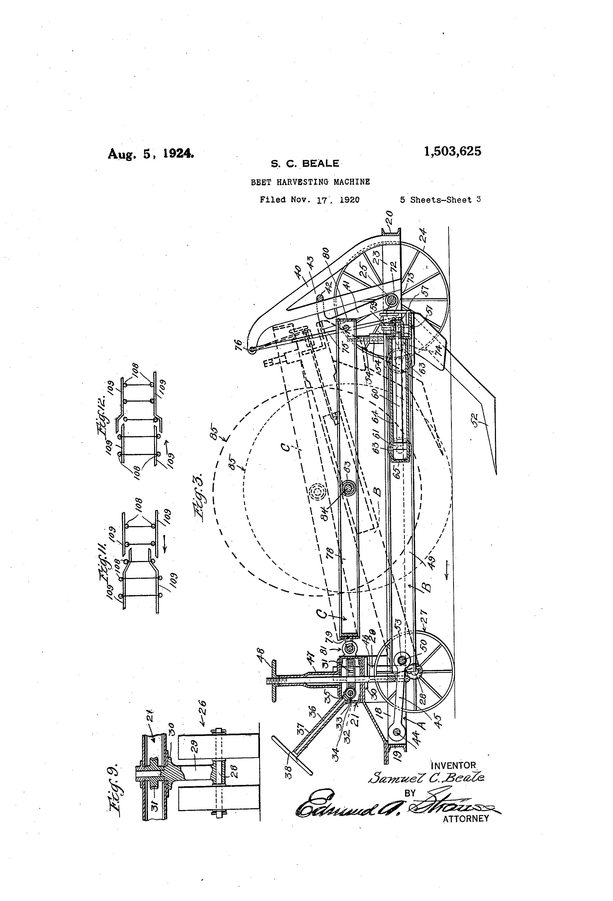 1 5 0 3 @ 6 2 5 Patei,ited Atig. 5,1924. UNITED STATES PATENT O@FFICE. SAMUEL C. BEAL:E@, OF LOS ANGELES. CALIFORNIA, ASSIGNOR TO HOR-ATIO J. TjO-R@CrY, TRUSTEE, OF SANTA ANA, C@ALIFORNIA, BEET-HARVESTINC-R J-.qACHINE. Applico.tioll filed ivovem'oer 17, 1920. Serial No. 424-,761. 7'0 cill d @na@y coqcernl: Be it kno-wn th,,tt 1, SAA:ETTDL C. BEALE, ,q citizen o-l' the Uiiited States, residing at Los Aiigeles, in the count@, of Los Angeles aiid St,,it-. of Califoriiia liave invented iloiv ,,tncl use'Lul linprovei-iients in Beet-H,,irvesting jAlaol-iii,.es, of which tl-ie following is ,t E;Pecific,,ttion. TI-iis iiiveliti0ii lias relation to t mac-hine 10 forharvestingsuo-,trbeets, and i-nore specifi';@eiits 'n m3r beet- h cali3, to iiilldrove I arvestijig iiiachine as illustr-,Lted ,tiid cles(@ribed in -n -iy peiicling applicatioii for JIdetters Patent er',il N mber filed ilfly 5tli, 1919, bearing S i u I Decep - bearina 15 29zxl,899, rei-ie--we, -aber 11), 19211 'Ser. LNO. 59-1,924 eiltitled Beet harvest'iii@; in, iiiachiries. Iii said applic,,ttion is sl-i6-wn aiid clescribed a beet hervester of the sqiiie cyeiiei@al t37pe as nay present invention, wliicl-i, 20 briefly, provicles meaiis for pulli-iio, beets olit '7' of tlie e,i-otind after they h,.ive beeil loosei-ied by a pio-@v, - @vhile p,,tssing over a ro@v, ,ind carpviii- tlieln to topl)ing kiii),es w,!-iere the tops qre severed froiii tl-io- body,portion. 26 --4n tli,,@ al)pllcatiol)- ibove i-eierred to, I IA-aA,e sho-wii cles(@ribed i m,,tchiiie -,wliieli will gril) the beets proportionately to that pailt ivhicli projects above the groliiid, ptill tl,eiii riid clelivei, the saiiie to a toppil.,-- i-i-ieclial-ilsiii A,,vl-iieli Ictutoiii,,itically top,s tlieiii i,,-i stich pi-oportioii - i,-l tilis strlicIla ine,,tns ltre'pi-6victed for c'ii,ii-i-ing the proportioii witliolit S-Lipplyi1lo, i;n eiitire iiew spt of gripping ,Liid i)iillino,,@3.5 devices. @t is th(@ i'liain object of in-v present illlde ,i iiiachiiie T-or v ei L to p@,-ov the I)urpose ,tbove set fortl-i, wl-tiol-i may be qui@kly ,in . cl effi@cieiitly adj-Listed, go that tlile beets @,o i, i,,tv be toi),.,Ded w;th respect to tny desired proportion of that part whic@i 13rojects ,,tboA,-e the gi@oltnd, wi-tho-Lit stoppiiig its opor stibstitutijig new parts. Tl-.to ,tljove aiid otlier objects iiieltidi-@ig 45 iiiiproi,ed -,,i:ieajis --For adjusting tl-ie toppiii-- li-,ii-idlliig @ind disposiiig of ti-@e be--'L-s anot beet tol)s, rogtiltting tl-ie projectiiag of the p-lo-vv in the ground, and liftiilg lioldirig the boet plilliiig ineel -iailisna aiid 50 ii@ee 'fi-oi,,i the ground when the inaCl,@iiie is bein@_y ti@,ti-isported from one field to tu rnirg, will be more fully i-n ulir,, fo"loiA,irLg,description, -vvill lo-e poliated out i'n the cl:@iins, and -wili be embodied iii tl-io accoiaidanying drao@ines, 5 r) iri wiiieh Fir tn' 1 is -,i side c-levatioii of ,t, bee'-u h-,trvesti-P(Y @iiachiiie eiiaboclyiiig lu3, iiiipi,oveii-iei-its, the beet-,Ptllllllg d@ilices beinoonly illiistrated coni-entionilly, due to tFe sm,,Illl sc,,Ile 60 oi-i NN@iii(-,h @the drawing is made. Fic,-. 2 is t plaii vie-@v of the same. Fi, 3 s a longitticlii-ial section througli the ri-i@i.elline, takel'i oii the line 3-3 of Fig. 2, the inechanisin being 6 sojiie of mittecl, 65 ilitisti-ating in dotted lines the Tr-,tine upon whicli the gripping ,Liid @ulling iliecli ' @anisms are mou tecl, aiid the I lo-w in an elevatect 11 p aiid iiiopei-ative posifion, soine of tli6 pirts bei i-io- oinittecl to'aitoid redetition, 70 - in F ig. 4 is -,in enlargecl vertical transverse sec tion througyll one of tl-ie lvlieels suppor,uiiiq- tl-ie@ I)eet p-Lilling oi-i tjie Iijic !-! of Fig. 1, sho-wing the grippiiig aiid piillii-ig nl,ech,,tilisiii motii-ited 75 iii ol)eatii,e positioii, vie,",ecl in the cl'li @ectiin indicatecl by the arrows. F.;;,g. 5 is in eiiiargeiiieiat of [lie loiver I)art, oj. Fig. 4, tali:en approximately on tl-ie saiiie lin e, ileiv-ld in the opposite directioi-i, slio-w- 90 iiig, the pickiiag tiid ptilliiig iilechiiiisni in a clif feteiit positioii. Fig. 6 is a I-rauli'lentil Qectlbn, tal@en'oit the Iiii-- of Fig. 5. Fi(,,. i' is an enlai,g-ed clet-,iil section, takei-i s5 oia the line @,--7 of Fig@ 2. Fio-. 8 is @tn enlarged detail plan N,Iew of the.gearl-ng for operating tlie, beet top coiiveyino@ apron, aiid otlier n-lecliallislil. Fig. 9 is a section t,,tlceji on the Iiiie 9-9 go of Fig. 2. rig. 10 is a sectioii t,,tkeii on tl-ie line 10-1 0 0, @ g. 5. Fig. 11 is @L diagrlni lioii, the ctrii p lates. are arranged to catise !.he beet 9 5 p ing )a-Ws to open. Fig. 12 is a cliagrain showiiig how the p lttes .ire arranged to cause the 'Deet gripp in- jaws to close@ ancl -rasp a beet. Pig. 13 is a diagr.-tinin-,ttic view illclsti@at- loo i p-o- the b--et o,rippili(Y illechqliisn-i ill CIL I'lori nal and iiiact-Li,e or ;ttrtiiig p6sition. Fig. 14 is a similar v'ew illtistmtilig ai-t 1 a dvanced step of tl-Le beet orippiii@y illeel-ian ism in the act of becoining acljiisted to a 1 05 b eet iii the ground. Fig. 15 is a similar vi,6ii, fi nal step in tl-ie adjiist-illent of the gi-ippii-ig