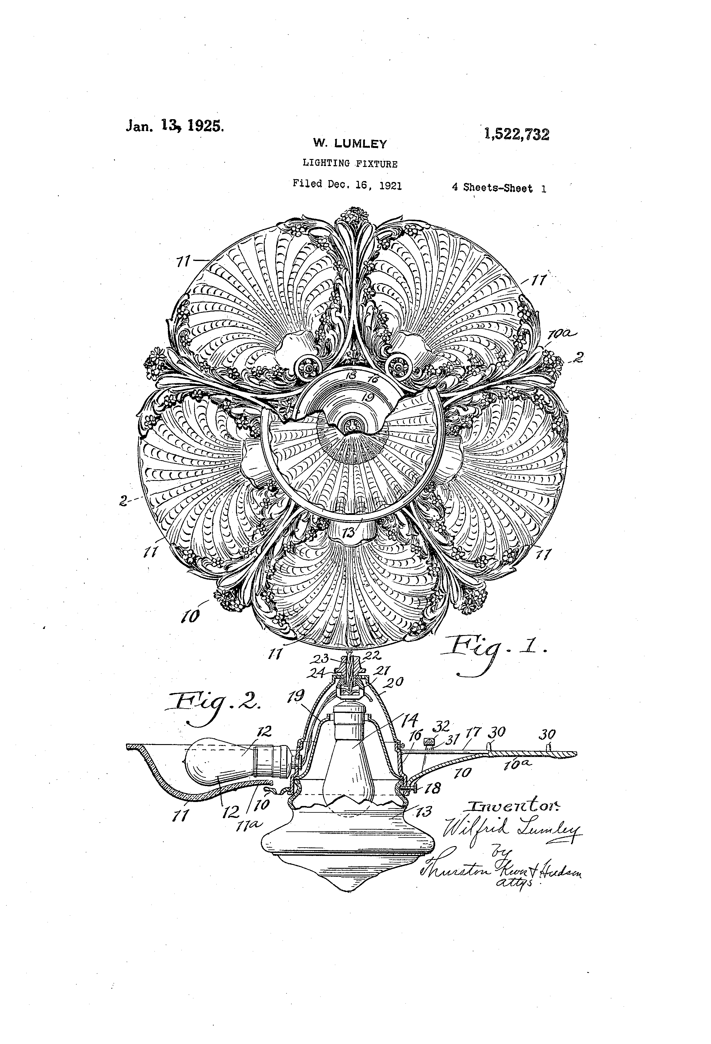 Patented Jan. 13, 1925. 195229732 UNITED STATES PATENT OFFICE. WILFRID LTTXLEY,, OF CONNEA-UT, OHIO. F RE. Application filed December 16,1921. Serial No. 522,757. 'I'o rjzl, q@I)IIon-t ?@'t 1)6(1@y co7,tce2,,??,: Be, 't known that 1, WILrrTD LuiiLr,,Y, a citlzen of tl-ie TTiiited' States, residino- at Coiinea-Lit, iii the co-Liiity of Ashtab-uil-,L aiid ,5 State oT- Olii-o, liave iiiventecl a certain n e-,w aii@T useftil Im,,:)rovement in Lighting Fixtures, of Nviiieli the followinu is full, cle-@Lr, @@ind e@xact description. TI-iis ii-iATei-iti,oii relates to t lighting fixture, aiid is aii inipi-oieiiient o-n tlie j'ixtiire coiistittit,ingthe sLLbject mattei- of my prioiapplicatio-n,, Serial No. 499.328, filed SeptemI)er 8, 1921. Tii aid applicati.oii 1 have slioa@,n aii in,,5 direct ligliting fixture con-iposed of a fr,,tme haviiig i celitral part stipportilig a plurftli , o-f otit,ivai,cll.)- projeciiiig lamps ,tnd a pitirality of ind-irect lightiiig reflectors indiviclual to tl-ie ltnii)s ,tnd preferably sup20 ported on pol-tions oi. arms of the frame exte,i-idino- out betaieeii the 1,,imps, each reflector Weiiig not only individual to the -taiup bi-it separa'Lely sLippor'Led and removable, 25 Tlie,, preseiit iiivei-ition rel,,ttes to certain feattires of constriietion ,iii(I arrlngeiiiei-it iml-)roA,c tlie effectiitei-iess aiicl 'Litility of a lami) fixti@ire embodviii- the iiiventioia of lily pi-ioi- Ippl-ic,,ttioii, aiid the iiiveiitioii PO ii:iav I)c b,-ieflv siiiiiii:iarized as consistin- in ceriain iiovef det,,tils of coi-istruction ,tnd combinatioiis qiid arraiigemeiits of p,,trts iv,liieli -will be clescribed iii tl-ie speoificatioii and poiiited oiit in the al)pended claiins. 35 In the accomp,,ti-iling sheets o'L drawings \vl-iereiii I haite si@o",ii tiyo) embodiiiieiits of the idven'tioii, Fig. I is @t view lookiiig toavard tlie, bottoiii of the fixti-ire@ as the same is vie-%ied frori beneath, ivhicli fixt-Lire 40 i.s aclapted to @be siipported fi-orn the ceililig, pai@t of .t I.ower cent-r,,tl globe of the fixt-Lire being brokei-i ai-,,ay; Fig. 2 is a seetional 7ie-Ny stibstantially along the Iiiie 2-2 of Ficr 1; Fig. is a top plaii Nriew of 45 the fixtiire of 2 -",itl-i part of [,he iiidirect lio-htino- ololies, ancl Ian-tps reii3oved; Fig. 4 is .t persi)ectli-e view of this fixti-ire oi, a reducecl s(,ale illustr,,iting the iii,,iiiner in whloh it m,,t), be siipportecl from 50 ,il-)oi,e; Fio-:. 5 is a top . plan view and Fig. C3 a bottom vieiv shon\,ing a modification; Fig. 7 is a sectional view oii an enl,,Lr(yed scale siibst,,inti,-,Ilv PIoii- the line of Fig. 5; aiid Fig. 8 is a top plan fragr4en;53 t@try i,iew of the ceiitral part of the fixture, .of Figs. 5, 6 aiid 7. P@,eferrii-ig iioiv to the forin of the iiii-critioii shoi),ii iii Figs. 1 to 4, it Aiill be ol)served tlicit tlie fixtlire includes t frame 10, prefer,,tbl \, but i-io@, necessarily foriiied of 60 nietal, -,n@l proviclecl ANItli olitst,,indilig arms 10", most clearlv illtistrit(',d il'i Fi(,Y 3. SLI'p])orte(I 1,@v ai-id betANeen tl-iese ariiis ,Lre the ind.i,@ect lightiiil,)- globes 11, preferabl-v foriii ecl of ti-ansliiceiit glass as describe,@l 65 iii niy prior applic,@itioi-L, and oi-nainentecl iii ',Iny ,ttltible ii-tani-ier. Thesc, @,ylobes -@N,Iiicli are boivi shapecl tnd face Lil;Avardlvl ellclos e or partiall.), stiri-oiiiid limps 12 whicli I)roj ect oiitAiT,,trdl3T from the centril pirt of 70 thp'ir,,ime thro-Ligl-i redticecl i-iecl@: portioiis I l@, of the -lobes. 'rlie aboye brief descriptioii of tlie parts o f,,ir referrecl to. apply to the, fixttii@e of i-n), prior tpplication 2 O T-ie of the irnprolTelnelItS of the preSeDt 7 5 iiive n'Lioii coiisists iii tl-ie provision of what mLy I)e teimed a dii-ect limp al),-l (,Ylobe @,,t the center of the fixttire. This globe is shoaiii at 13 and is preferlbly forii-iecl of -fflass of a traiislucei-it iiqture, 80 so as to o-ive, a diff-Lised liaht. This o-lobc, partl,,tlly eTicloses a lamp 14. The I (-@iiiitte0@ I)y 'Lh'Is lamp is transiiiitted tlii-o the (,,Iol)e 13 iii a dii-ect mailner as stiti,iilshed froin the iiidirect metl-iod of 8.5 ligliti iig I)roLight aboi it b), the; lamps 12 qiicl the i-ipivat-dly ieflectors 11, -whicli trai-isiiaittil-ig iii ,t (Tirect i-niiiner some of the lizht froni the lamps 12, reflect up-w,,,Irclly the ii-iajor portion thereof. 90 To tdiiait of the iise of tli.e lo)ver ceiitral globe loa ,tiid 1,,Lmp 14 ,ts clescribed, the frame is pi-ovided witli a Celitr@ll opeiiilig sliahtly larger than the ilecl@ of the globe 13, and the distribiitoi, for the laii-tps 12 is different, gr) than tli,-Lt sho)-vi-i iii my prior applicition. In this iiistance i.t is ; 11 tlio f orin of aii aiintiliis 16 ,Lri-aii(yed centi-ally of tl-ie fixttire and iii the for,,, of aii upstaiidiiip,, flange, This ,tiiitulLis to wliieli the sockelt@ed portions o'L@ ioo the lamps 12 are attached, as best sho-wii iD Fig. 2, n-i,,iy be pal-t of the ce,,stilig of )vhicli tlle f nin-ie 10 is f oriiied, or it i-n,,,ty be -@t sp, - p arate part ,ttt,,tclied thereto. I have prodii,ced vei--v efT('Ctivc,, i.-esitlts 1)v fori-iiiiig this lo5 anniilus o'f sp-Lin slieet iiiet@i) iihicli is set into the celitr,,il elilarged opeiiilig of the fi,iine 10, ,ind is soldei-ed to the latt(,r. Iii the eirent tl-te ,iiintili-is 16 constittitiiig the sup poi@t or clistrib,,itor for the limrs 11), is 110 formed of sheet metal, I may, if desirecl,, provide braces stieli as shoivli at 17, and coii--