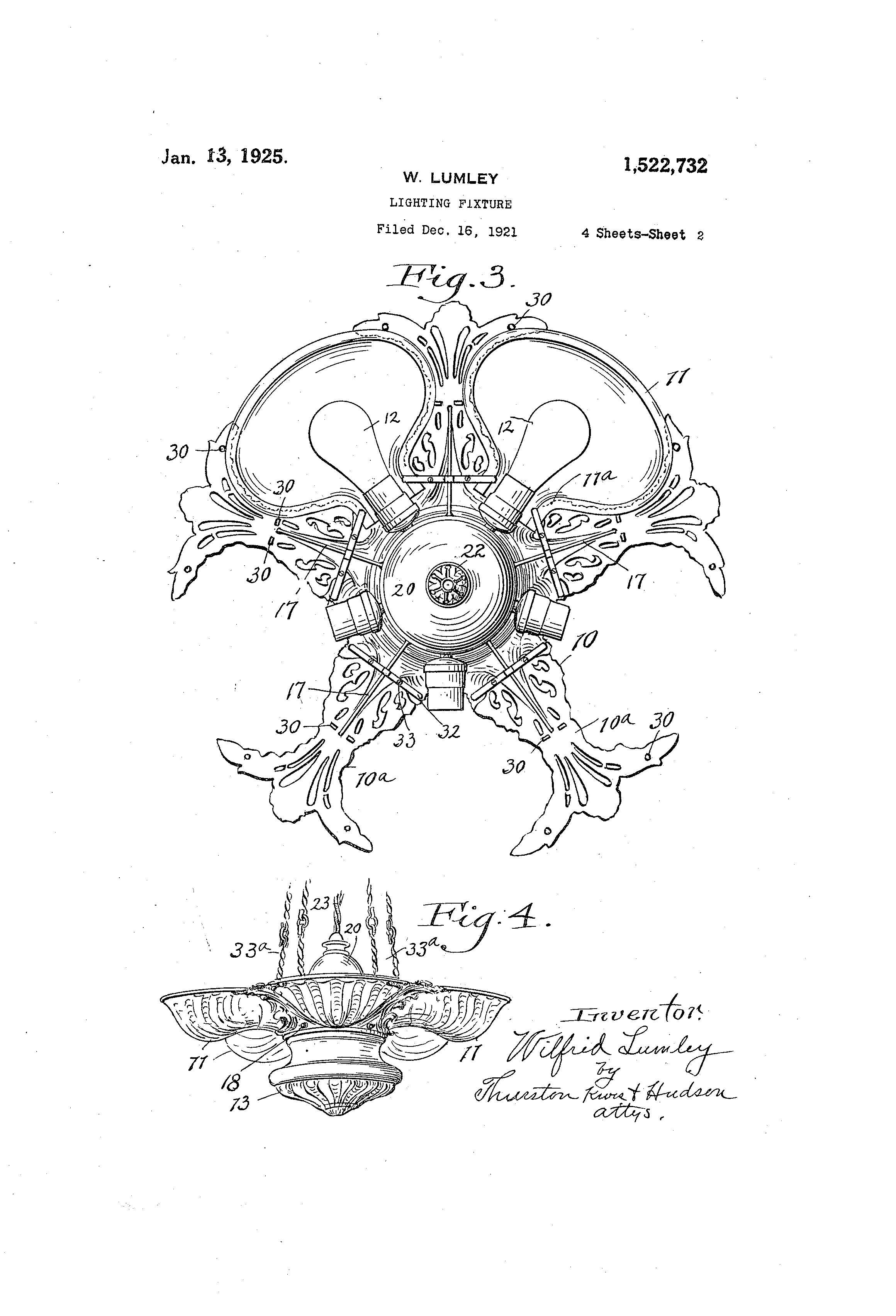 1,522,732 sistiiag of i-o(Is Avliieli extei-id fi-olii the tipper pai-t of the ,tiiiiultis otitv,,,,trcII3, aloiig the :ii-j)is 101, aii(i at its eiids attach to the arins ,i.iid aiii-iultis bv solderiiig or otlieriv'se. Otlier suit,,tble bi"ICII-10, lilellil-is iiiay lie einplo.),ecl if clesii,e(l, ,ti-id if fouiid iiecesstry. TI-tis coiisti.-ti(,tion proAT;Ides at tl-ie colitral part of the frai,.ie 10 ai-i opeiiillg il'ito whi,eli tlae iieelz of the (,Ylol)e 13 extends, iiid iii 10 -wl-iieh it iiia_),@ I)e lielOL by set screivs 1.8 oi:e,qtiivalei-it meai-is, olie of tli,,, s(@t sci-e-"-s I)eing sliown ii-i Fig. 2. Tnside the @Lniiuliis 16 thei@e is fitted ai-t(,l ,3eciired 1)@,, soldei-ii-ig or ol@-lioi@wise, a reflect15 ol, 19, aiid siii-rouiidii-ig this reffectoi, tliei-e is :t cloiiie 20, the extei-ioi- of ii,liieb ma.@, be or)iaiiieiited to acld to the attrqctlvei-iess of the fixtzire ,is i ivliole. The top of the rcflector lias. aii opeiiiiig tlti-oiigl-i ivhicli the ladip 14 20 (,xtclicls, ancl the socl@@et of this is seetli, I eci to a iiiembei., 9-1 attacli(,d to tb@ top of the (Tome by ,L fasteiiiiig ineinber 9-1-). AS hei-e slio-wii the parts 9-1 and 9-2 ,ire screwecl too-etlier all(I clami) bei-.weeii tlieiii tl-ie top 9-5 o?ilie dome 20. The top iiiember 22 li,,is aii opei-iin(y exteiidiiig dowii thi@o-Ligli it to aecomi-aodate the electric cojidtictors 9-3 by -\i,-hicli c-Lirreiit is stipplied to the centrql lai-iij) 1.4 aiid to the i-adially disposed Jai-iips 30 12, tl-ie etiri@eiit suppli,iiio@ conductors extol'icli.ll!-Y to the 1',tllaps 11), I)eiiig locatecl bet."Teei-i @lie i-eflectoi- 19 ai-id the ome 20, aiid tliei-efore coiice,,tlecl :Llrom view. PreferLbly the top of the cloiiie 9-0 is perforatecl as 35 SIlowii .it, 24, to, provide for the esc,,ipe o-f lieat geiieratcd b)@ t,be l@iii-ip 14. Thp, fixture showii i.n Figs, I (o 4 lias fiA,e, of the indirect ligl-itiiig glol)es It, and cojiseqi-iently fii,-e o-f t,he laiiips 12, the rtys from 40 Nvhich ,Lre tr,,tilsi-nittecl ,Liicl i,ef-lected by the (Ylobes 11., )vhereas the fixture shown in Figs. 5 to 8 has simply tliree of t..be globes 1.1 wbich p@,i,i-tially stii-t-oiilid 1,@imps 12 i@,hose socl@@ets -ire siipported froii-i t iniiel-i siiiallei45 disti@ibtitor slioivii it 25, Iiicl stippoi-ted bA, the ceiitral pai.t of tlie inetal fi-ame, liere desigiiatecl -)6, ,iiid liai,iiig- as befoi,e, oiitstaiidiiig ai-riis 26a oii the adjace,iit ina-i@giiial portioi-is of iilliich the glol)es oi- i-eftectors 11. 5o ai,e stipported. fixtiire slioll'i.1 ill Fio-s. 5 to 8 li,li@e ii is iiot tti@i;t sli.olvii iii- II-iy I)Flol, @lppli,c,-Itio ' I)r,ovided initli the loiver ceiiti,--,Ll globe' 13., ,iiicl tlier(,,fore the oeiiti-@tl part of the fi-ap.)e 55 is stibstantially solid ilistead of being pi-o-NT ided with the - f'@iii-lv 1,,ii-o-e central openi g to accoiiiiiiodate tlie'@-lobc7l3 of Figs. 1 ton4. it will be obsei-ved tliat-,, iii this iiistance the clistributor 25 is seciii.-ed to the central pai-t 60 of the 'Lr,,tme 26 by a iiiit 27 screwed oiito ,t thre,lded shaiik ,it the bottom of the distributoi-. This iitit 27 forins in e:ffect the lower central part of the fraine 26, ai-id is pi-efer,.tbly oriiamelitecl. to conform thei-eivith. Prefer@ibiv tbe di.stiibtitor 25 is deflnitely positioiiecl so th,,tt the 1,Llnps 12 Nvill exteiid out ceiitrally betiveeii the arn-is 26a of the fraiiie, and iii this iiistance this is brouglit about b3, pi-oviding vt tlle lower part of the bocly of the distrib-Litor 25, foiks 70 oi.- bifiii-e@,Ltioi-is 25, wliieh eiigage ul)stalicliiig piiis 27 oii the frame 26, (see Figs. 7 ,tiid 8). If desired, all the lall-lps 12 of eithei@ of the fixtures herein shoivii iiiay be coiitiolled 75 by a iiall sivitcli, or if desired, the lamps may be coi-itrolled ilidi-viditaII37 by - s,@,,itel@es, emboclied in the lamps aiid operated by pull cliaiiis 28, which as showii ill Fig. 7 may be t,,xtended through small opeiiings 9-9 il'i tlle 50 loi)rer part of the frame 26. li-i additioii to the noitel features tboi,e e.Nplaiilecl, wliieh are iiaore or less i.ndividii-,tl to tlae two lamp fixtures slioivii iii Figs. 1 to 4 ai-id 5 to 8 respecti-v,ely, botli these lamp 85 fixttii-es liave commoil featui-es whieb ,ti-e Dovel and are iii the iiature of iiiiprovemeiits oil-er the fixture showli in my prior applicttiol'i. @ Olle of these fe,,ittires resides in the means 00 for centering the inclirect liglitino- globes 11 between the arms of the fraine. This consists of a series of integral pins or I-Lgs 30 shown in Figs. 2 aiid 3 ancl in Fio-s 5 ancl 7. Tllese piiis, project up-wardly from and are ().,3 earl-iecl by the trrns 10a and 26a of the 1rames 1( aii(I 26 respectix,ely, near the iiiargins of the ai@iiis. Tbov ,tre so located that they en(,,,,tge the mtrgiiial flanges of the reflectoils 11, aiid thus bolcl the latter in place. On ioo the otlic@i, lialid, C@lle3T do liot interfere '"Iltli ihe i,em_.oA-al of the reflectors inasmuch as it is onli7 3iecessarA, to lift the maroinal portioiis ol' the reflectors above the pins ancl tl-ien iiaove the reflectors radially outl"Vard 105 froiii betweeii the arms. TI)e seconcl feattire comrnon to botli fixtlii-es liei-,ein illustrated, resicles in tl-ie mearis by wliieli the reflectors are suliported. Pior the s,,ippot-t of tho fixtures, the fr-,tme 10 in ilo one iiistance (Figs. 1 and 4) and the fi-@me 26 in the ot-lier instance (Fi,s, 5 to 8) are proi7iclecl ),Yitli Lipstanding li@gs or posts 31 which are ctrried by and project tipwardlv from tlle inner j)bltions of t.1-le ,,rMS loa 01. 115 9-6a, the posts beitig on opposite sicles o-i@ t'lie center lines -f tbc , arms. To the iipper etids of each pair of posts 31, a cross strap 9,1-) is e sectir cl by fasteiiing, dev'ces siieli as screws 33. TJi(,s(, are clearlv , shown in Figs. 2, 3, 5 i,,, o and T. The center portions of the straps are preferably bowecl -Lipivtrdly, and to these center portioiis the fix'utires sup