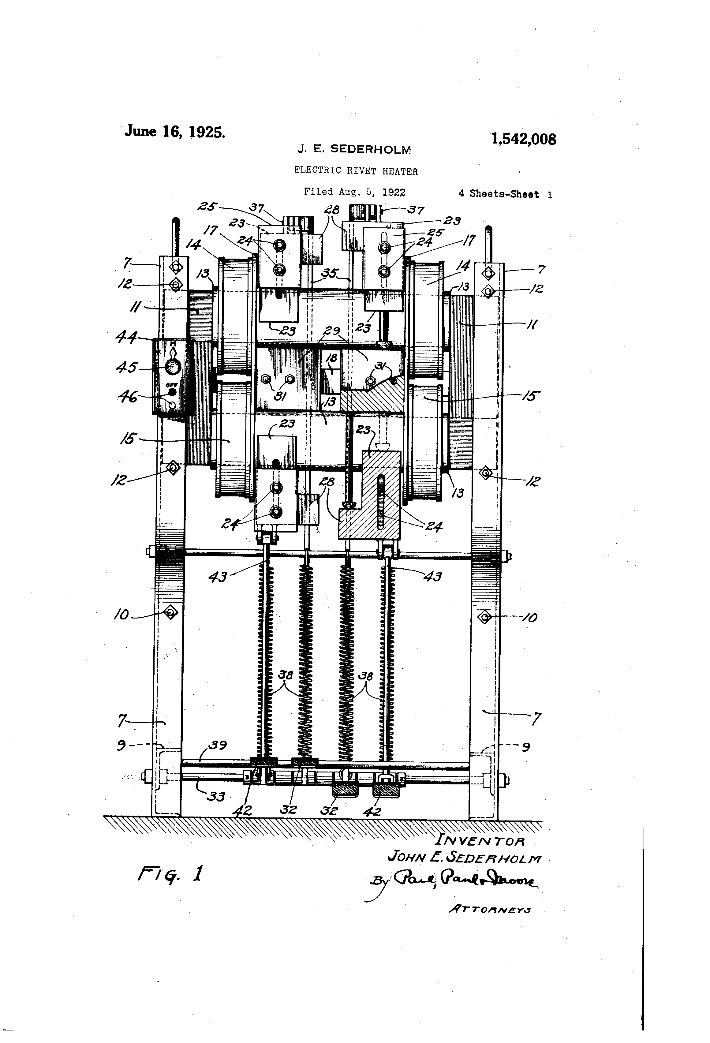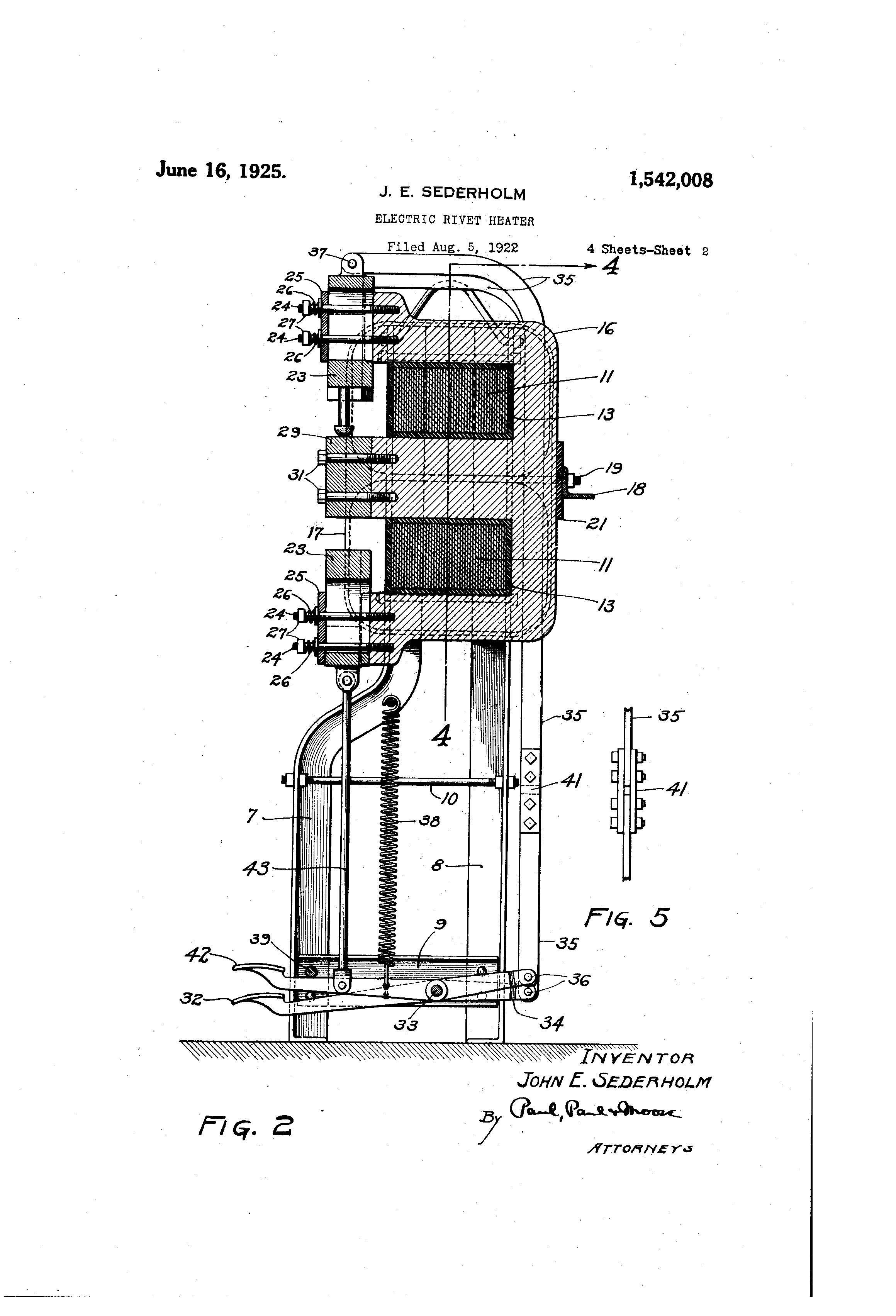 Patented June 16, 1925. 11542,00 UNITED STATES PATENT OFFICE. J'GHN E. SEDERHOLM, OF ST. PAUL MINNESOTA, ASSIGNOP, TO AMERICAN HOIST & DERRICK COMPANY, OF ST@ PAUL, XIN-TE,-,OTA, A CORPORATION OF MINNESOTA@ ELECTRIC RIVET HEATER, Application ILled August 5; 1922, Serial No. 579,940. To all qi@hont it M(7y concern: Be it Icnown that 1, JoiiN E. SEDFRHOI,,It, .t cit,ized of tbe United Stat,es, resident of St. Pgtjj, in tlie, coilnty of Ikai@@y and State of. Milinesota have invented cei-tain new and useftil. Improvements in Electric Rivet Heatei-s, of iN,Iiieh the following is a specificati(n. Tlii,-, inveiiti.on, relates to iiiiproveitieints in 10 electric heaters desi,-ned, I)artictilarly for lieatiiig 1-ivets for use in hot-i-ii,etin@,, striietur.il steel fraiiies for bitildings, bridges, ete. The prii-nary object of iny invention is to provide a 7@ivet lieater cal?able of beiiicr (Pei 15 ated to full c,,tpacity, contintiatisi and with y a hio,,Ii degree of efficiency. A fui-ther objeet of the inneiition i,, to provide a ri-,,et heater bavin- eacli of its se(,ondary Co,il-, or elements con,,tructed of oiie 20 piece, and, of practically an E f6rni, -,o ai to be in close, proximity with tlie, ina,-netic core, tbiis allowing practically all of the intignetic lines of force, set til) in the core liv the primary coils, to act upon sai(I coil-, 25 or elements'when t-he circuit is closed. A further object is to provide, ,t rivet hmter having removably mounted jaws, or contwt blocks for hol4inz the, rive,,ts, I so t,hat shoiild the conL%ct-, beeome daiiiaged 30 from wear,or arcing thev nitiy readilv -,tnd quickly be removed for replacenient: witlioiit disturbing the secondary elenients. A fiirther object is to provide, a I rivet, heater- capal,)@le of heating rivets of varioiig 35 lengtbs withoitt the neceisity of adj@i-,tTnents, and also one in which ti utimber of rivets mky be heated simtiltaneously. Other ohiects o,f the @ inve,,ntion will mo,re Place on the m,,i@,rnetic core and the iiieans for operating the rivet holdin 65 g jaws. Fi gure 3 is a top view slio-,viiig the genei-,(tl arrangeiiient of the diffel-ent, pirts. Figit re 4 is a longittidinal sectional -vie-,i, on the lide 4-4 of@: Figtire 2 and sliowing the, arran gemei)t of the pri,iyi,,try coils and the 60 secon diry eleiy)ents oi-i the iiiignetic core. Fi gtire 5 is -,t fra,-iyientai.-y vi(?iw,of the insiilite d joiiit oii one of the push i-ods for operat ing the tipper jaw sFi giire 6 is a wiring d,iagram of @the ,ip0 5 par,,ttt is. T n the ei-tibodiment of the invent'on beie shown , there is, disclosed, @i frame coii,.:isting of i@ paii- of froiit le-s 'i ,tnd rear Ikgs 8, pmfer ably of an(VIe l@l@'on. Tile frodt aiid 7(1 reai, .1e,7 oi-i,each side; are preferablv seciii-ed togetli er near tlie bottom by ti ei-os,, meiiil)e@ 9 riveted tliel-eto, tTid neai- the center s(,.ction by a tie-iod 10. A ma(,),netic core 11, constr iicted of litiiinate,(l slic 7.5 et,, -,teel@. erably rect-,tdgttllr 'li-i sliape is @ secill-ely clamped b@etweeii the front an(I le at gs tbe; top, b bolts 12, thlis providing a. ver@ y rtigged and stibst,,tntial frame. The upper and lower parallel longitudiiially extending n-iembers of t-he.@ i-nagnot.i.e core 11 ,ire covere,d witli a siiitable, iT@sul(,It-, in,- materitil 13. Oii tl-le iipper illei-nber Qf this core are inotiiited two priniar@, coils 14, oneadj,,teent, eacli end, while on 'the to)Yer 8 .5 itieriiber, ,tDd directly beiie,,itli the coils 14@ two sirnilar coils 15 are nioiinted. T o seconclai@y elenients 16, e w pr ferabiv of copper an(I of stibstanti.ally the letter E in 90 form, (Fig. 1)) are (-Iisposed iipoll the core 11, adjacent the primary coils, and are inful dwription sillated tlierefrom bv sheets of siiit-,iblp- in9 413 ftn ing,-,, and will be elsims: draw $close a . striietiire degi to ea the obiects t)f the "'tn-@ bilt @e llnA,ersto(A that the 45 invention i-, not confined to the e-,act, details or featiires sbowii, as variotis cha-ii,&es MR@y be, made witbin the, scope of the claims whic,h follow. In the drawitigs: A" Figure I is a. front elevation of an electric rivet heater embodying my invention. Figure, 2 is a ,tramverse -,eetional view 0 wcondar@y 4ements i stilating material 17 such a-s (,-,besto-s or i,n terposed betweeii said members, as.shiai,,,n in Figure 4. A bar 18, preferably (>f an@le 9t, iron, has it,,-, ends seclired to the re,,Ir of th6 frftme by bolts 19, with its 6entra:l @portion bea ri.ng a(Ylinst the rear faces of the seeondary eleiyieiits, thus, seciirp-ly clamping said elements @in their respeeti@,e Places iipon th'e loo magnetic core. This bar i.s. also i'nstilated from said elements bv suitable, instilation 21. Thp, objeet of forming the secondary elements as above described is t-o provid@ an 105 element which will snukly fit @t,lie Ignotti@ dinal ni mbpr of the coie. when mQ iinted 1,542,008 thereoji, as slioivii iii Fi(,tii,e 2@ ti,iis Tli(, [Ni,o lo iiieretislil"r tlic, of tlc il-I it Si, ll,tl-e liere slioi,,-n 1,)tit, tAN7( , ) t e I II Ile sli,i,j't c@oils, T)Itt it 's to 1)(@@(Tals to tli(, 1)1,o,.I@s fo@ll- priiii, 5 be un@lei-stoocl. i!l 40 - e(I iii iiiii-ril,,,er ,,iid c.,i,,,e lei N"Il@i 1!1)oll lioiri,,,Ii Po!-,:,t,loll til(@ stop the size ai-i(I o.' tli(,, (It,- ol, t sire,d. l'be j)rimai- coils bei,e slio@-@-ii t") coiiiplc,tel,,.@ ejicii@(,,Ijllfl I]IC (@OFe SeCtiOlIS OTI ol, tll(@ tjlei, i@- e tIliS tl)(,I.e 75 The l'Ol'W,11'clly, exten(1;11(1 i,,pper iii(I f'oilo@yei@ 1)j-,iii(@lies oi' tli(, elei, i@o tl)(, ai,(, I)t-oA-i(le(I i-villi A-e;@ticzil oi.- iii(i also @i tlieii- stiiii f)f@lts TI (? cilre(I to tile 4 1(, 1-i,t t 11, 12; 1 T'(' ,ind projeeiiii,., foi,Ai,,,tr(llvtlii-oll(Yil cloli- 'r] 1 lo%"- 1(".' t (i t'L I -11 i),,ate(I @iperttii-e@; 1) '@'O,T (1,, d 'ii (@ojl("I@ (,tol. 1 to '11) (,Tlli(l(? ol@ till, (17 ce,,i-(,, the (,n(Is (,f-' @- li(, ()II 1- f) flie ]ill(, s@ii(I I)OIt@, @"11(i "1(,I(l :S (,oll@,ict, ,)Tocj@s 2')) 1)