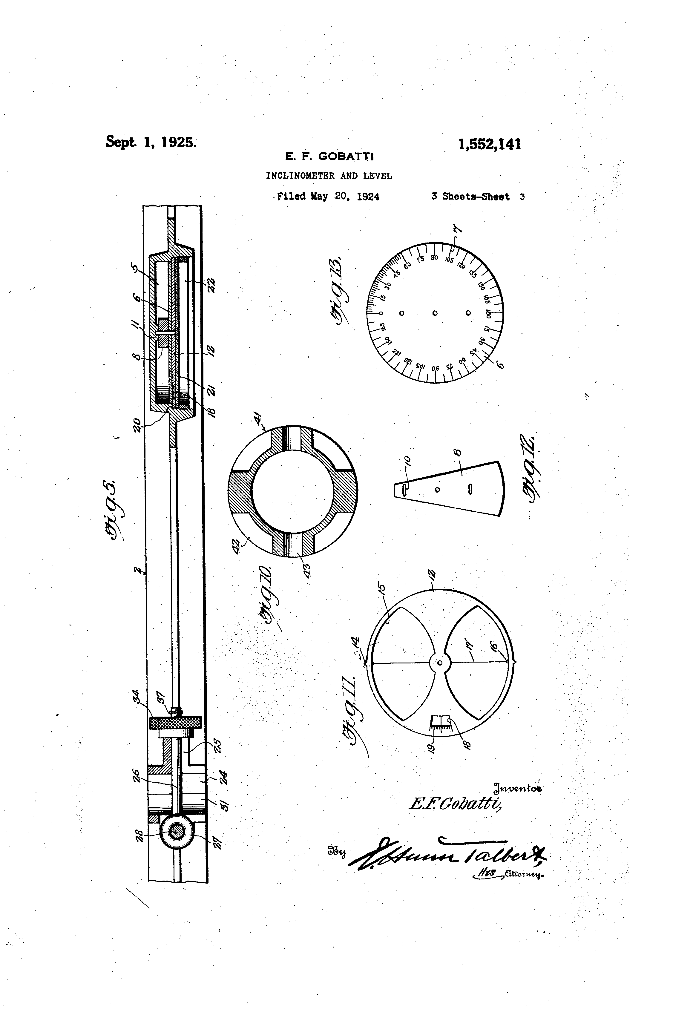 Patented Se t. 1 192 , 1 552@141-@ p UNIT'ED@ ST@A@'T@", PATE@'NT OFFtt, INCLIXOM-ETFIRI A ND, 3@EVEL, App,@icatiQn file.4 3i y 29, i' T@,. all'whom it' mciy C.07@de?@,n: holding the, sections in alignment. + e @ . S , 6 c tl o ' @ ' b e . @ @ . p B@e it lo-io-wn th,,it EDTvi:u'ND F. G'P'l@ATTI ft' p@riniitl'n@@ h -hs@, to citize'n of tile@-ttnited States-. of A@'@m@eri:ca w @e@6b@ @the@. mAy- be- axr@i@gp.a--inpar i-esidiiio- at Pueblo, in., the 66@iiily Of i@iism- and adj'a'@"@p@ . each th'@ o er in', a, 5 an(I St@ite of' Col'cira(-:Io l@'as ihii@nte'd' @'6@v, li@ com'pass; -w'h"e'r'e,13'y'- th'.- e , i ' n s t @ r i i n f e i i t s ippe and Liseftil Iinproyements in Incli m@ie@@ m4y. h" d in - , a,, j7 i n s t r u ' e n t 6 1 and, Leve@ls,. of whi'ch tli f 61 1 o wi'n@ 0,@ is,, w' WY@- or An m Ijpcification. tkis. b@ US(@d b - elii'n 1 $60 y ma The,'present ihve'ntioiilias t-6@ itsp.LLr@osa @ geii-' en gineers or, y: @ ose 'b' VI 10 to provid6 iii an, inciinon-ietler I ind lb "6@- y@ ei b f,@ ,ye'; a ei@a T @ ' d ing, rac i:g@ constrii6tion incitidihg li@eiiis. f6i-, iiibas'u"r'--; I @a"y"' 't@ -@ail"d':r'ppairiilz. roa, s. be @underst66,d @h i' ing inclines, in deeri-eegand@ mi'nlites' a'n'@l@'al@6 at@ tie p@trtictil@tr t@d'. o erelty ven ar,,@ i@i )@cf 7@,, y inea,ns @or brick or 6ther ma4onry anci '@e9,,ms, stiid'- th@t,,,wh@i@ 7 i4g, t" liio 15 di and: the Iike.' the' iiiven loii-@ ci-nv (iesireci of a pr op. orti on s miiy, ma Anotlier purpose.is to p@o-@ido an@ instru; deta11, ' Tid d'esirect b,@ d@ rnent of thi , ch@raeter prb@ided, with, in tb@o; 'i@66idinir. to- t 6ficum@ .Lor mounting an ii-iclihdti@n @Aea@ti@i@g c!4- s@@iade's., @o vice in tlae bod o@ the-.instrumen.t' @@ld a@- Th@ i'lli,@aiifi6n c6iii@;rike,@-fh@thet'f6atu@6s y 20 vice compris@iig, a-:weig-hied'di.@l @6f- @@,Tt's. t6- b@'e her@inaft(@@ d6gr.ees and@ ininiit6@. subdivisio'n' s,, sc@@ sei. f 6@th; @@'O,wn, i,nl d'r'a.'wlng anc iii@the body of the,ilastrument. t@at i@l-len the ti.z I instr-Llment is enrao-ed with, a sutfitee e:iiie I y n th level, the, eii)@e-r'aV,tlie top of, tlid dfal'-ivil@@ iii @le@v''a'ti@o'n o@" t'h'e- ',mFiktire 1is. a 2 5 l@egister with an ih@licator- C',Il@l-i6d b@ ihe v6d' i@iielinoiiiet@i@ a@4-le@ei', ruet-ed iii pro bod of t-l-ie iinstrument -,ind in c@tse thQ @sur.- 6,'ccordAnce *itlic il@e iii@6@iion@. y f ce on@ ivhich@ the- iiistrunient.6ngages. isiii-- 's, a ed @,iew, 'of a F igure, 2.-, 1- 9f cli-ned in eithor directioii the graduatio@@- t'h@- aine. 8 on: the dial will. cooperate- -with th6. lhdi'cat@Dr, igur.e 3@ is@- a,,' Vlew,- ID_ el6@- ati6n 6-f the I't i@ 'b 30 gi-ving. the, de,-ree of aiio-@le 66t'i6iD., @q- 6E i@@- i@Qii@a6in@ . . I Q, Y!Pljg interiiiediite t6r. tli,qt the instr.Lim'ent' may be Lised fbr- is, @gh .6@e. .:n ig-ure is-,.a, secliona, .,view. r@o- . cort,ainino,, the- incliiaation of.@ a stud', @el6,- o@-'th@. @ndt s@ectibi@s, 6t'il@,a in;cliiibm@f er@:oiitii,e to a. perpendic-Lila@, by. digposiiig the in, 'line - strtiw@ei-it adjacent to the St_ud whi'li 5- s,.- a,. s@6ti6nal Vie-w oii @linp,. in Q case 3r) the clial will cooperate. -with, a@Lother iii-, f' o Figuib,-I.-, dicator. cirried by a,@.@lhte on whi@ht tli6 X@a,]' Fi@-rure W. 6' e oii..@ liii6,@ 6'- is! part-ly, support@d-. St-ill, anotlier purpose. is to @ provid Flgu@-,w- @a,,- go e an, insectioiaa ..viow pi!- @lifle, 7-7 clinometer- and level- ineludiiig a,. body. P.r6@ 40 vided with, means fo p @o Figiiri',,,-S- "s'@@ii rp r Su p r,tin-& - bw@o I of tb6L ii@-ter edilevels,. one.@ f6r leveling.. hori@o-jal stirac@s. and - t@e , other, to, plum!) tn, obi @et.- ])@rF ' l k a i , - a @ - - s @ e i , i 6 i i a . 1 1 7 ' 1 , e @ @ W 9 clictilair.ly to..@.-hoiizo'nta-1, rifteei.il@ere@b ihr,6u4j@ th@7pi@.ts-. Sii e@ng,, c me,ans. for, i-et@i@in , the. s@i@iit 16v@I'li6liiiiig on t'i@4 l@ hol' ez@- 4L 45 in,the bod@, of ring-@s i ereSpIrl'.@ e, by i-he-rinors,m@y be@'di@pos .- ifrer.ent. p eff in,d F@.igu-rgis @-a V16@ gn. 0 f siiions. f liher- of,. th@ spi@it', le@:vel's @m @a@y. *.6@, 12-l' @-@ : 100 -Lised', for@ leveeiig,: horizontal,-,surfAces- . r4@lg'ure,,- 127 i& a-,&t-alli -e-v@', 61-, ose!-i@ the 31 a -li]7.P i)ovision..of-aii. igure 1 VI]-e-W ip7 e@OV440 A f,urthert 00 inciin6mete.r aiici 16vel compr-,i@in -,a bod-@..,ln7,. the, ctial 6., -y, cluding@a,;p,iur@lit of-s@peti0iis di -W IA is an h at@e d, tw6 exyd so@t,@ons wi m AA 9@, 0 115522141 showino, a, plate secured by screws thereto, @re @' the th(@ eing one on eacli side thereof@ pla,te havin(, engraved thereon the rise per foot for each degree, from one to twentyf our clegrees. Figure 15 is a vie@v in elaitation of a, portion of one side of the section 3 of the inclinometer with a plate simill'ir to tl-iat shown in Figtire, 14, there beiiig one of Is,,,iicl 10 plates on eael-i side of the section, the plate beinly provided with the rise per f oot for eacl@-degroe, from t-,wenty-five to forty-fi,@e degrees. Referring to the dra-wings@ I designates 15 the inclinometer and level as t whole, the same comprislnogthe intermediaie sectioii 2 and the two end se@@tions 3 and 4, the foriner being to tlle left of the sectioii 2 aiid thB latter to the right of thB intermediate section. 20 The several sections may be consiructed of any suitable materia-1, preferably aluminum, e - ,tnd Lre of web construction and tli inter mediate section in its web is provided with a depressed seat or cavity 5 for the recep25 tion of I the dial .6 wliich is pro@,ided with graduations 7 in degrees @ind minutes. The dial 6 has a weight 8 sec,Lired thereto by means 6fset-screws 9 whiel-i enga,@,e, '5 through slots 10 of the, weight and are 30 threaded into the ditl 6. This wei-h@ extends -,Lcross the center of the dial @Iiieh is -Li tec -ied teel mo n I on a relatively hard p6lisl s shaft 11 -which passes throiigh the dial ,tnd we,ight. In f act, tl-ie shaft is mounted, upon 35 jeweled bearings, the, larzer elld of tlie weight dependinz below trie sha-Lt so that, 