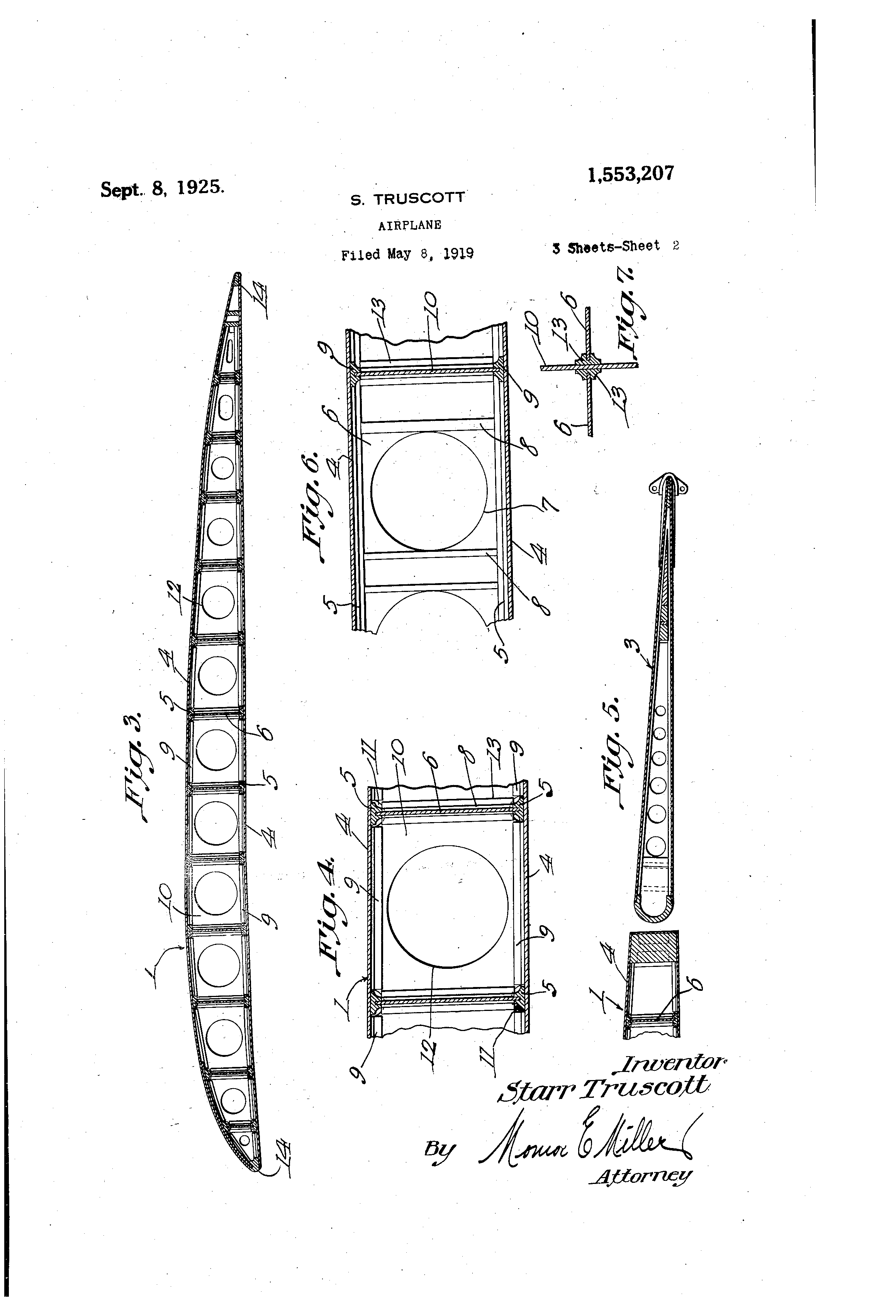 . 1 1 5 5 3 , 2 0 7 . . . Patented Sept. 8, 1925. @UNITED STATES PATENT OFFICE. STARR TRUSCOTT, OF BIRXINGHAX, OHIO. AIRPLANE. Application filed May To azz lohom it may cone . ern.- Be it known that I, 'STARR TRuscoTT, a citizen' of the Unit6d States, and r6sident of Birmingham, in the county of Eric and 5..State of Ohio, h-,ive invented new and use-' ful Improvements in Airplanes, of which the folloivin- is a specificatio@n. The present iilvention. relat(,,s to airplanes, and more particularly to the wing or plane an4 frame constrtiction thereof. The. prevailiiro- practice in constructin& the wings or lanes of airplanes, is to se6ure transver@e ribs to longitudinal spars, , of whiel-i there -,ire usuallv two, ,ind to stretcb 1 r) f,@ibric or other pliant m.aterial across upper@-and lower edges of the ribs, whereby tl-ie pressure and strains imposed against the fabric is transmitted to tl-ie ribs and thence, to the longitudinal spars. This results in 20 an uneveii distribtition of the stresses and sti,ains, and a plane cr wino- of such con-@ struction bas its maximum @trength tran@versely thereof between its forward an . d rear e(i(-Yes, thereof, instead of lonoitudinall y in 25 w@ich direction the frames extend, b@@aiise the longitudinal or riaembers must take iip ,ill of the s= imposed -on the ribs fron-i the fabric. Consequently, the spars nlust be of @great strength to resist the strains 30 aud pressure rbsultino- from the air pressure and the bars are th@refore the vital members of the framework of the plan.es or w3@he' obje,,t .0-C the present invention is'to 35 improve the winc, o.r plane 'Construction, by Ulbilizing a sti-ff o@ rigid shell r skin, such as ply wood,. sheet metal, or the like, instead of the usual pliant fabric, in order that the shell will prcivide a large factor of strength 40 in itself, as compared with th@ shell of a steel ship, with longitudinal ribs or members within the shell to take up the strai'ns therefrom direct, said ribs or meii-ibers being of lio-ht co..nstruction and distributed in a: coiia45 pirativel@ large number transv6r@ely of th6. wing or plane. between its front and rear edges, as contradistinguis,hed from the use of the spars now employed. The present construction also ineltides transverse braceg 50 at longitudin:illy spaced points in order to reinforce a'nd stiffen the wing or plane trans-8, 1919. Serial No. 295,740. @er sely, said braces intersecting the longitudin al ribs to mali:e the framework or sIK:61eton structure more rigid, biit the strains and stres ses are falken up by the shell and longi- 55 tudin al ribs direct. !3y thus pron,iding g, sti:ff or rigid shell with a relatively large num bet of longitudindl ribs tjierein, the wing or plane will have maximiiin strength in ,t longitildinal direction as requi@ed, and 60 the constructi6n will iake up the pressure and strains uniformly throughout without the excessive stresses. and str'ains existing at certa in p6ints as in the ordinary - construetion., @ With the present arrangement, the 65 wing or plane is of substantiary uniform strer r,-th i@hrouahout its area, so as to avoid or reduce to a minimum. the tendency for the wing or pla-ne to buckle or break, and at the same time, obtaining the results without'70 materially sacrificing the lightne'ss in weight of tbe.construction. A further object is to provide'a novel assemblage of the sher, longitudinal ribs and trai @sverse braees in order that portio s of 75 n both the ribs and brace,% can be continuous acro ss the points of intersection, and to Provide other features of strength. An other object is to provide struts for the plan es or wings embodying some of the fea- 80 tiir6s therec)f, viz., a stiff shell with enclosed longi tudinal ribs, -providing a light rigid cons truction instead of @ing the ordinary solid struts. , With the foregoing and other objects in 85 view which -will be apparent as the description proceeds, the invention resides in the cons truction and arrangement of parts hereinaft er described and claimed, it being underst ood that changes can be made within 90 the scope of what is olaimed without departi ng from the spirit of the invention. Th e invention ig-illustrated in the aecompany ing drawings, wherein.- F igure I is a plan view of a portio-n of the 95 plan es of an airplane, portions of the shell bein g broken away to I sliow the skeleton fram ework. F igur6 2 is a front view thereof. 'Fi gure 3 is an enlarged cross section of 100 the wiiag or plane taken on the line 3-@ of e 1. 1,553,207 Figure 4 is a still further enlarged view of a portion of the section shown in Figure 3, to illustrate the details more - clearly. Figure 5 is a section taken on the line 5-5 of Fi-ure I showing the aileron. iA igure j'is an enlarged lonolitudinal seetion in detail-, similar to 4'. Figure 7 is a horizontal through the intersection of a rib, and brace. 10 , Figtire 8 is an elovation of one. of the improved struts. Figure 9 is a cross section taken on the line 9-9, of Fig'ure 8. Figtire 10 is a similar cross section showing a modified form of strut. Fi(rures 11 and 12 are sections correspondincr .-,@vitli the s6etion shown in Figure 4, hnd showing modifications. The present'improvements can be used in 20 planes or wings of'various forms and Fig@ ures 1 an(:l 2 illiistrate one lialf of the spre@d or len(--tli of the I)iplane construction, in ed to,tl)e conti-al sectioiis 2. Th.e wing@% 25 1 bave tl)e ailerons 3 as usual. Referrin(r iii detail to one wing or plane seetion 1, the same comprises t shell or sli@in 4 coinp6sed of ply wood, slieet metal, or otlier stiff or rigid matei-ial, and is of tlie' 30 11sual foi-m, as seen in Ficrure 3, being hollovv and liavino: suitably @ui@ved upper and lower gurfaces. By iising the @tiff or rigid sheets of wood, metal or other stiitable material. the shell or skin of the pl,,Ine will con35 stitut4'?@ one of @he main factors of sti-eii(, @th instead of the skin b@inir' pliant 'as tisual and