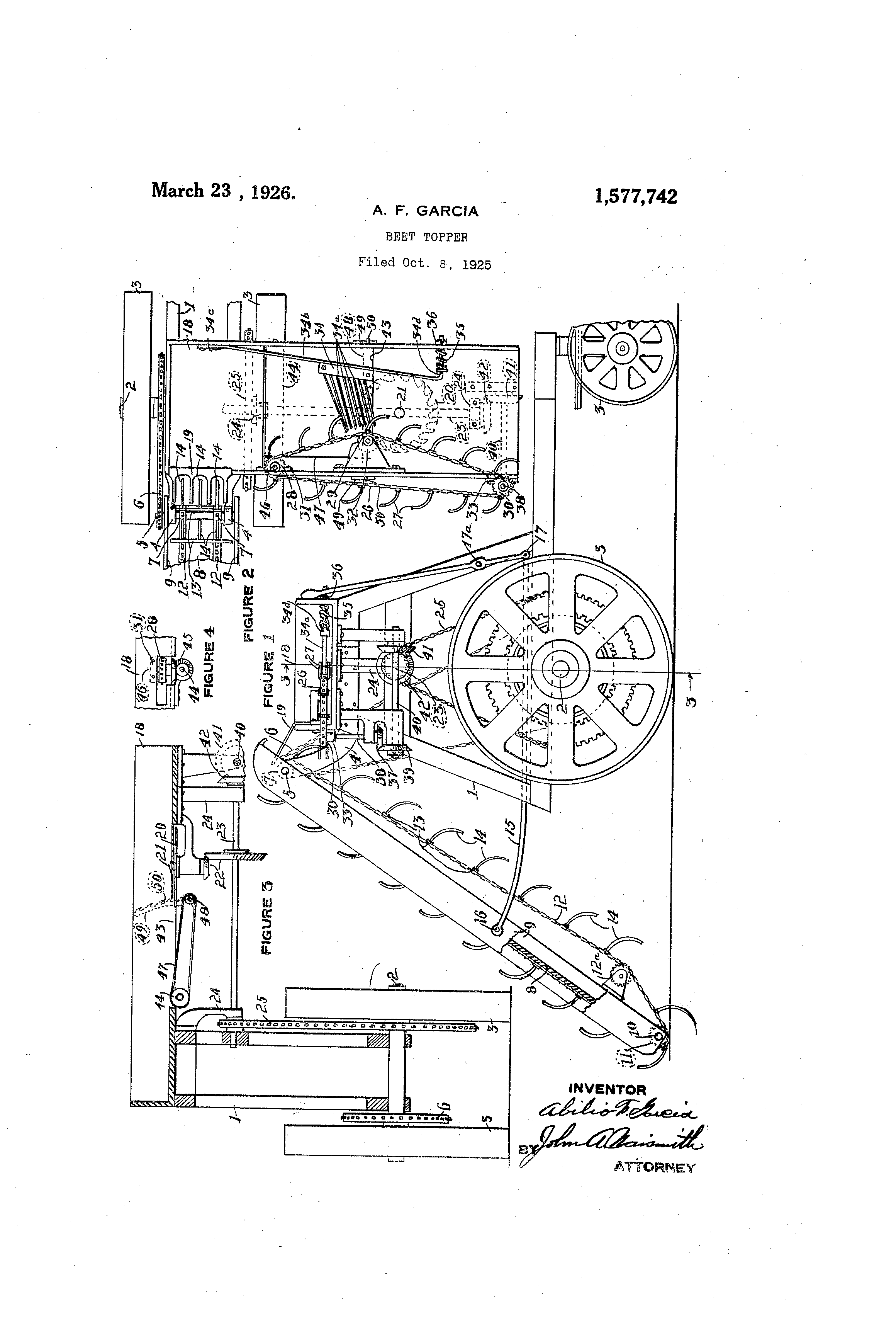 the cuttino.- bi-acle 20 proje6tin(- beyOlICT tlle g l- S @ince s foravarcl e o ii openin i clist a sliow,n. @o At 44- I slio-", ,t i Iler iiiouiitecl just beloiv aiid parallel ivith the rear ed e, of the open9 iiig 43@ancl haiii-ig a ge,,tr con,,iection 45 witli the sl-iaf-t 46 of ge,,ir 28. Oii tliis roller is a I)elt 4@' eiigaoino: ,in idler roller 48 carried t) _ by notel'iecl b,,ii-s 49 enga3g,-ing pii-is 50 oii the 1 0 of t,i,oti--ii This i.dlei- vol'tcr '19 POsit;oilcd be!oav 1)1-,I(le 20 i-.id I)ai@,iliel iA@i'L-li tiie forwar,, an(.1 ilia-y be of ol)e-iin(- 4i, i,aise@[ or loivel.,e,,l aF@ eLei@-,ed tiecoi'diiig to the ("Liiit Ole-s;-i,ecl to !,)el ciit fi-om the b@-ets. 15 !II 0I)erctt;oll tll(" m@ielii@iie is (Irtivil ,Iloiig !,)e-,t I,olvs ill ivlii,-,Ii t'lie b,,,ets liave been pl'eN7iotl,sl@- loo@@'e-Tiej 1)3, iiieaii oT a plokv or otlier suitable device, aiad the elevator is lowered unti'l the Riigers 14 btiter the loose groun,,l Avliei@e they pick up the beet@- ,incl deposit tlieiti iii tbe, troligli 18. lie bee,ts o. The oper@ito,- nov; pici@s t ,t ,i, tiii-ie aiid 1)1,,ices tlieii-i iipside doAi7 ii the foriiie(I bv the finaci-s 2'@ aiicl Chain 2('). '2 5 Eiel-i 1)eet iF@ noai, drais@n - for@varcll@- oii tl-ic 'f@)elt tlie, resi.lici-it eleiiieiats 34,q ancl U'--liio,,il Lig liolcl iiig the beet sii Iv iii the c-l-aiv, AlThen tlii@ beet eiiL)@ao-(@s tic bl,,ide 20 revolvii-ig at Iiio,h spe-,cl 3u tl-,o, lieacl poi@tion betiveen tlia blade 20 aii(I I)el,L, 47 is cut of-r, t-lie amount reiiio-%-ecl beiiig detei@-j,iiiie,l 1).y t-lie position of the belt relatii7c to tlle li:nife as described@ The vai-ioiis o:el nd chain col-Iiiee't-,ions 3,3 of co,@ir,,,e, I' )]--Ope-ly 1)1'0portionecl to seciiile the desired speed@ of 't-lic variotis oper,itin eloi-iteiits, 'IDd it is also to be Lilicler9 stood tli,,it cliadges in form, coiislruction anl liietli@)cl of iiia@, lie iiia(le A-vitbin 4';) i sol)o of the ,tppencle(I cl,,tims. I Iii @i bee6 topl,)ei-. t ttbl(-,, a ciitter eleiiioiinted partllel ivith ,ti-id iii el.ose i)ro-,--iiiaity 'Lo the bottoi-ii thereof a 4@.@ bf,.It operati-@-elv ii-iotiiited on tl)e table to ii-iove in n@ I)Iztiae plraliel to the cutter @-,,-icl ,iljacent tliercto, ,ipacecl beet elet, @, zn iii.eiits i-noti-ite(@l, on sai(I belt tiid arran,-,-e,,l tO SLII)POI'T tile.L-ects a' riglit 'o tli,@ meaiis iiio-Liii' cl :ii o-,,)os c 0 -ilieil' ie i ciiti@er r(@@ el I .-elation to stiid bel'u ,ii-id ad4aceiit to siid t-tei -ie beets carcii" - ind acl,.ipte(I to tl i-ied t-@iei@ebv, aiid iiieaiis for oi)eriti-ii,,- -Lhe In belt and ci@tter i-ii cooi,diii,,ite - r-elatioi-.- witli cci(Ill other. 55 2. li i 1.)eell, to per, a tab!-e, a bec@t cerrier p 111OL[iited @Lo JI'lolTe Ovell tlie. botto,@ii ol s,,t i- d t,,,.I)le in I)zAr(II.Iol i-clatioi-i tliorcto tiicl @LC,iIC(Iiit tliej,oto, s@ticl cai@i-ler iiielits i.-i@il)te(I to s pp u ort tiic bee-@l-s in I)er- 60 r(@lat;o-i---i to tlic, bo@'toiii ol' a i d ,Liid a.clttteli- opei-,@,tii-e!AT L tlic, I)tltll of tlllq%",,]. of t'lie be.-@-s i@i s,-..' C, iiieai-i,@ foi- oiiei-,itiii(, said c@i.,rier @,,nd iii coor,,Iinpte j@eli,t@loi iv:it c a,,,, h 65 I.,,i t 1.)eet tol)per, ,t t,,tble, ,t carri--r belt ol)(-,i-atiATC-ly to travel ed(Y tlicreoi,et, iri close pvoximity t-l-iereto ,tnd car,n(yers Z7' beet et!gaa'lllfl 1 o,,i k, - 70 -1 To,. tli' erefrojii in tli,- d;- "ect@ion of tr,,i,-el oi' il)e b-li@, i CIL, iti@'CIAT ilio,,,Illted iii iliic ol@@ of the tiid iiieaiis T()r 6i)c@,,,-,.it75 'L-;Otl Ivitlil ol,-Ilkl,. 4. Iii combi--,i,,t'uioil ivith a. t,,iblo ancl beet cai-i-i-,r and cutter iiiecliaiiisiii operitively iilcluilted thereon, a Pesilient cleiiiei-it iiiouiited o I n the tabl-- in opposed rel,-@,Uion to stid 8o cari,ier, ancl a plui-,ility of resilient faiigers inouiited on said eleiiiei-it ,tncl exteiidiii,)- out therefroiii to poiiits adjaceiit to said carrier t,,ible, i c,,trrier belt s5 5. in a beet toppc,,r, a oper,.itiireiv iiioi-t@-itecl to trtiel edge@yise lose pi-oximitv tliei-eto :i-,I(l Sl)',',L(.(@d I)eot eii(,ao-iii'@ fin-ers etirvino, @i-it,,Yardlv tlierefrom iii tlile directioii o'l ti-aATCII of the belt, a etitter oper@,iti.vely go i-tioiiiitei-I iTi the path of trai,el of tl)e bee4LS ii-i said carriei-, ail(',. resifient fino-ers iiaounte(I on saicl table iT-i o posed relat;,oi-i to slid belt p -.nd extendi-no, between sa-@d space,-l ' Z, ABILIO F.