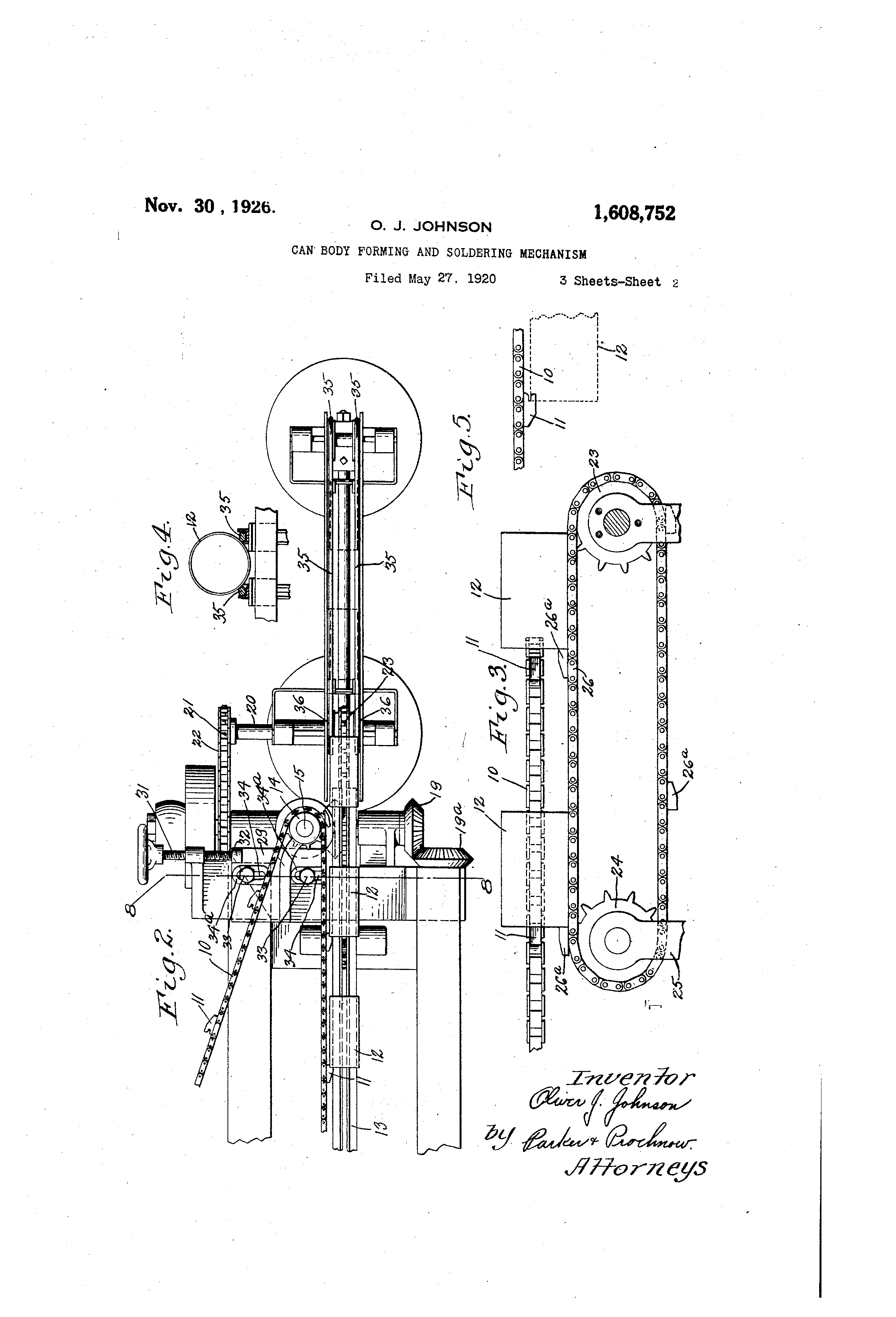 1,608,752 by suitable ii-ieans stieli -ts by the staiidard 1 25 on the inaeliiiie, to tetuate the stripper or eje tor inei-nbeiiyliieh, in @LIie eiiiboclimeiit c disclosed, consists of the encliess chain 26 -v,-Iiieh cariies i I)I-L,,i,,tlity of Itigs 26a. .n the type of iyiae-hine i li.tisti-ated and I'l desci-ibed liereil'i the coilve@oi- oj)ei,ates i .i horizoiital pline and iiitli stic'@i a strucI'@,,ivo foti-iicl it pre-'Le-able to operate 10 tiie e,-'.ector or st@-i per chaiii in ,t vertic,,tl P iloii7ever, the illiteiition is ilot, lir@litecl to this i-elf,,t,io-Ti of tl-ie el-Lains since rianif ostly they eo@Lil,I be,. .IifLei'eiit.ly associitecl and cool)el.,at-1, as I-iereinifte-,! explaiiiecl, to 0 gce mplish the inteiicied purpose. Iii orcier to proiicle for the most effective of ti).e ciii bodies, the SI)rockelu wheels whiel-i opei-,ite the stril)per bear@ a cert,ii (lefinit elal;oii rocirel@p e r Lto tl-ie Sp - 11 operating the co-,iveyoi, iii that the stril)per sliould trtvel at ,t sliglitiy gi-eatei@ iate of speed thai-i the conieyoi-. I,,i order to SO-ei-ire thi-S result, i@-,i -,lie coilstructilon SI-io,-,ii, tlin@ sprocl@et ivheel ic'Ltia,tiiiothe stripl)er is 25 mad,-. sliglitlv lar,er and l@)rovided witli a n -gre,iter nuciiibei, o-,-' teo'tlh tlaaii tbc,, cop-i,eyor sprocl@et, ii-i tctr,.al P, ritio o-f' 11- to 10 havii-i(y been T-ound desirpble. I-lov,,ei,e-, it is to be ,ii-iclerstood that this inveiitio-,i is not @uo b,- ii -miteci or res'ui-let-c@d to +@ile specific iiieg-ns i,ec"ted qs the saiiie res-Lilt iii,,ly be Peiiieved in It illimbell of ways. In orde2 'Lo -ccommoclate t@ie P.-qcl-tiiie to c,t@Tis of si_zes, a Imo,,vii coiis'urtiction is iisecl in v,7h,'.Ch "Onvevor 10, SI)I,Ocl,-- et -14, shaft 1-5 Piid the T)iiiions 16 @-,-id 17 .tsso.-iatecl Viicroivith iiia-y be la@'erally, To of beii-ig done, the piiiion 17 is sliiably IKeyed to tlie shaft 18 as 40 ' ' - all @ a. sha-l"t 15 is jotii,n@,),Ied 4@t-t -9@7 d tlie vertc iii be,,iriD-gs 28, 28,1 oii braci@:et 29 )@,hiel-i is acljtistable laterally oi-i the fr,,:tme of the The brq;cl@:et 29 is provided -with 4 t) t cl-.pe-Pdiiig yol@e 'O for shi.fti-ag th- bevel ,gear 1.7 ii-id il-ie btacket is adjlisted to position throii(,,I-i iiie-,ns of a b@iiid sci-ew 31 s-.ciii,,e-d to -,L Iiig 32 oii the br@icket 29. Ad(yf the bracli:et 29 is -,naintaiiied bv iiielli-ris o-10 set screws 33 th--,,e@L-.Ied iii tl@e 60 f -ard 1)assiiio- tll-i-o-Lio.-Ii gili-tao'le slots 34 in 'Itn C-,Ktei-ision of t@ic br@icket 29 ,tD-cl bear@ing upon sl-iotildered po-rtions '04--, de!-Liiiitino, tlae slots. ,55 In CODneCtiOn -Vl@@th this iirpr-oie.-I stiippei, or ej-ctor, I prefei@al)ly I)rovllcle ,i -deIii7ery eiev3ce vs illulstreed, compi-ises t-wo ei-idless belts oo5 iihich,ai@e driveii froi-ii suit@ble 36 -.--Qoiinted o-Ti th,- s@li,qft 20. This d--'Iii,ery devic- - opei@at-es 60 flo rec,,ei),-e 'L-be ca..-@ @bodies frojii the ejector @ll.l.ld clischa;-,o,e tl-iem from 'L-he iiiael@iine, and sei-ve,s ,is ft cooling meai-is for tl-ie solde@red selq,-Ms. In the operatioii of:the device the formed 65 . can bodin,s :Pre carried over the fltixing dei,ice) lioi,n aiid )vipe,-s by iiieans ol 113 co-t,,i,,e3,ol, @0, tl-i-- rel'afi-ITel-Y fixecl j!.v-,-s the s'i-,)'L-s or i-ec,3ss-,s iii the 1-[ the c,,,-i boclies froiii oi-- tii,@-stip.-, dtii-iii,- tlie,,,., iiaoitejiient 70 ti,e iiiacli'n--. As the cap. body is pi,o,)ellcc" f-or-@vtrd it i-ea,.,Les It pos,,- Oi"t aclj@ice-,-i4l- tli(,, ejec'Lor as i-!!tTs'ui-,ttod at @L-lie o I'll F@@g. 3 oi' t'iie aiid one of 'c, 1 elu,,-,,s 9-6,, c,,-@i-i,ied bv !'lie or eiecA t tli(- oi@ LIlo caii. @@s h e dii-ect4o zi@id i-a@te of- s,.)eed ' 1: I an the co--,Ive-%,,or, er IIIL" Ls the c@l-i h,, i L@ o .e SI--,- 11 -- g-c a-utilly th-- can froii-i the slot -t, iii @Llie co-,-a7evor lvlie'll tlle can has -,,,e--eh,--cl -'Clio ,)os'7-'@,ion d'ca@ed at the rigl-it I iii Fig. 3, it ivill be oiit of e,,iga,,-;e@iiei-it with the coiave3,or I-Lig, v,,-4@th the tli,,tt the st2ippell is to deposi@Ll i-t upoii the de'@' o' 1 ' m livei-.-), iii,-,ht ii,,,Lll -.t liiy dall(,-er o.L cri pbeii0ii -ng 01- dis'(,,@@tir, the ecl(,Ye of the ecin bo(-@,y. -L cl,,iiril -..s -,.ay iri,--nt;@oii: 1. iii aii apparatiis of the type set forth, a -,onveyor for raovincr can bodies Iloi-ir, the solclbri@-i:.@ horn of the inachine, ,I. verticall-v disposed shaft carrying .a-icaiis for actLl"ttin,, saicl coiiN,eyor, q tralisversely disposed slia.-t, ,t second traiisverselv clisl)osed sliaft liieans Q5 for drivi-tig s,,ii-d shafts, a sprocli@et inouiitec't op- saicl seco-- ,,id transverse sliaft,, ai)- endless c',iaiii tal-in- over saicl sprocli:et, a plurali'y of can bodyengagin- Itio-s mountecl o-.i s,,tid enclless cliaiii, -,@ pair of ptireys oii said see- 100 oiicl namecl si-iaft, -,Tlcl endle@s delivei@y belts cooperatiiiu eys. 2. In the type set fortla, a ConITeyor n bodies alono, the @n solderinu h a vertically 1 105 di-s os d shaft cirryino,, for actuatin p e g said conve,yor, a @evel gear on t-he lower el'id of said sllaft, a transversely disposed power Shaft, a bevel gear molinted on said power sbaft in engagement with said first 110 iiamed bevel gear, a sprocket on said power sl-iaft, a second transversely disposed shaft, a sprocket on said secolid named shaft and an endless cliain operatively connectinir the sprocket oi-i the second nviued sliaf-t witl-i the 115 sprocl@:et on the first named sbaft, :a second sprocket inounted on said second named sh,,,,'tt, -,tii eiidless el-i-,uin taking over said,l-,ist sprocl@et, aiid a plur,,tlity of can body- uo engagiiig Itigs niotilited oii s,,tid eiidless cliain. 8@ In an appara-tus of t-he type set fo-rth, a conveyor for iiloviiio, can bodies along the solclering ho-rn of the"mtcliine, a, vertically disposecl shaft cari--ying means for actuat- .125 ing said conveyor, a.;bevel @_@ear on the lower enOL of said sha'it a transversely disl:)osed po-wer sllaft, t bevel gear ulounted