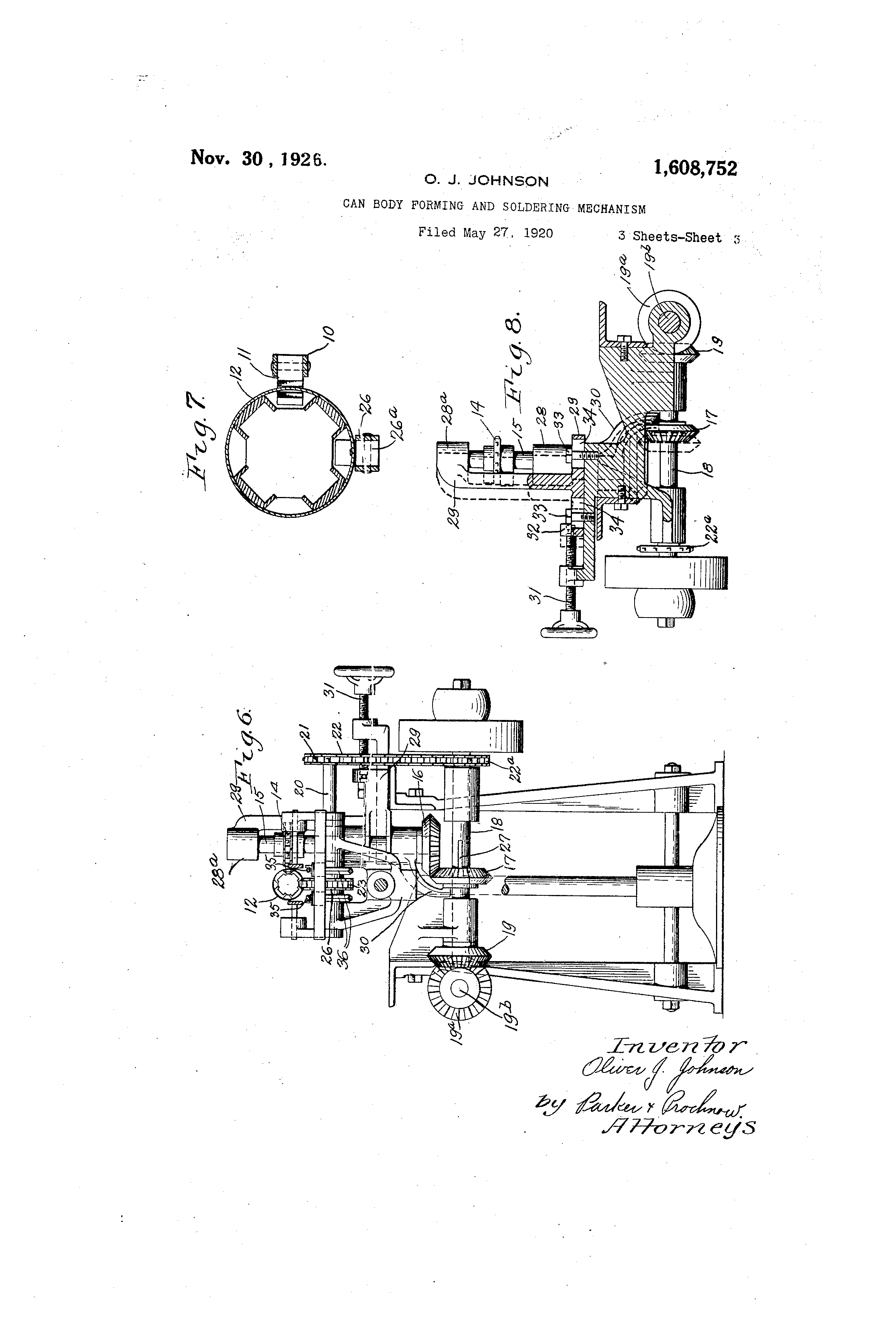 Patented Nov. 30, 1926. 196@0897'3-2 UNITED STATES PATENT OFFICE. OLIVER J. JOI-INSON, or, WF@E.FLING, VI-El,@@T VIRGINIA. CAN-BODY FORMING AND SOLDER@TI\TC-- TET,@CIIAITTSM. Applicati-on filed May 27,1920. Sei-ial No. This iiivention rel,,ites to can foriiaing mael-iines and pirticularly to ejector mech,,tnism for strippiiig or disengaging tl-ie foriiiecl c.ltn bodies from the conveyor wl-iieli moves tlieiii ,tloiig the forining M,,Lndrel Lnd solclering horn. This invention is adapted for -Lise Nvitli machii-ies having either insicle or outside t-vi)es of solclering horns. I.n son-ie can body forining mpchines, it 10 lits been roposecl t,o cai-ry t:@e formecl can p bodies along tl-ie solclerilig horii by means of ali endless cla,,tin conveyor equippecl ivi L siiitable can-eiioao,ino- luo-s -wl-iieh grip e Tn tl-ie oper,,tti6n T ecl(@,es of the boclies. 15 sliell m,,icliiiies, cli.ffic@-Lilties h,,ive been eiicoiii-iterecl in reiiioviiig 6r releising the c,,t-n bodies from the I-Li@,ys tfter they h,,tve passed along tli e solclering horn, -witho Lit cleiiting or cl,iiiiao-ino- the boclies. In tli,,tt type of con20 veyor ivlierein the caii I)oclies ai.T grippecl or lield to the coniteyor by re,,isoi! of the enuaoeniel-it of tlle ed;2@e of tl-ie ctii body in ,t slotted oi, recessed ILig, cltiriiig the progress of the soicleriii,o; and ivipin@,y ol-)erations tl-ie ecl.ge of 25 the c,,tii bocly is fore@cltio;l-itl-v into the Tecess of the lug, witl-i the resul@'tl-i,,tt -when the c,Ln is disengag-'ed from the conveyor by the known iiieiiis the edge of the bocly is liable to bendiiiu or c)jstortion. This c,,tlises defee3,0 tive cans later on -when the ends , ,tre ,tlDplied to tlie boclies. To overcome these objections I I)roiTicle nie,,Lns OI)eratin,,(x in coiajUDetioii i-,,ith conve,)Tors of tlie sort hereii@oefore discusse(-.1, wliereby the formed bocly is gently 36 i,eleasect from i,!-ie ctri-yidg I-Ligs, ihere'@y redticin.- tl-ie liability @f.d-,tn-iage or in]ury to the C,,tn boclies to a minimLim. The objects of tl-ie presei-it invention are to I)rovicle in appar,,ttt@s of the type set forth 40 @iliieh shall coiisist of few -parts, whiel'i sh@tll be iiiexpe,,isive to rnalntifa@ture, -which sl-l-,ill be .t-Litoinatic in oper,,ttio-n aiicl whicli shall operate to e:ffectively rele."e the can bodies f rom tl-ie convoyor without inj-Lirying the cans. With the ,ibove ancl ot-lier objects in view. mv iliveiition consists in certain T-eattires of st@ticti,tre, coinl)ination relatiol'i -wliieh will be i-noi-c ftilly set forth hereiliafter. "O I lillive illustraiecl oiie eiiibodiment of illy iiavention in t-lie accon-ipanyinq d@ra-wiiigs wherein: Fi.g. 1 is a side elevation of ,t portion ()f ,i can b6cly foi-naing machine --iliboclying tLe of appttrit-Lis of the @)resent inventioii. Fi-),. 2 is ,t top plaii vieA)T of- t-lie inacliiiie illiislrited iii Fi,g. 1. Fig. 3 is t sicle elevauion on -,in enlarged scile of 9, portioia of the caii conveyor and 1-ily iml)rove(:l ejectoi, or stripper. Fig. 4 is ,t vertie,,tl sectioii taken on lines 4---4, Fig. 1. Fig. 5 is i detail in plan of a portion o-r the chain conveyor sboiiina can bocly in dotted lines t-l-iereon. Fio,-. 6 is aii eiid elev,.ttion o@ the iiiael-iine. Fio-. 7 is i ti-ansverse vertical. see'Lion ZID t,,tkei-i on lliles 7-@', Fig 1, biit enl,,ii,ge(l. Fig. 8 is en on lines 8-8, I seet,,.oil tak Fig. 2. Referriii,(,- to tl-ie di@,,@wings wherein siiiiis lir ni-imeral denote like ch@ir,,tcters throtighoti'u tl-ie sevei-,@il views: For the pui@poses of illustration. I I-lave sli-oavn iny iii-iproi,ed device ,is USe-,l iD COII- 5 i-iecti.on ivitl-i ,t n-iachiniihich iiielucles lii eiicl.less cliaip coni,e-,yor 10 c,,irrying ,t pltirality of grooved or recessed dogs 11 e,,ich dog beiiig fixecl to a sin(rie, linl;-, or part of tl-ie ch,,i,n and -@vhich is tect to move the@ e,,tn go I)odi es 12 forilard o tll.e -f-o-_"Iner over the -- @ii-iiiing device, soldei@iii(, device tnd @Nipers, oii the hori-i or giiide 13, ti-ie o-i-ooves or recess es iii tl-,e dogs 11 l@roi,icfino- Telttively fixe d jti-vs betiveen Nvhiel-i the E@ clges of the 5 can I)odies are helcl qncl prevented froin turiiiii,--@ on tl-ie horia. I coi-isider it preferable to act-Li,-tte the caii conv eyor tncl iyiy improve(I ejector or stri.pI)er iiieans h@om tlae s,,tiiie sotil!c@e of powei-, f)o blit it is ),vithin t-l-ie coiit,einpl,,ttioii of my iiivention th,,tt these p,,trts m,,ty be operated s@- P,,tr,,ttelv i@t' desired. In the einbodiiiaeiit i.Ilus trated tlie@ conieyor el-iaiii is driveii - @',I-Lrotigh ill -0,,,ns of I spro("Ii:et wbeel 14 05 O', ilioti ntecl iip @i ci vei'tic,,il sha-ft 15. The sliaft 15 is provided at its loiver end Avith ,t bevel Ye ar 16, i@,liicl-i iii t-iirn is driven by ,t beltel ge, ir 17 c,,trried by tl-ie tr,,insverse sl-iaft 18, This @ti,,tft i,i-iay be tetLi, tted by any suitable ioo iiie,,iiis, slieh @ts by ,t bevel gear 19 in engageiiient Nvitli a bevel Q-etr 19@ carried by the ir,,tin 1)oiver sliaft 191, o-F the m,,tcliiiie. A tr,,i,nvei@se sliat't 20 is ino-LinLecl -@bove the sb,),Tt IS ai-id tlii-s -,,irries a sprocl@et io5 21 di-iven 13Y ineiiis of @l slit,,tble (,Ii,,tin 2@9 froiii @i spoel@et 22a fi@@,e,-l to tlip. -,haft 18. A sl)o,elet whe,-,l 9-3 is moiinted on tl-ie sliaft 20 this ].asC ii,,ti-ticcl ivlieel (@oopel-atilllg with a seconcl sprocl@et 24 siipported iao