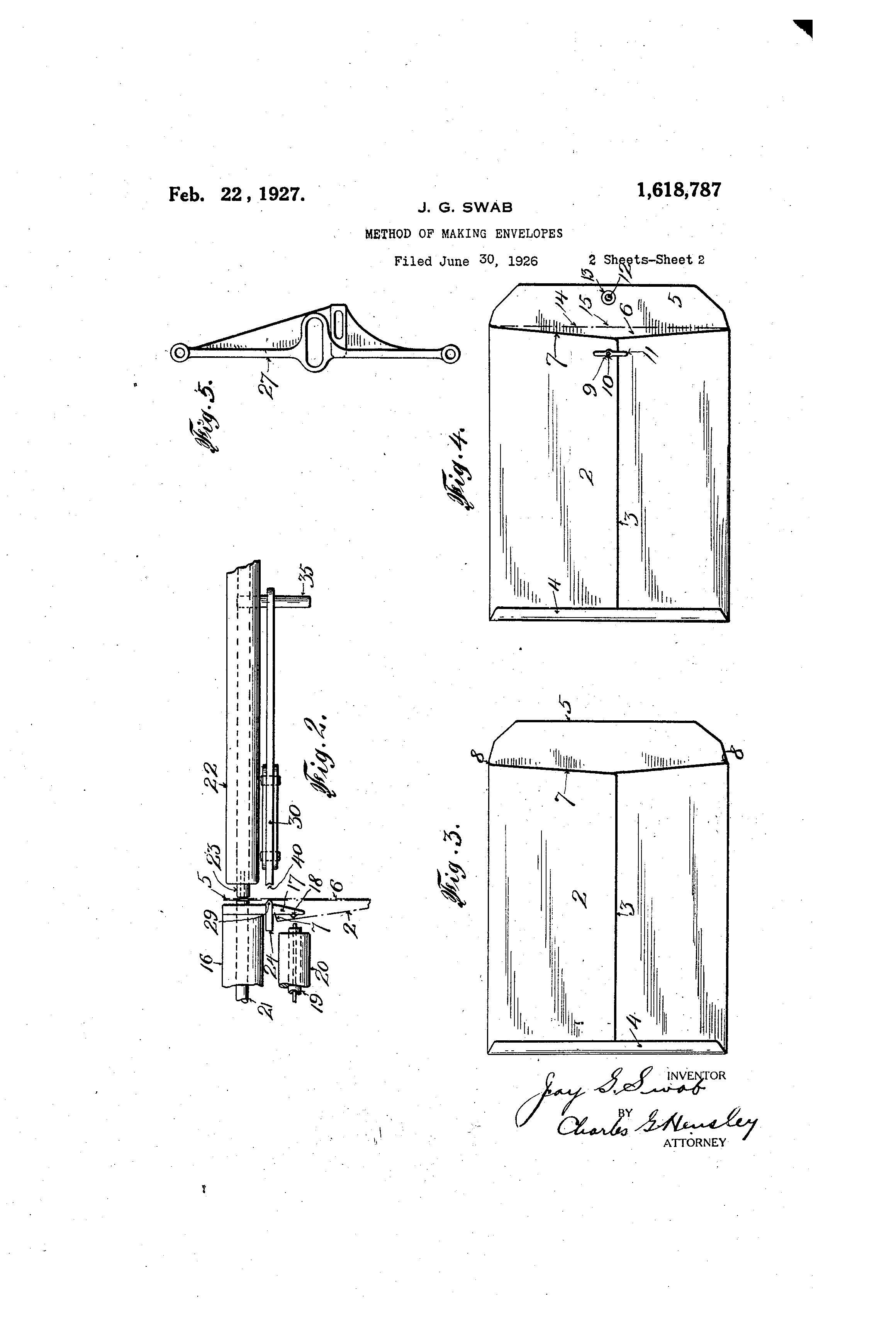 tlie- ti p eye- a eiease e fla)p i.s adapted to be leati of the f astener or of the on which th ic@t, i@it I)i,efet,abl3, siiiiiiltaiieousl3T ia,itli botli fol(led. siiiiultaiieouslv with the attachment 2il opc-i-.ILtioiis, it is possible to I)osition of tlie'fasteiiini2@ m(@ai;,@ to the envelopc-. the er(,,ise -Niitli such acei.tracy that iviieii the 2. .8- iiietlio(f'ol' the class (.Ieseribed whicli lllap is fol(led oii this creas@ the evelet aiid coiisists of tpl)lyijig closiiit)- liaeaiis 'o one )vill alin-, - i)-s re-istei,. Tfie ol)era- )vall @ixid to ttie flap of III el@illClol)e, 'a'nd iii tion is so depeiidable that i.t is unnecessar-3, foi,min(, a ei,ease oil wbieli tlic, flap is @idapt- 3o to inspect or exaiiiine the product for tlle ed fo be fol(led, 11711ile tlle flilp elll,'elope positioii of the crease lille tis this is a @ged l@)3r rrieaiis )ttssil-lg tl-ii,oii,)-ii the .), s ai-e clig@ 10 aectirateli- positioi)ed uiidei- U@iy itietlio It of tiie eiii,elop(,, ii i s@iid Illip. A vi ll b e, u n d e rs to o d th at ot h e r m e c h, .i ni s m 3. -k in et h o d of - th (, cl a ss d e s ci .i b e cl w lii e h tli ai i th at . d e s c ri b e d li e r ei ]] L m a y b e u s e d in c o n si st s of a p pl .), iii (- r a l @ a st ei ie r to th e - ,v al l of 3 r) -ai,i-yiiig otit the m tliod, the principl of i. U e c n envelope, sliyiult,@iii(@o sly ftpp]37ilIg eyelet w lii e h r e si d e s in th e fo r m ,,t ti o n of th e fl a p ni e a n s to th e fl a p of th e ei ii, el o p e, ai i( I sii n ul - 15 crease silliultincolls][y ii,itli the attaclinient tineousil, til(@l.@eivitli i@ol-li@)iiig a elva,,,e, on of tlle fasteiier or the e-,yelet, or witli both of vliieli tlle flap is t(ltt)ted N to be folded, L-aid these opeiations, or at. least wliile the envecreas4e@, I)ein@,,, disposed iikidway LetNi,eop. the 40 ,tnd eyelet. 11 r lope islield at tne fasteiier ce ter of sild iiieilis ti@ie ceiill,iving described my invention, ivhat I ter of said eyelet iiieanq,. 20 Cl aiM iS Si ed this lotli dtiy of Jtine, 1926 It t-he 911 1. A iiietliod of tlle cliaracter described city, cotinty aiid State'of New York. wliicli consists of appl3riiig f,isteniii(-, ineans to all envelope haviiil, a flap, and in Yoriiiing TAY G. SWAB